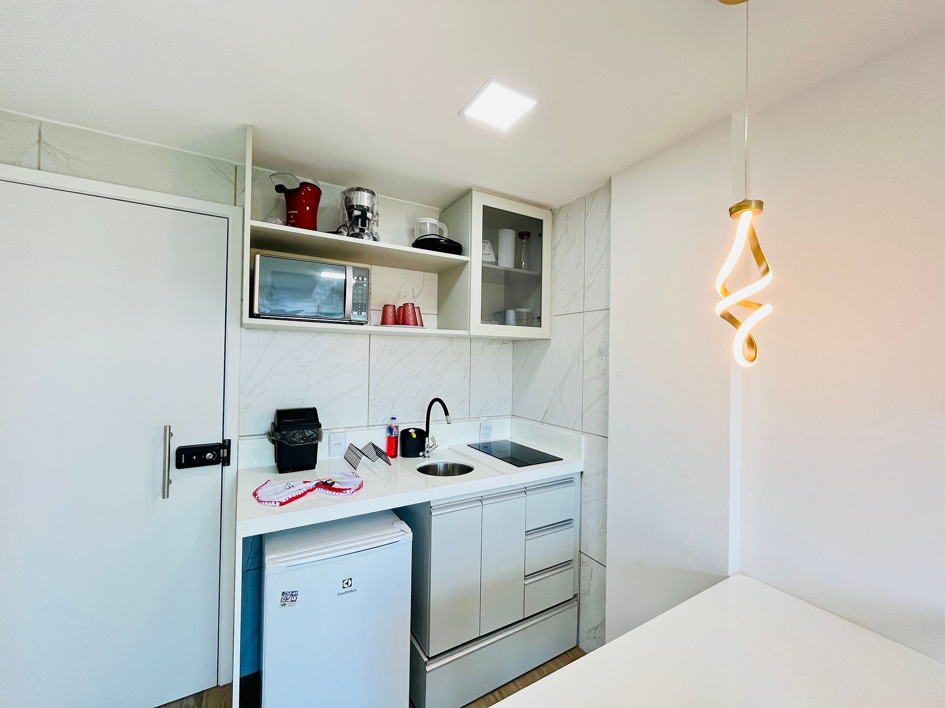 - Cozinha equipada com geladeira, micro-ondas, cooktop elétrico, cafeteira, sanduicheira, liquidificador, pipoqueira e utensílios diversos