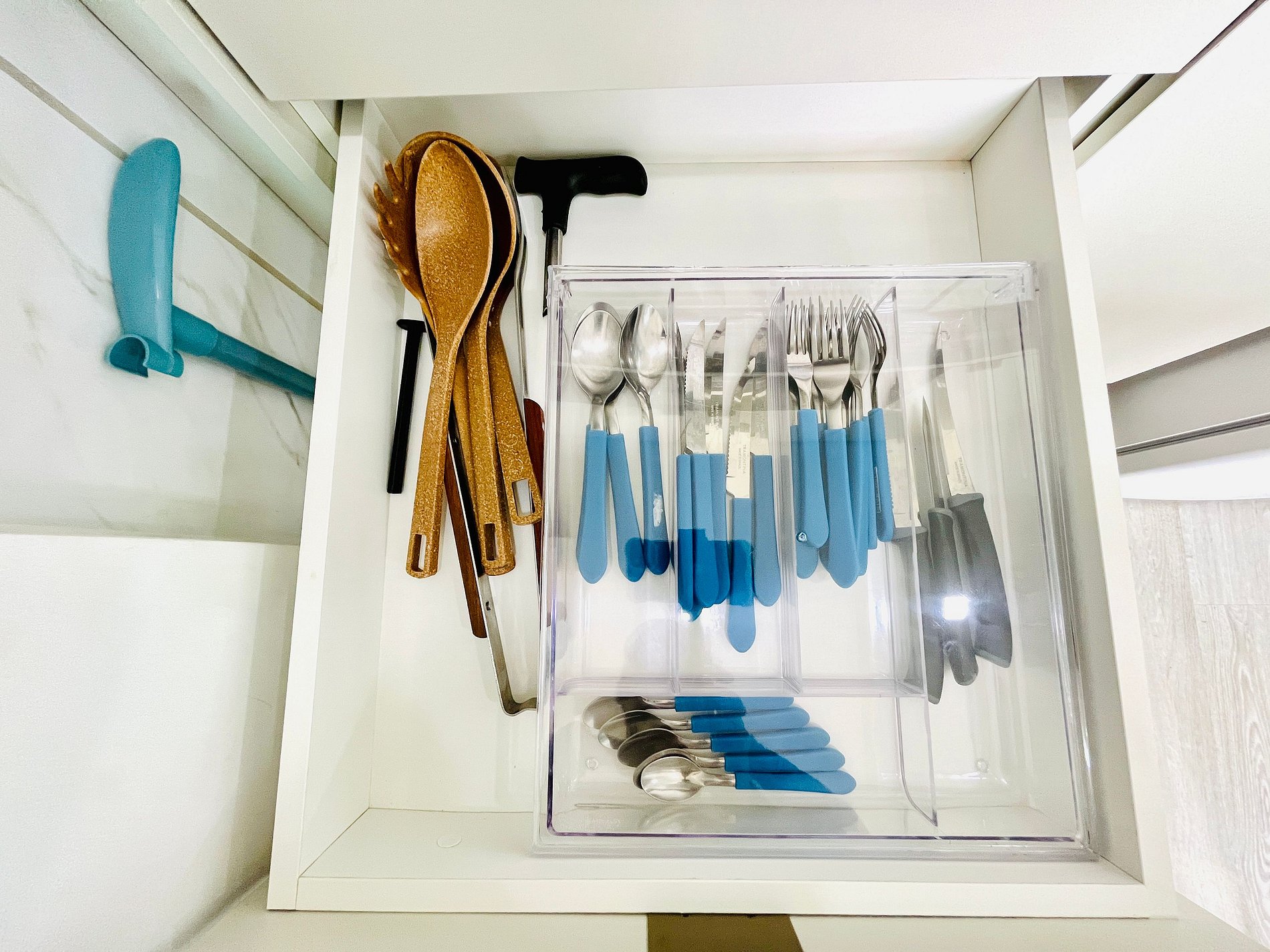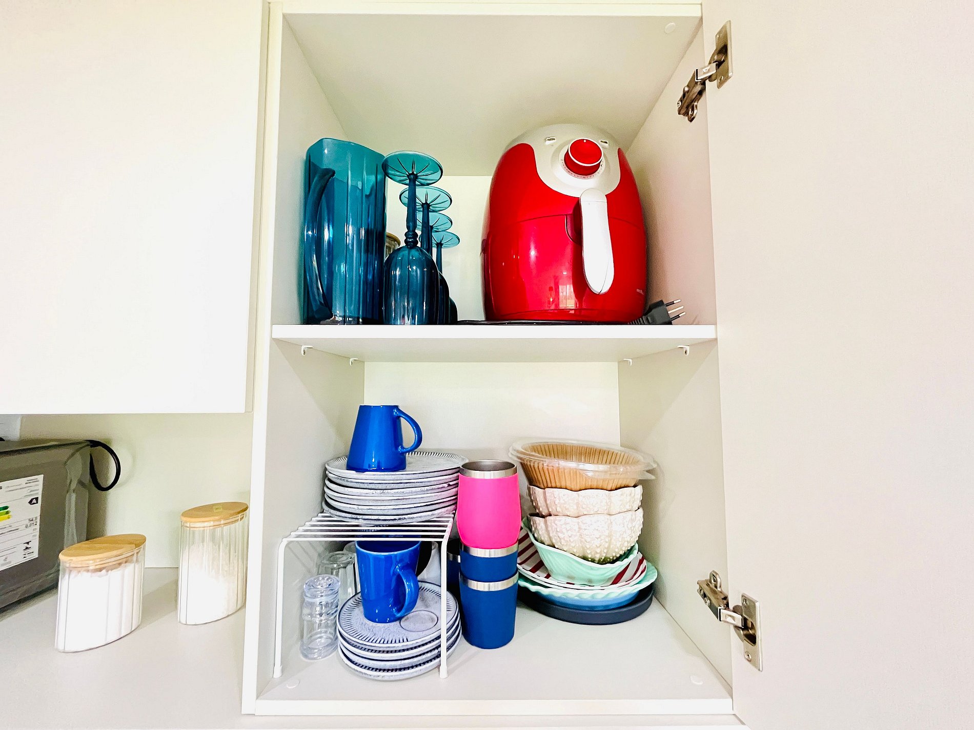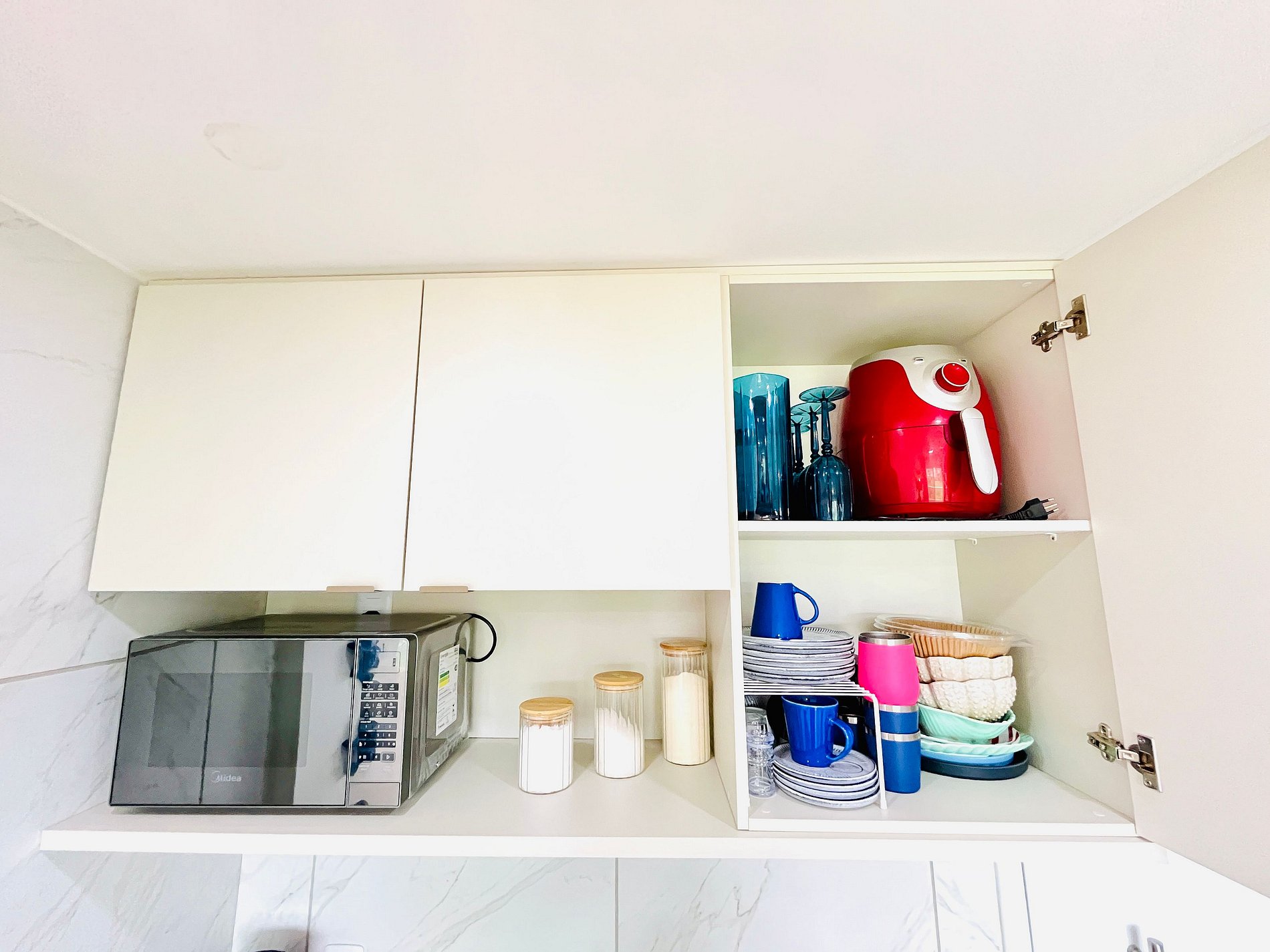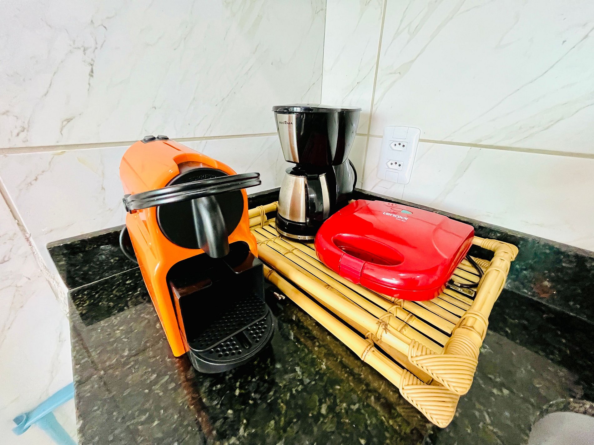 - Cozinha equipada com geladeira, micro-ondas, cooktop elétrico, cafeteira, airfry, sanduicheira e utensílios diversos