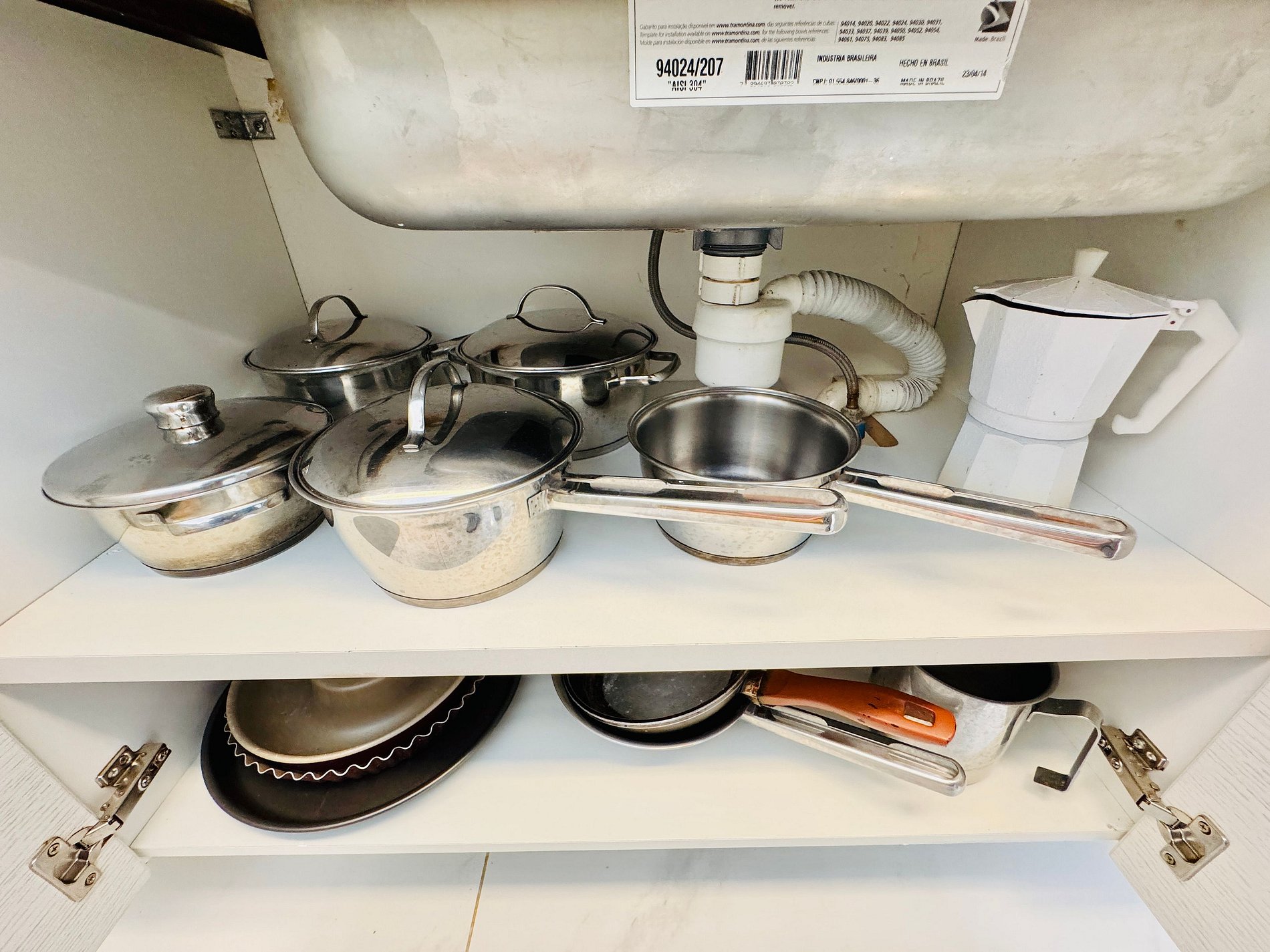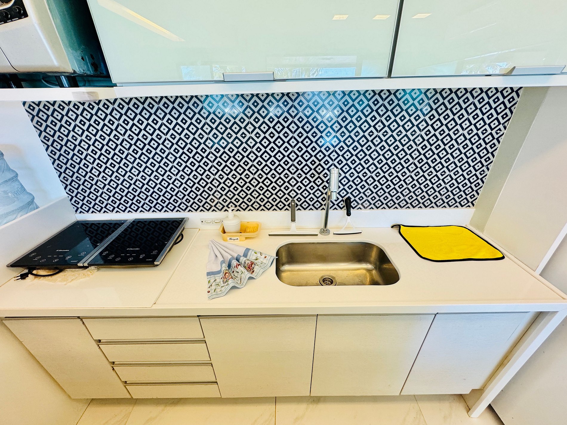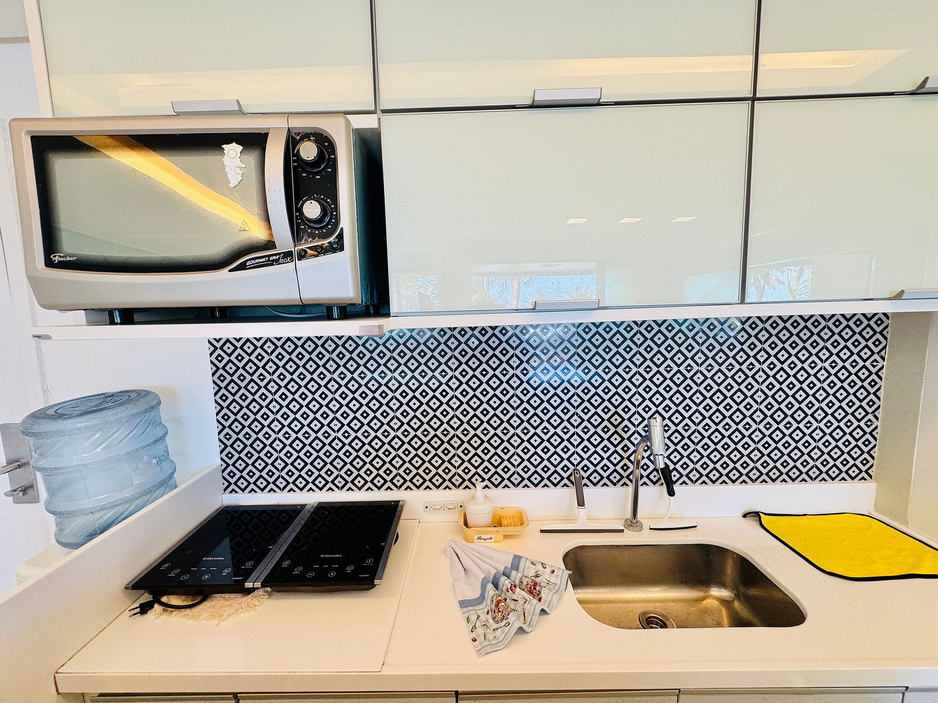 - Cozinha equipada com geladeira, micro-ondas, cooktop elétrico, cafeteira italiana, liquidificador e utensílios diversos