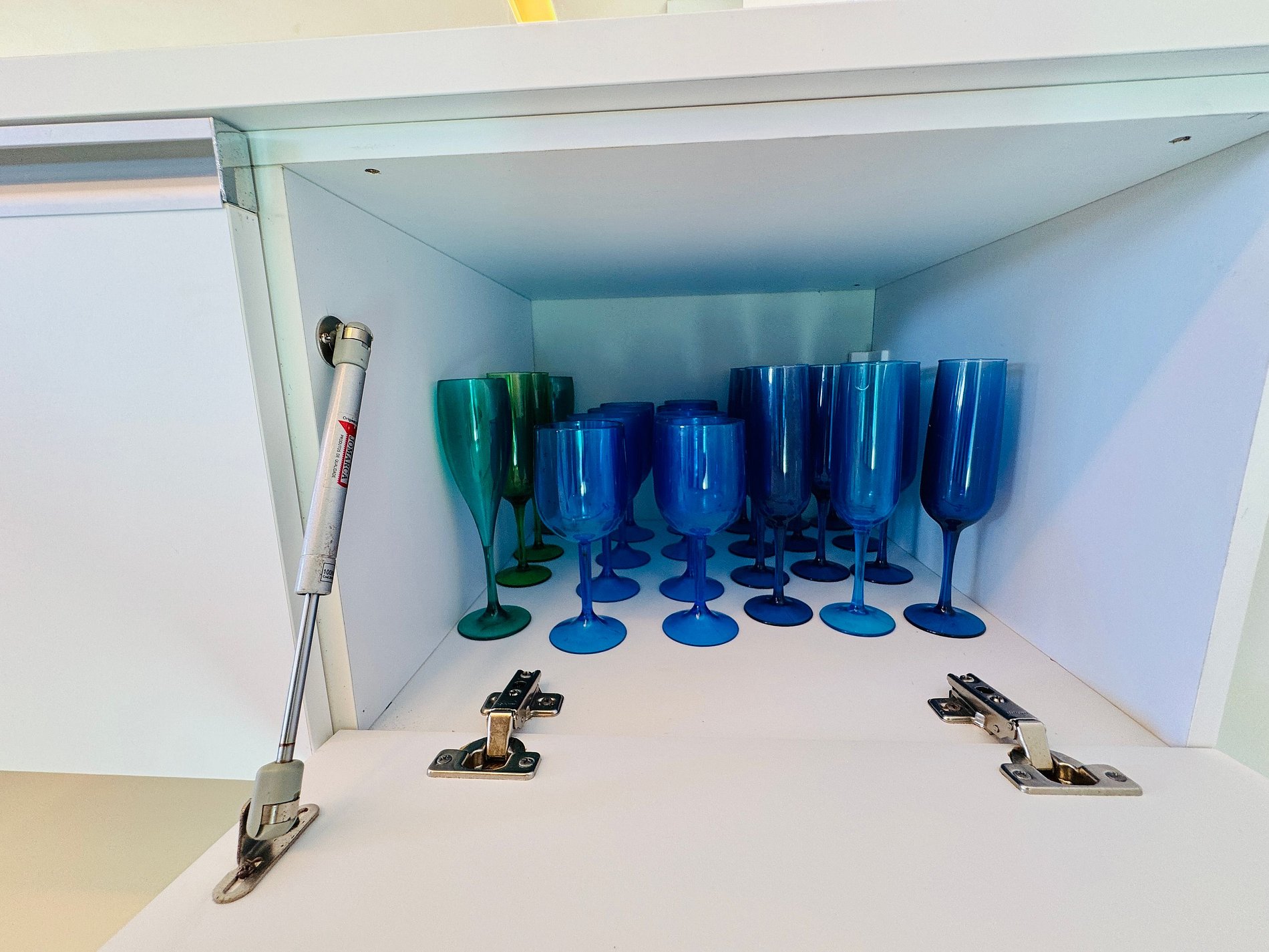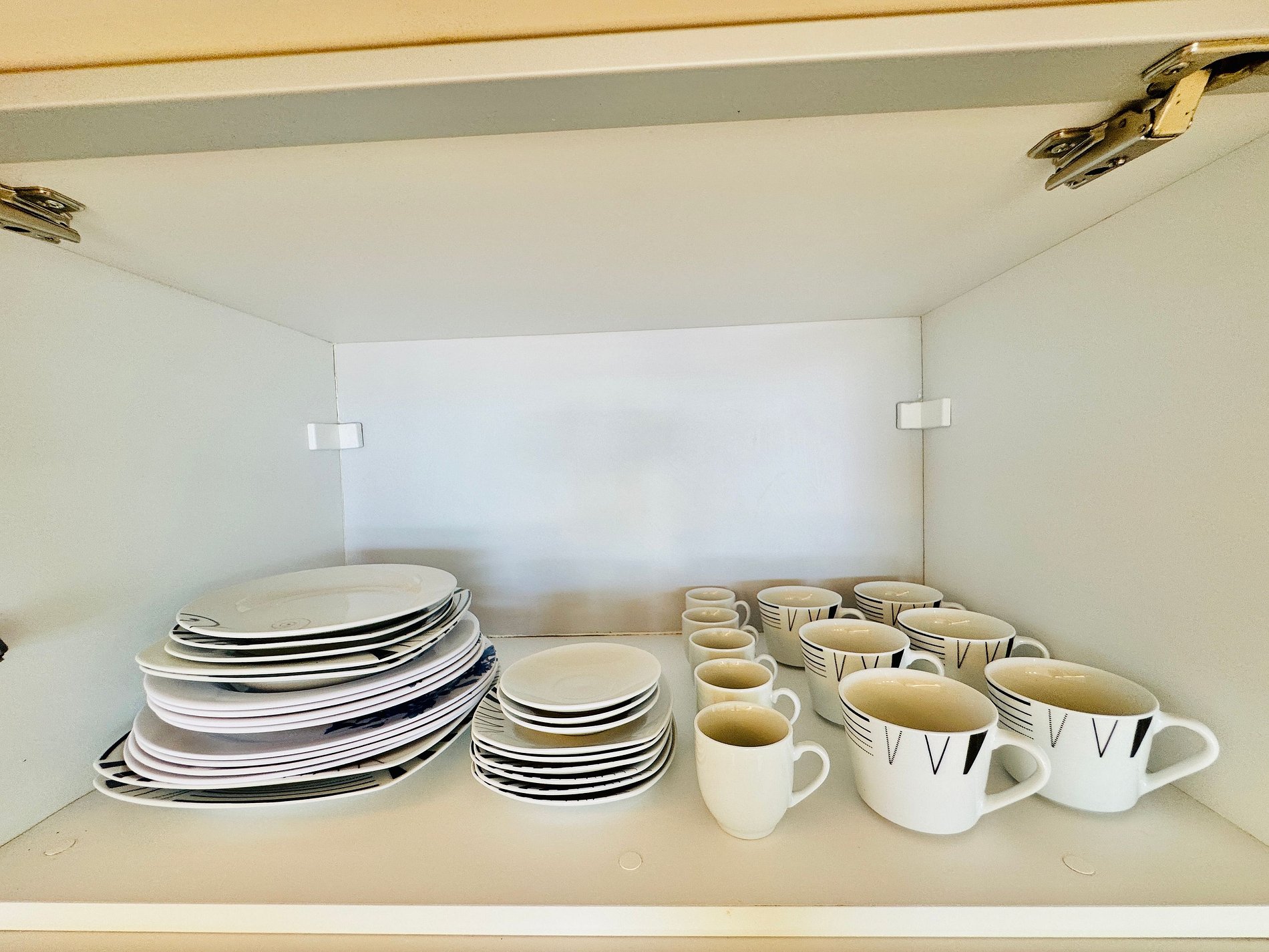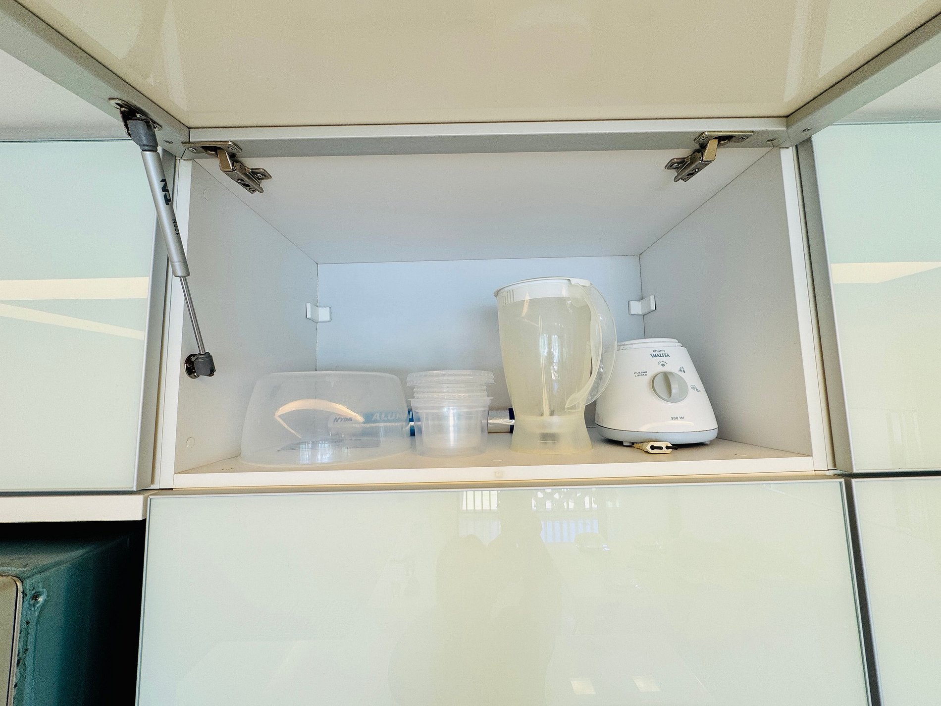 - Cozinha equipada com geladeira, micro-ondas, cooktop elétrico, cafeteira italiana, liquidificador e utensílios diversos