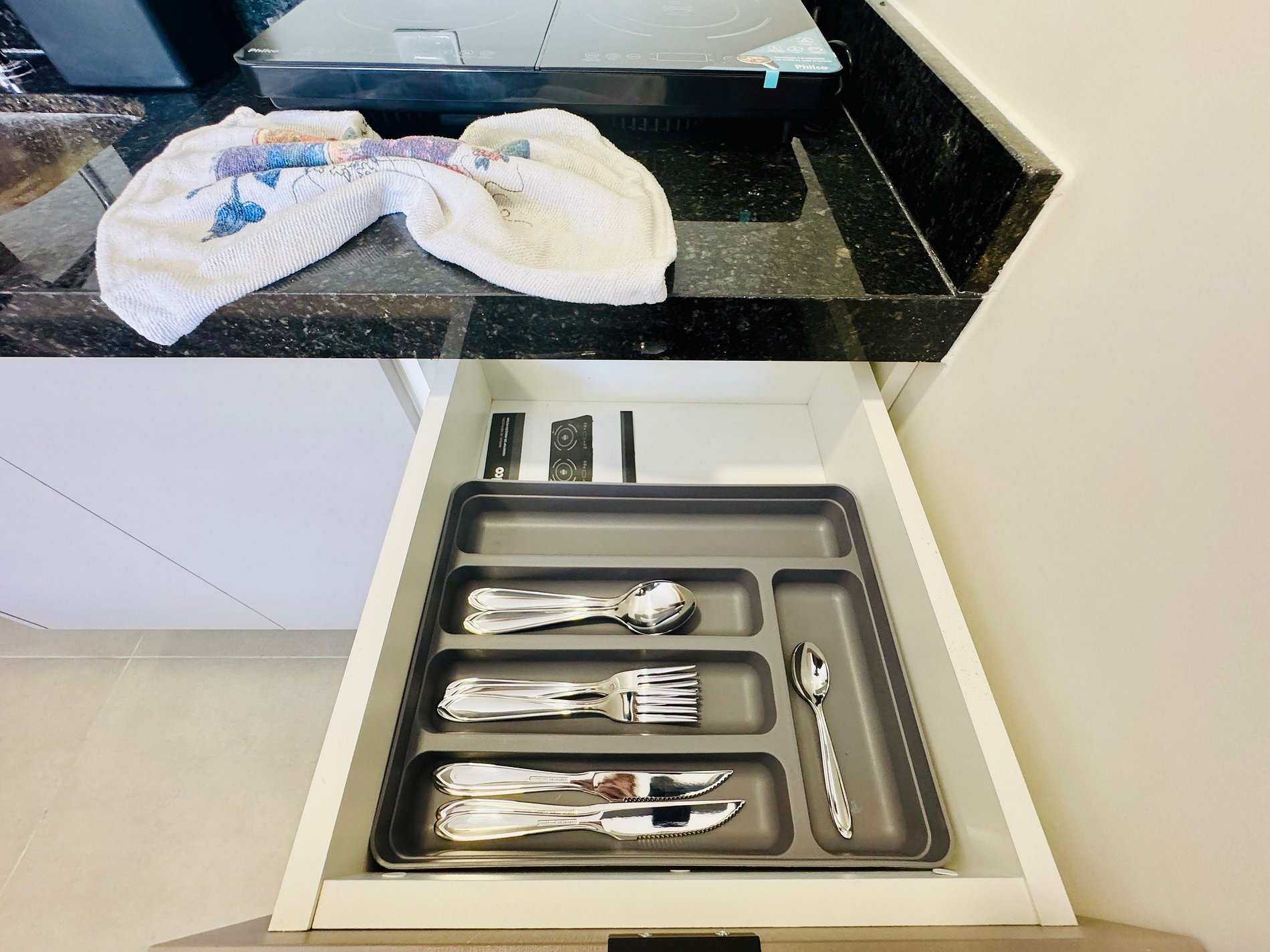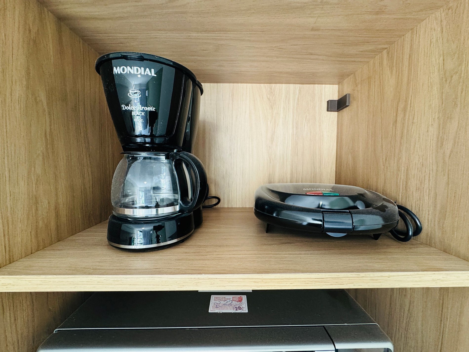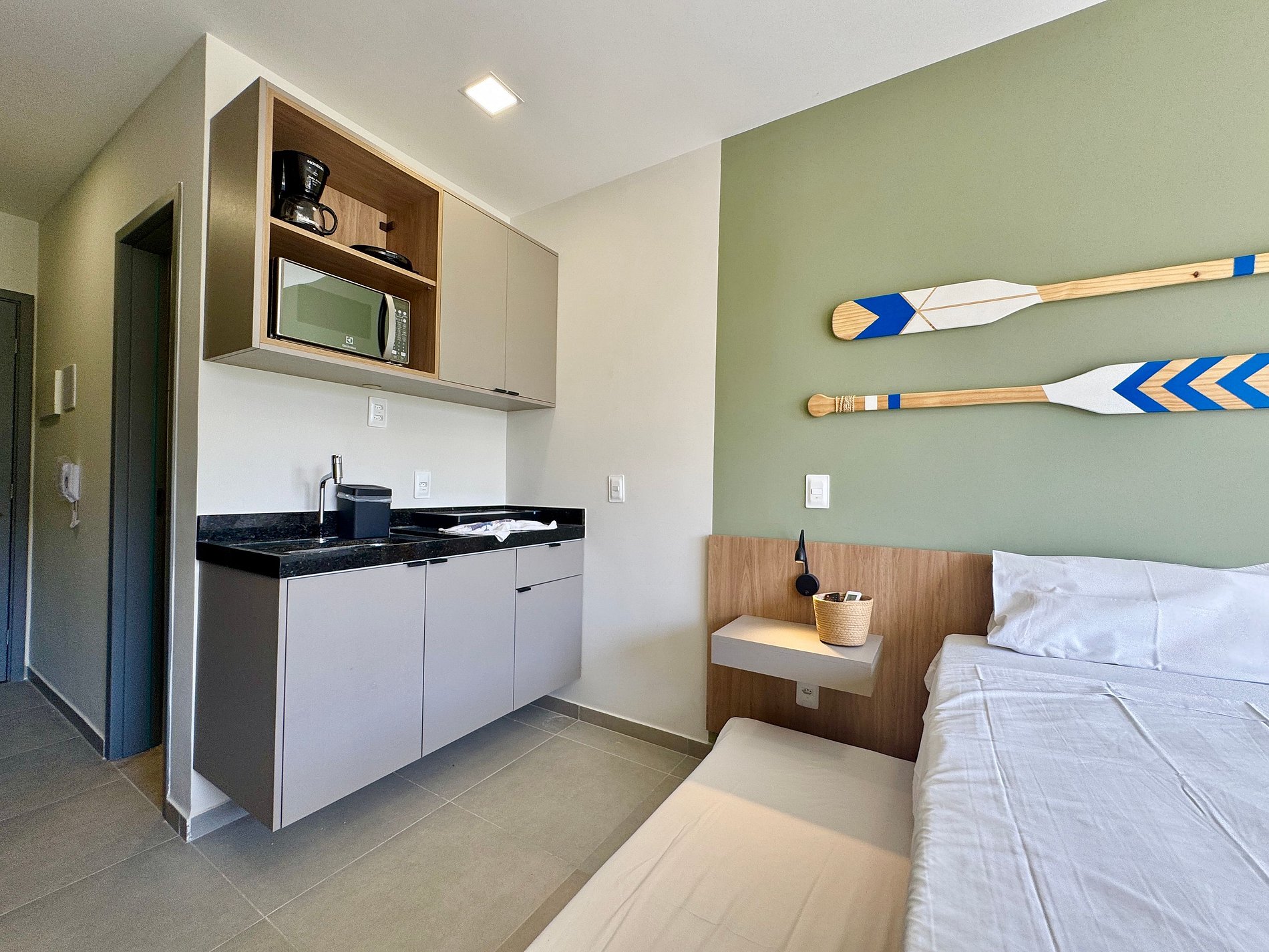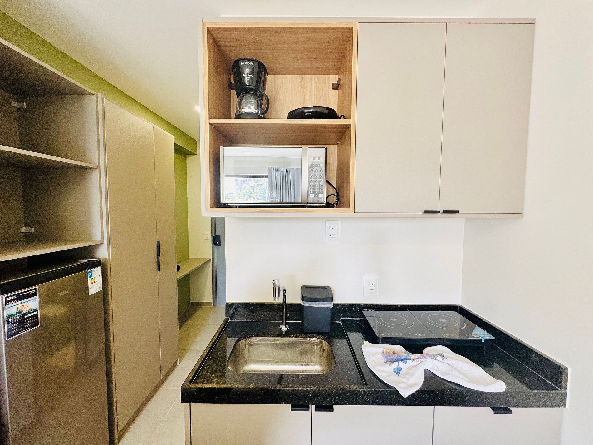 - Cozinha equipada com geladeira, micro-ondas, cooktop elétrico, cafeteira, sanduicheira e utensílios diversos