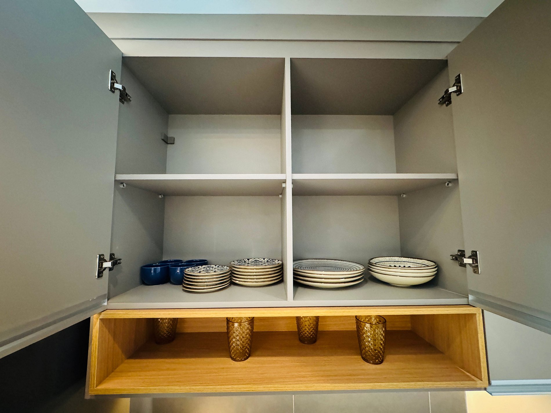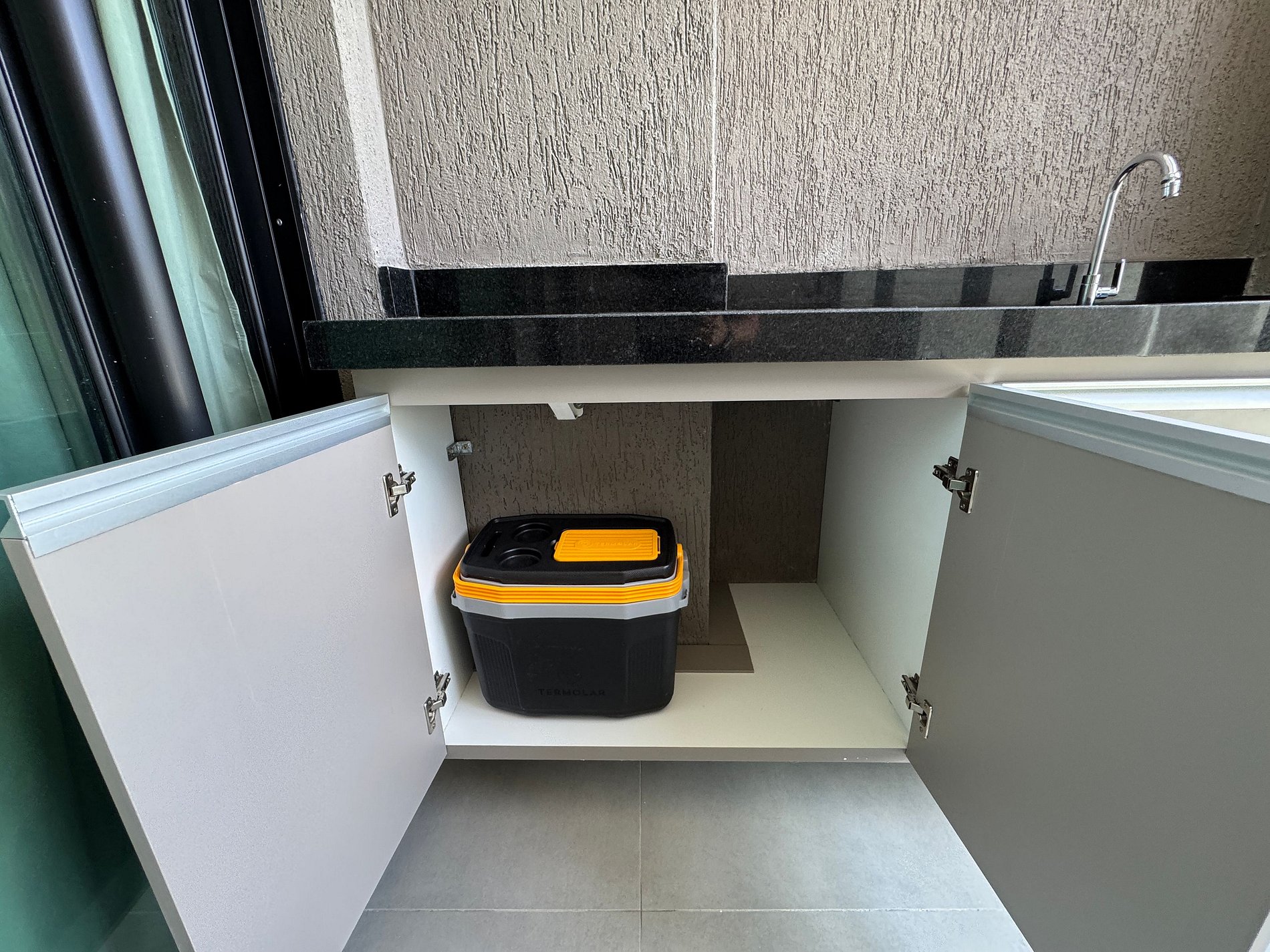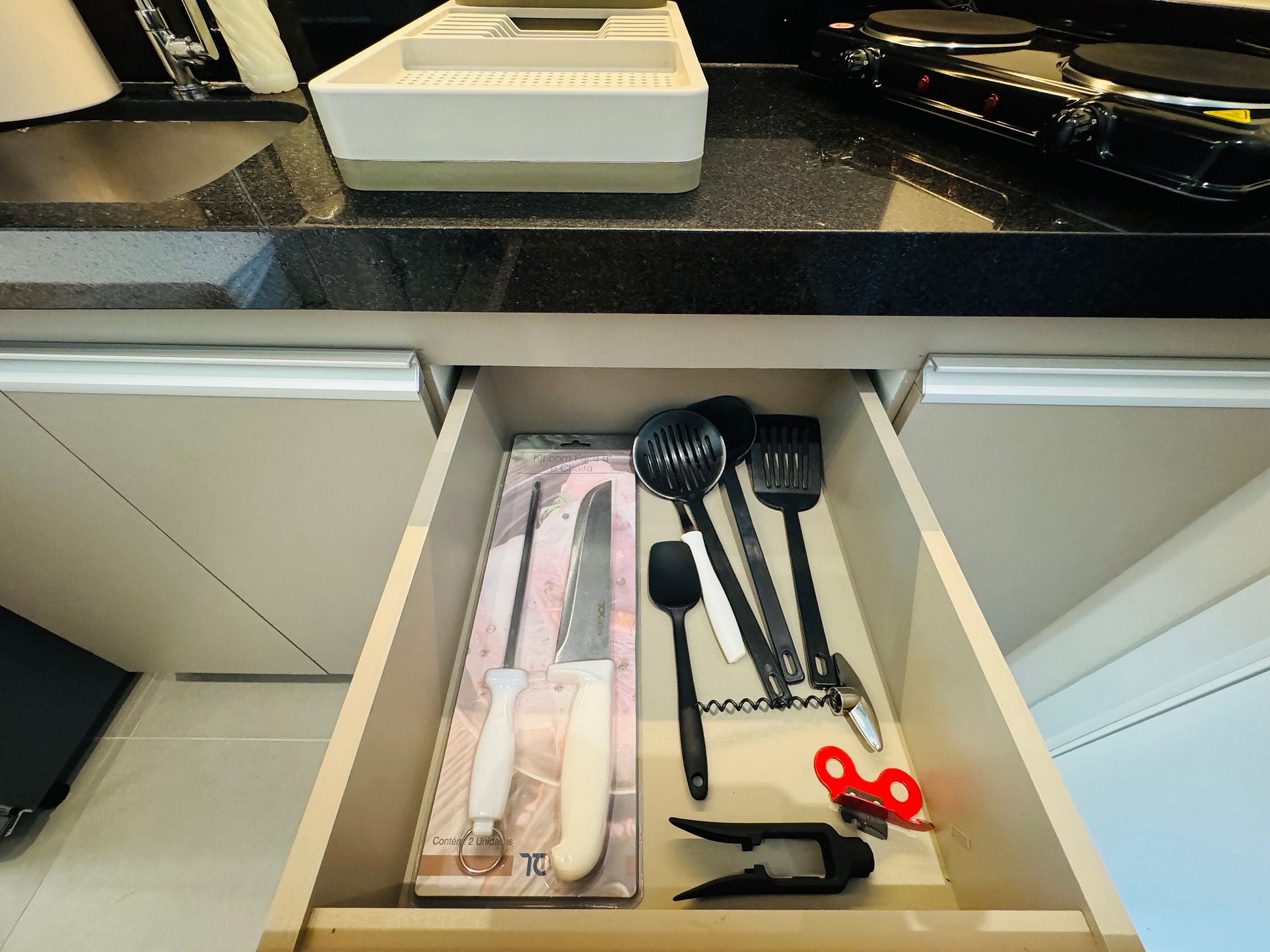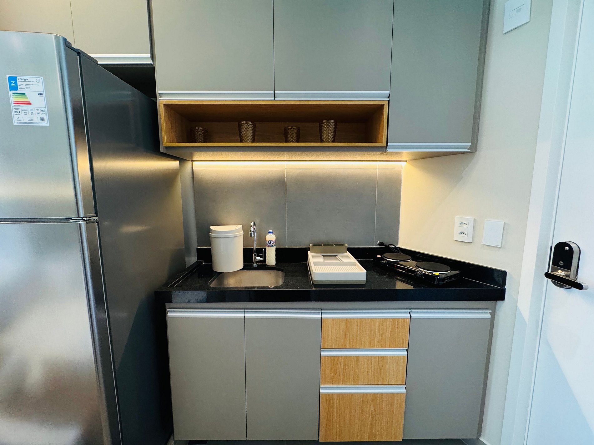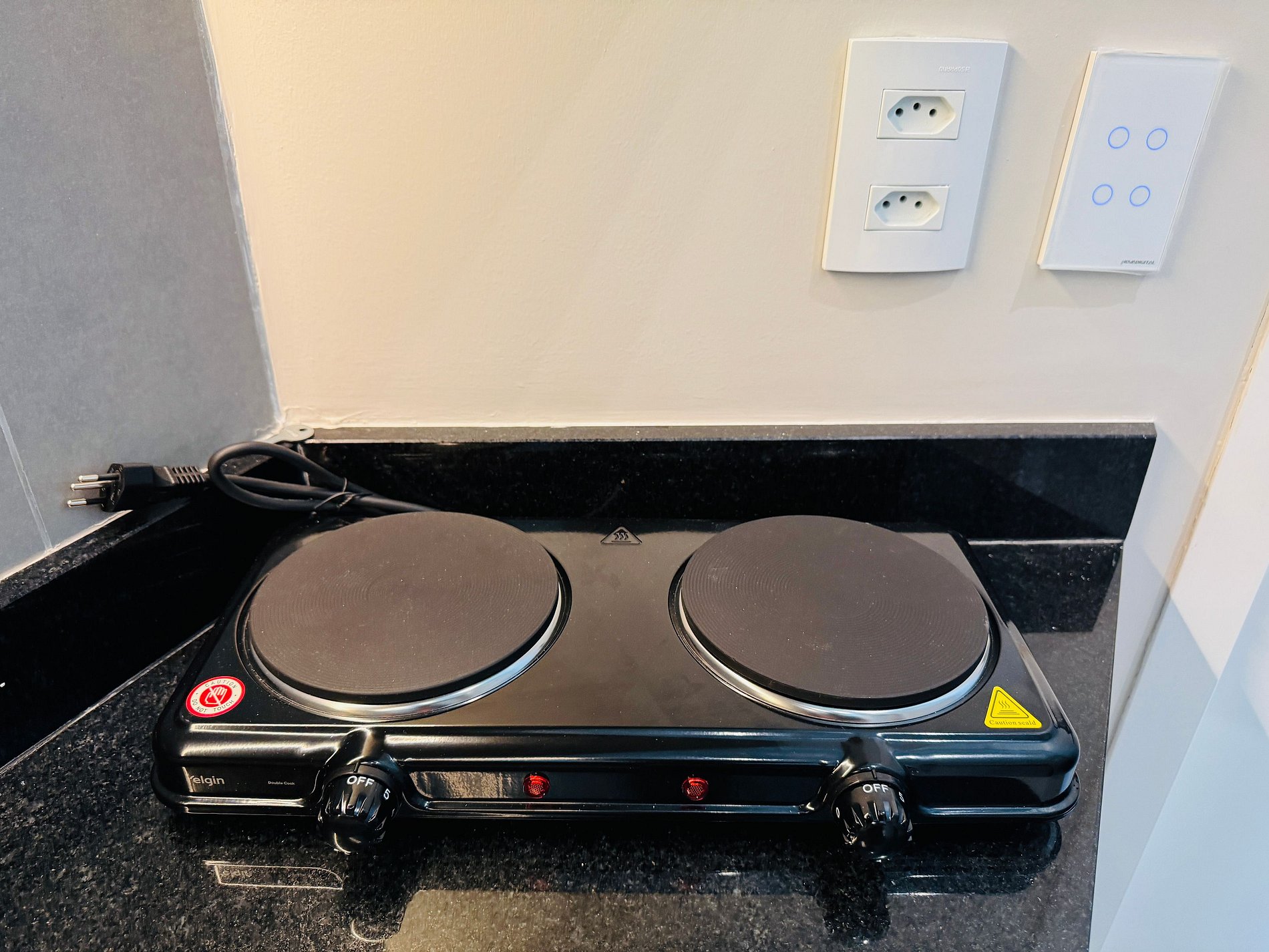 - Cozinha equipada com geladeira, cooktop elétrico, cafeteira, sanduicheira, liquidificador e utensílios diversos