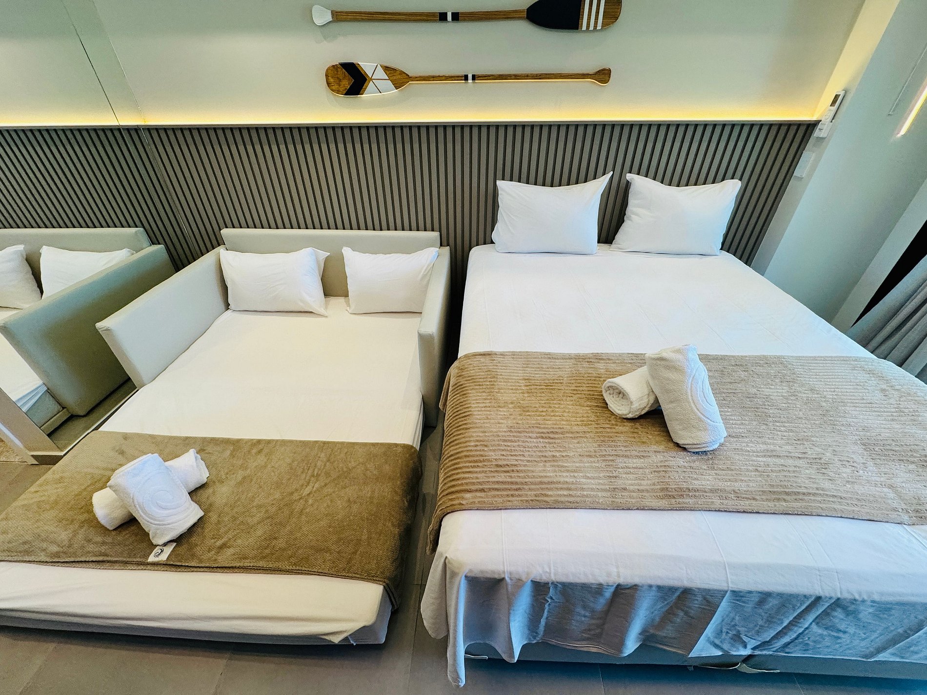 - 1 quarto com cama de casal (2 hóspedes) e bicama de solteiro (1 hóspede)