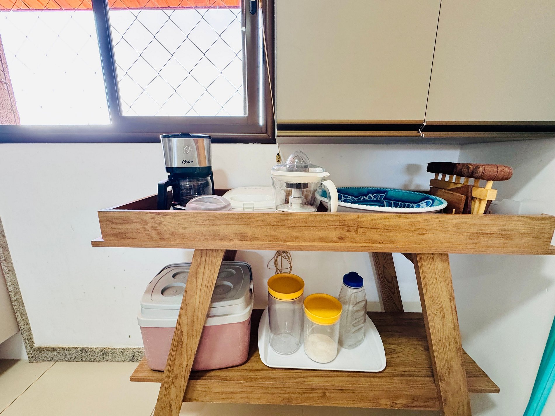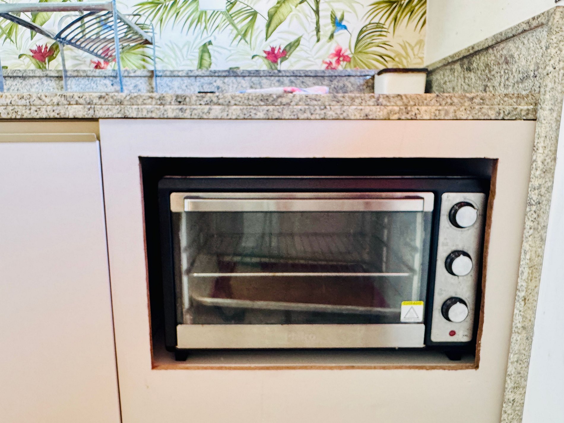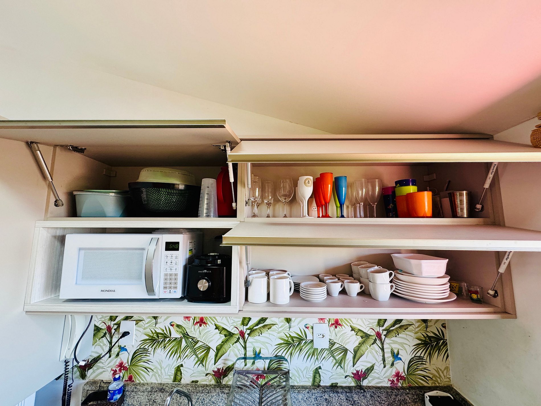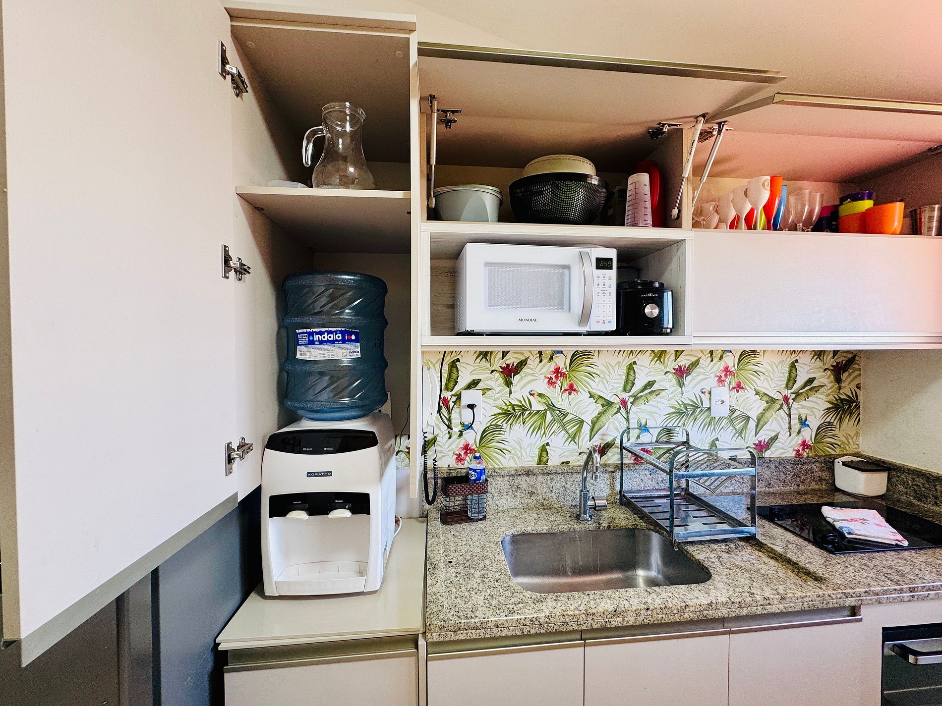- Cozinha equipada com geladeira, micro-ondas, fogão com forno, cafeteira, liquidificador, sanduicheira, filtro de água (reposição do garrafão feita pelo hóspede) e utensílios diversos;