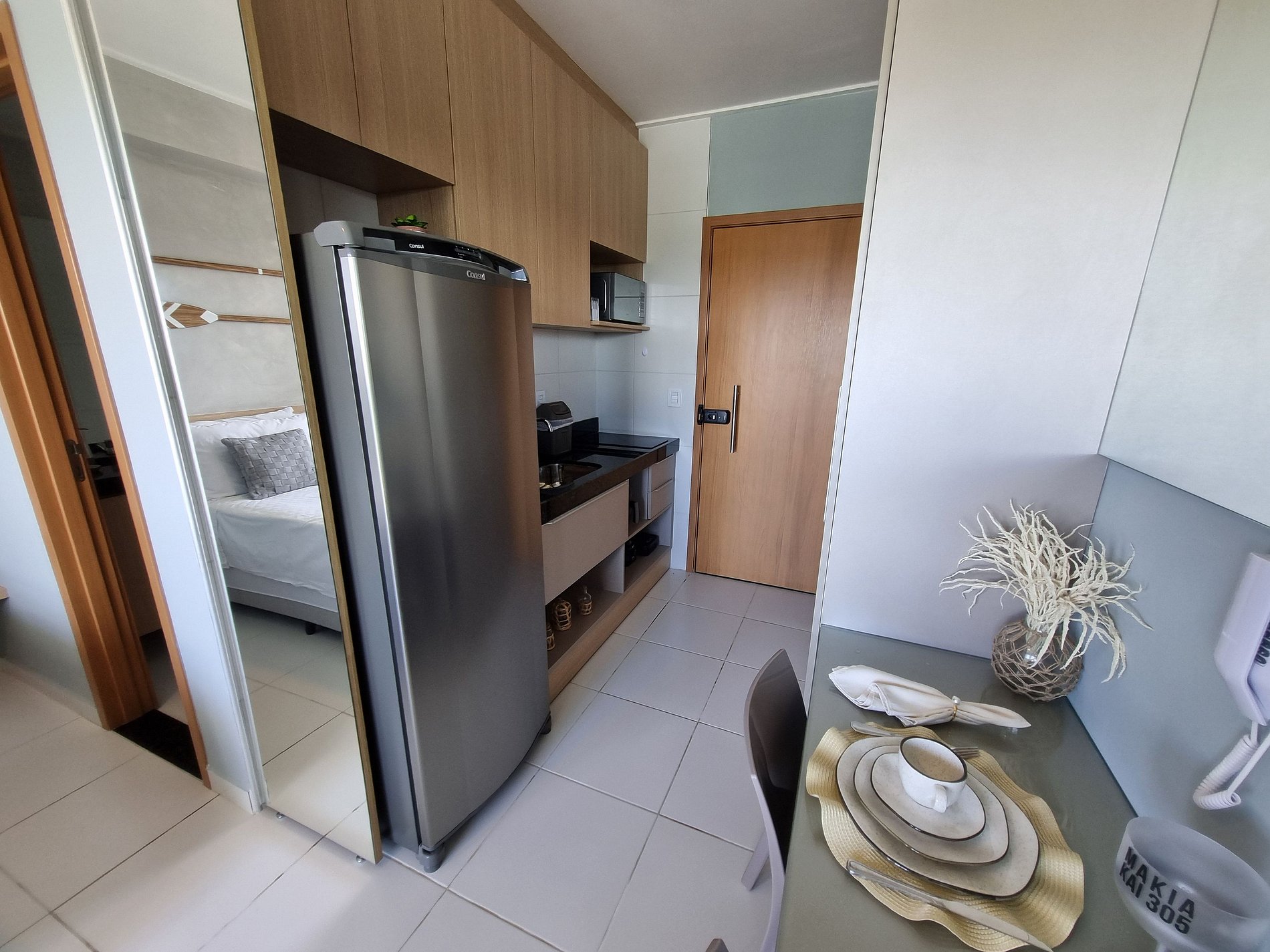 - Configuração: Flat tipo estúdio; 1 cama de casal com bicama de solteiro; 1 Sofá-cama de casal na sala; WC privativo, Mesa para refeições com 2 lugares; Cozinha compacta; Varanda com mesa e 4 cadeiras.