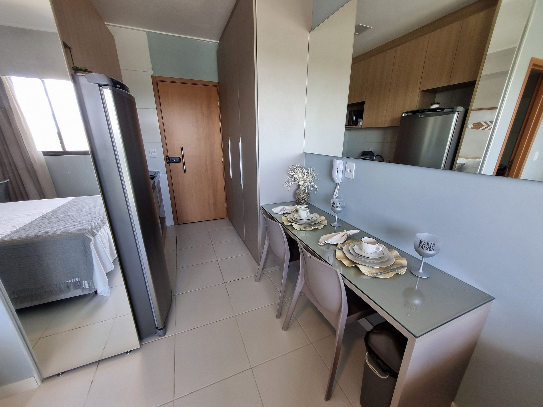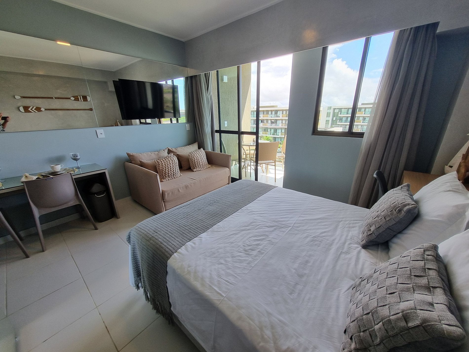 - Configuração: Flat tipo estúdio; 1 cama de casal com bicama de solteiro; 1 Sofá-cama de casal na sala; WC privativo, Mesa para refeições com 2 lugares; Cozinha compacta; Varanda com mesa e 4 cadeiras.