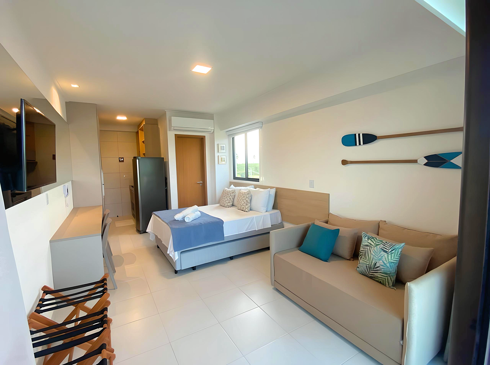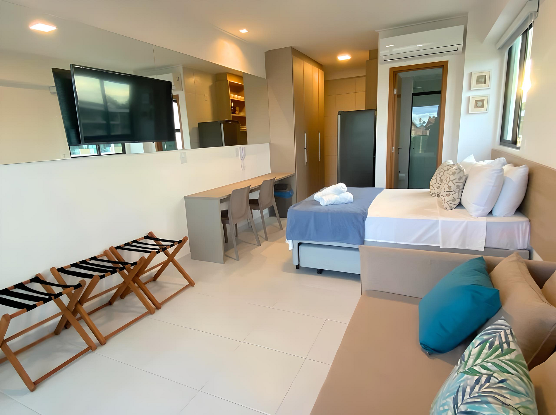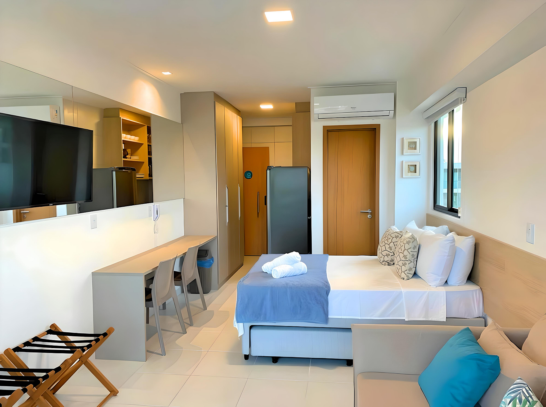 - Configuração: Flat tipo estúdio; 1 cama de casal com bicama de solteiro; 1 Sofá-cama de casal na sala; WC privativo, Mesa para refeições com 2 lugares; Cozinha compacta; Varanda com mesa e 3 cadeiras.