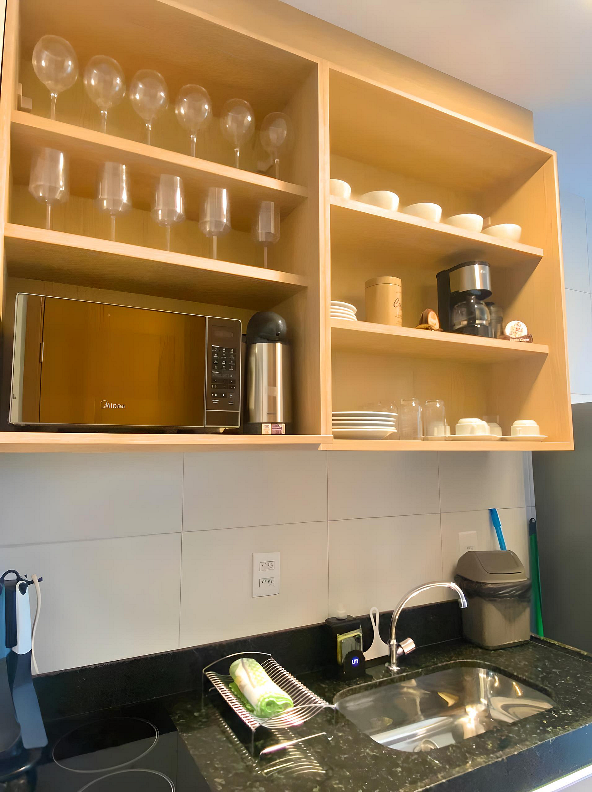 - Cozinha / Copa: Geladeira, cooktop elétrico, micro-ondas, airfry, sanduicheira, liquidificador, cafeteira, panelas, pratos, copos, talheres e utensílios diversos