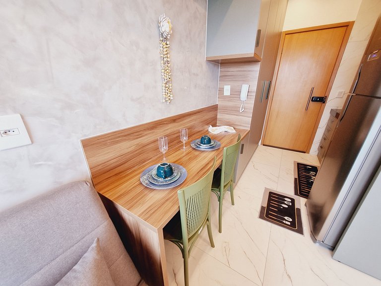 - Configuração: Flat tipo estúdio; 1 cama de casal; 1 Sofá-cama de casal na sala; WC privativo, Mesa para refeições com 2 lugares; Cozinha compacta; Varanda com mesa e 2 cadeiras.