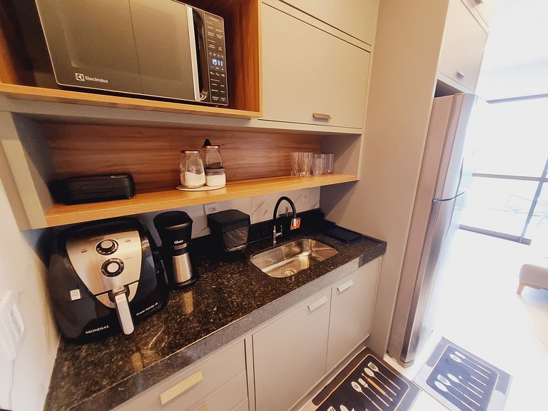 - Cozinha / Copa: Geladeira, cooktop elétrico, micro-ondas, airfry, sanduicheira, liquidificador, cafeteira, panelas, pratos, copos, talheres e utensílios diversos