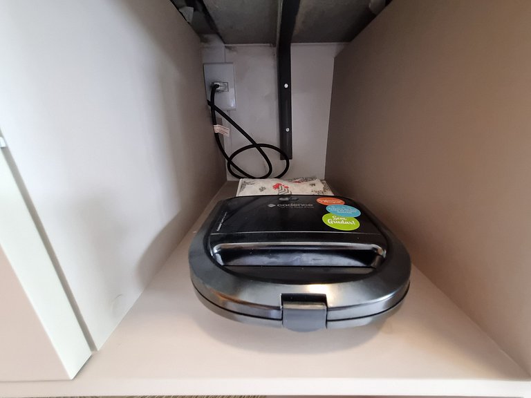 - Cozinha / Copa: Geladeira, cooktop elétrico, micro-ondas, airfry, sanduicheira, liquidificador, cafeteira, panelas, pratos, copos, talheres e utensílios diversos