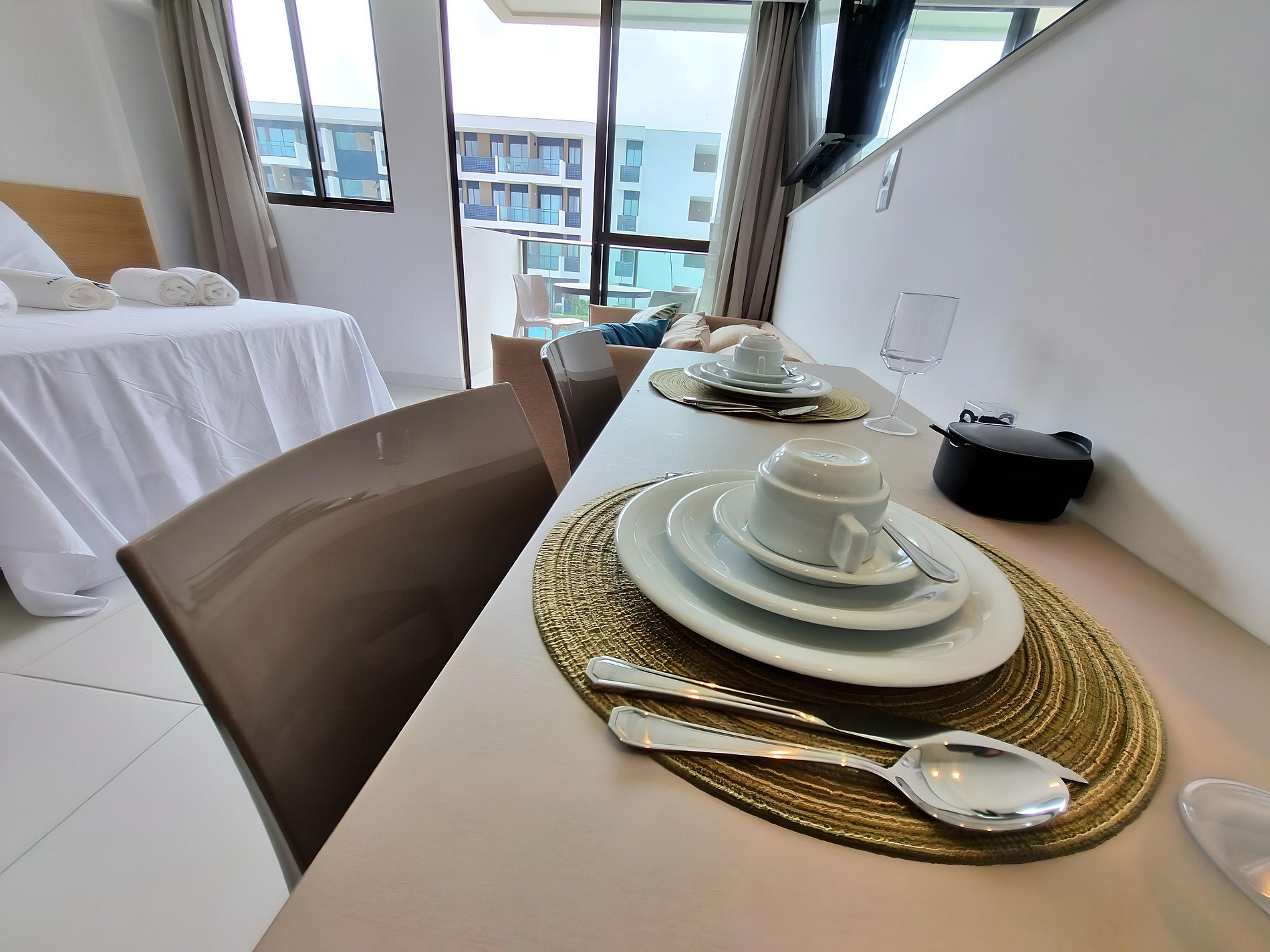 - Configuração: Flat tipo estúdio; 1 cama de casal com bicama de solteiro; 1 Sofá-cama de casal na sala; WC privativo, Mesa para refeições com 2 lugares; Cozinha compacta; Varanda com mesa e 3 cadeiras.