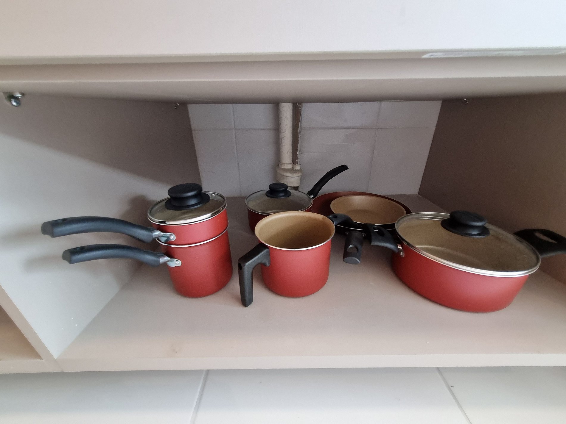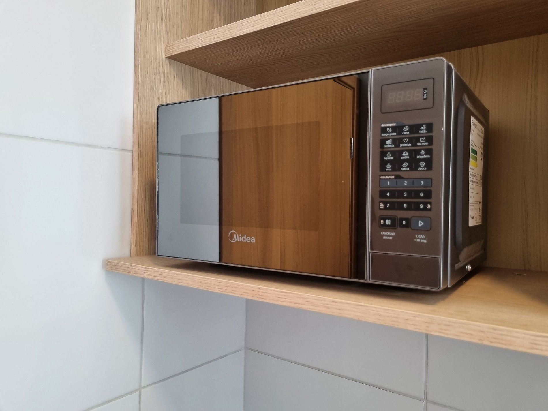 - Cozinha / Copa: Geladeira, cooktop elétrico, micro-ondas, airfry, sanduicheira, liquidificador, cafeteira, panelas, pratos, copos, talheres e utensílios diversos
