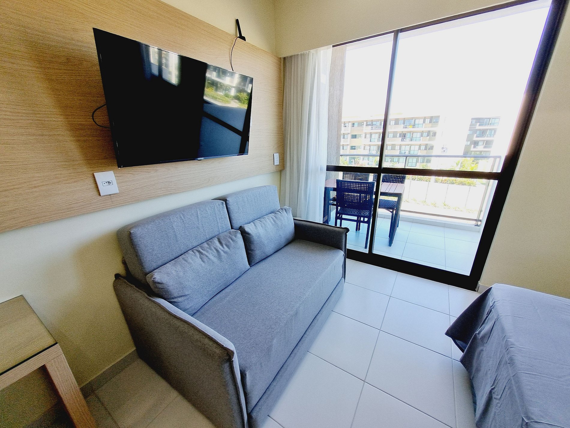 - Configuração: Flat tipo estúdio; 1 cama de casal com bicama de solteiro; 1 Sofá-cama de casal na sala; WC privativo, Mesa para refeições com 2 lugares; Cozinha compacta; Varanda com mesa e 3 cadeiras.