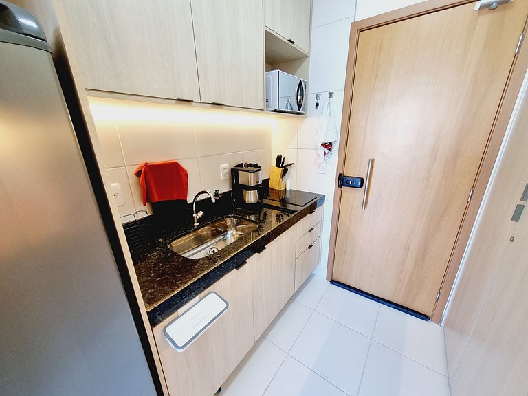 - Cozinha / Copa: Geladeira, cooktop elétrico, micro-ondas, airfry, sanduicheira, liquidificador, cafeteira, panelas, pratos, copos, talheres e utensílios diversos