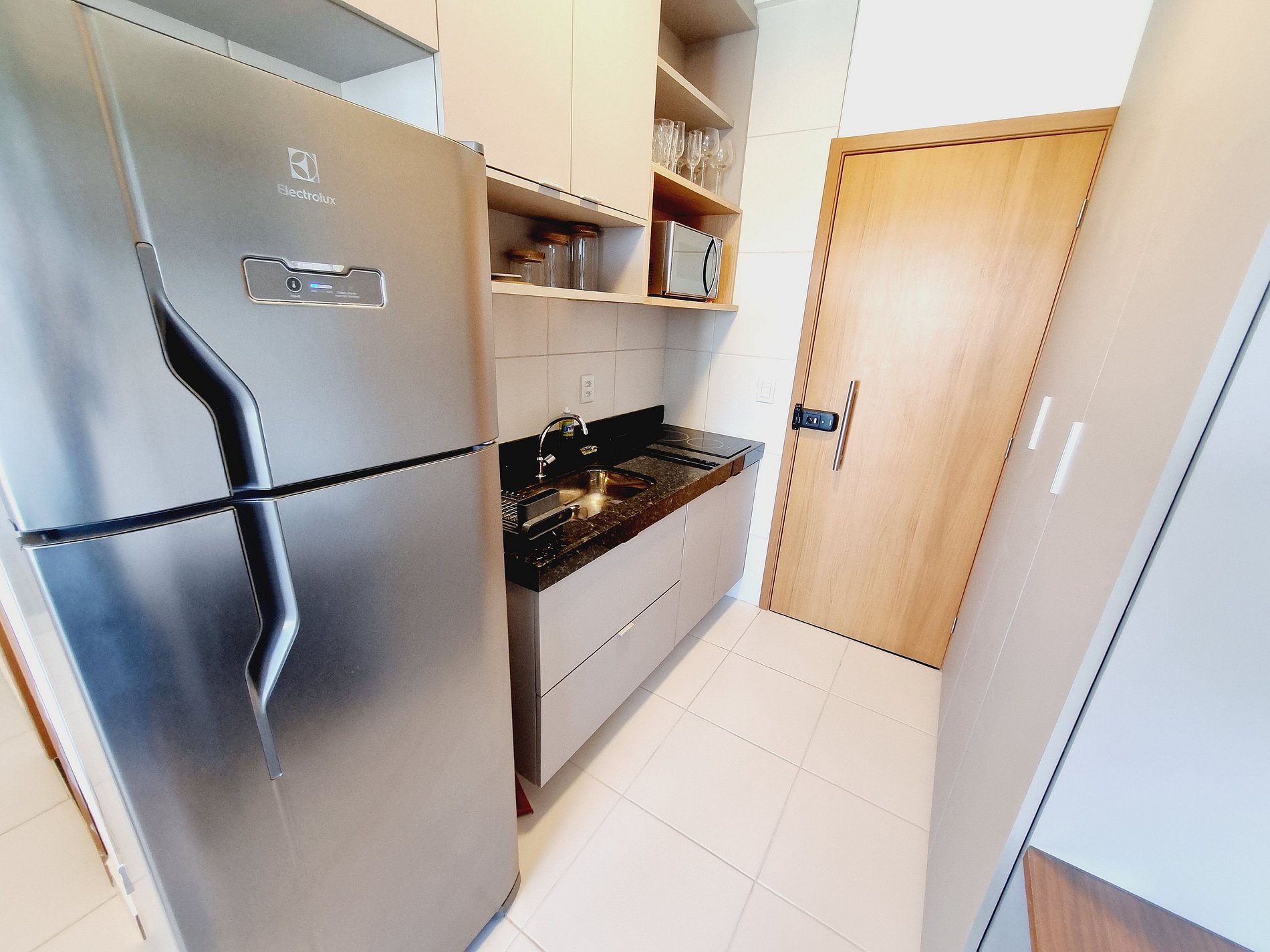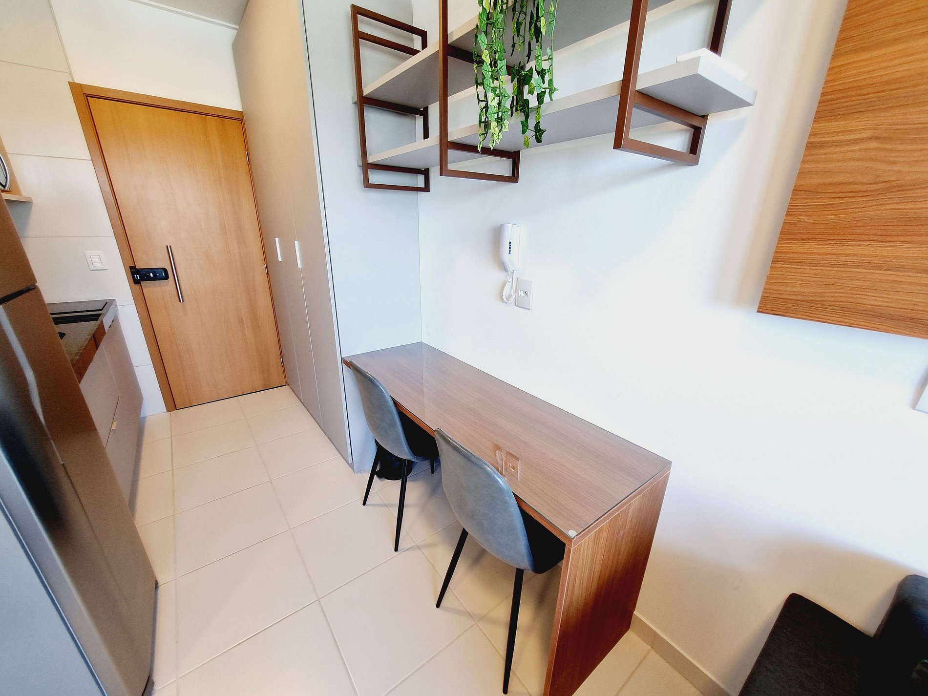 O apartamento totalmente mobiliado proporciona um ambiente confortável e funcional, equipado com todas as comodidades essenciais para sua estadia.