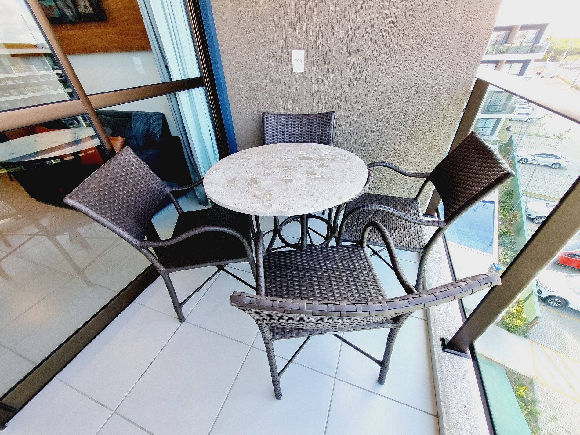- Configuração: Flat tipo estúdio; 1 cama de casal; 1 Sofá-cama de casal na sala; WC privativo, Mesa para refeições com 2 lugares; Cozinha compacta; Varanda com mesa e 4 cadeiras.