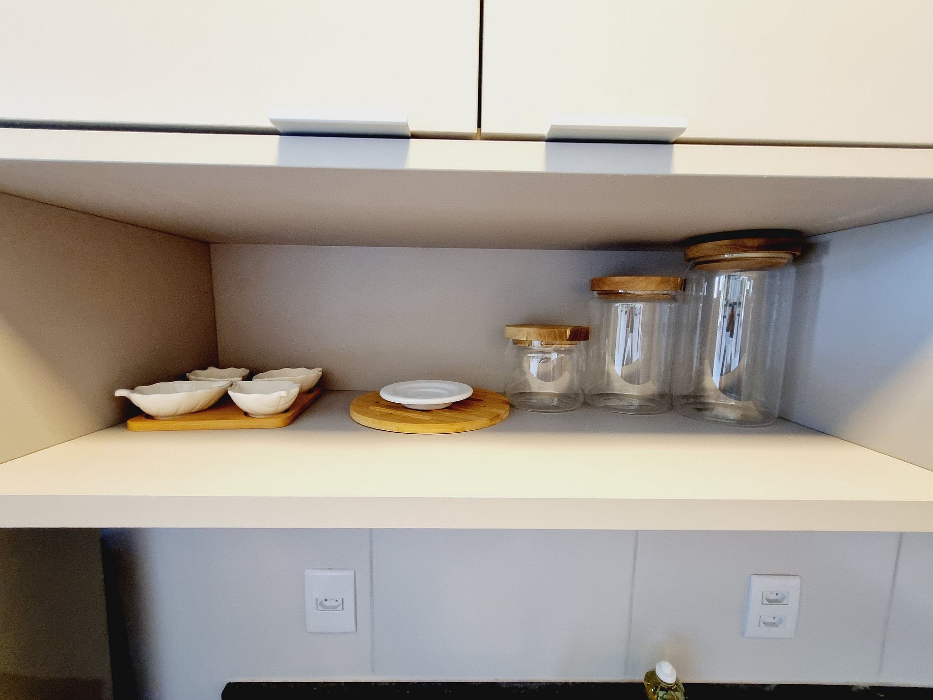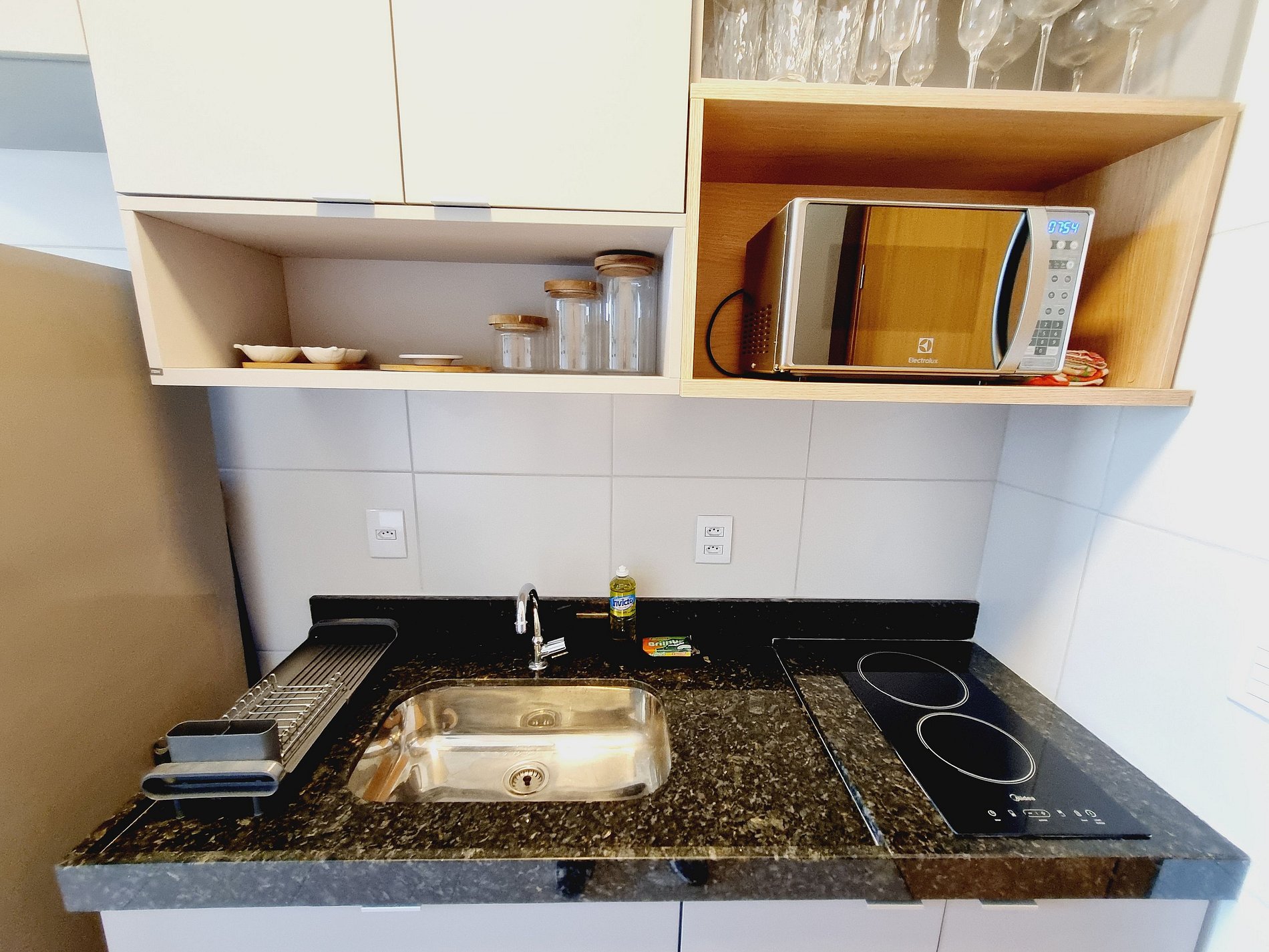 - Cozinha / Copa: Geladeira, cooktop elétrico, micro-ondas, sanduicheira, liquidificador, panelas, pratos, copos, talheres e utensílios diversos