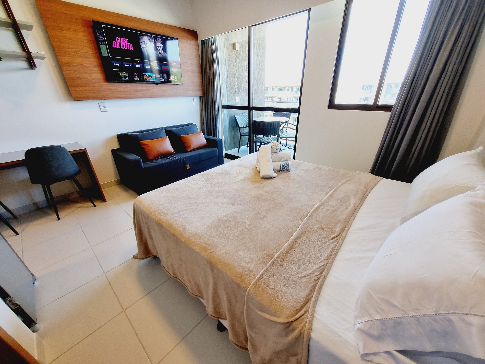 - Configuração: Flat tipo estúdio; 1 cama de casal; 1 Sofá-cama de casal na sala; WC privativo, Mesa para refeições com 2 lugares; Cozinha compacta; Varanda com mesa e 4 cadeiras.