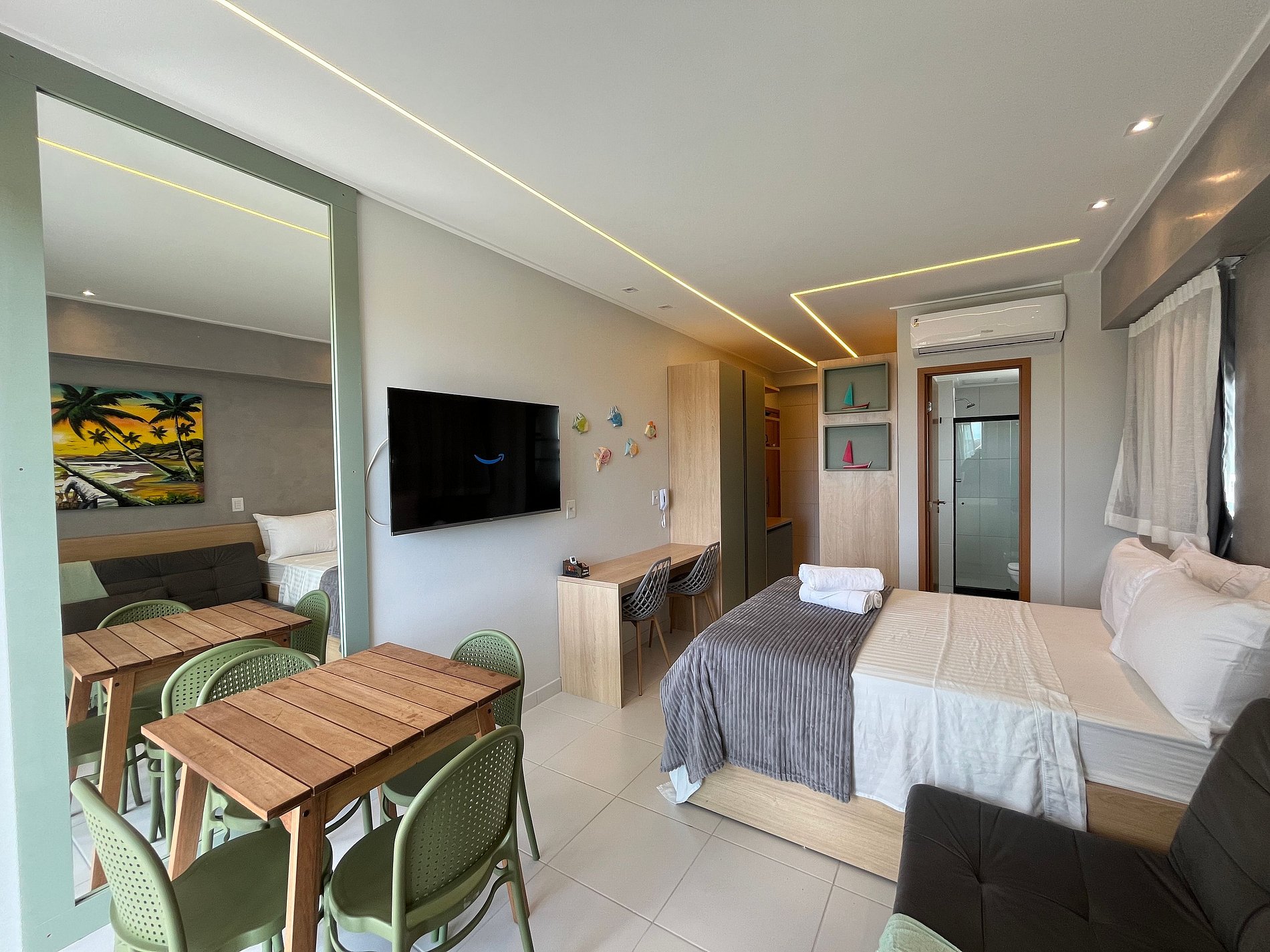 - Configuração: Flat tipo estúdio; 1 cama de casal com bicama de solteiro; 1 Sofá-cama de casal na sala; WC privativo, Mesa para refeições com 2 lugares; Cozinha compacta; Varanda com mesa e 4 cadeiras.
