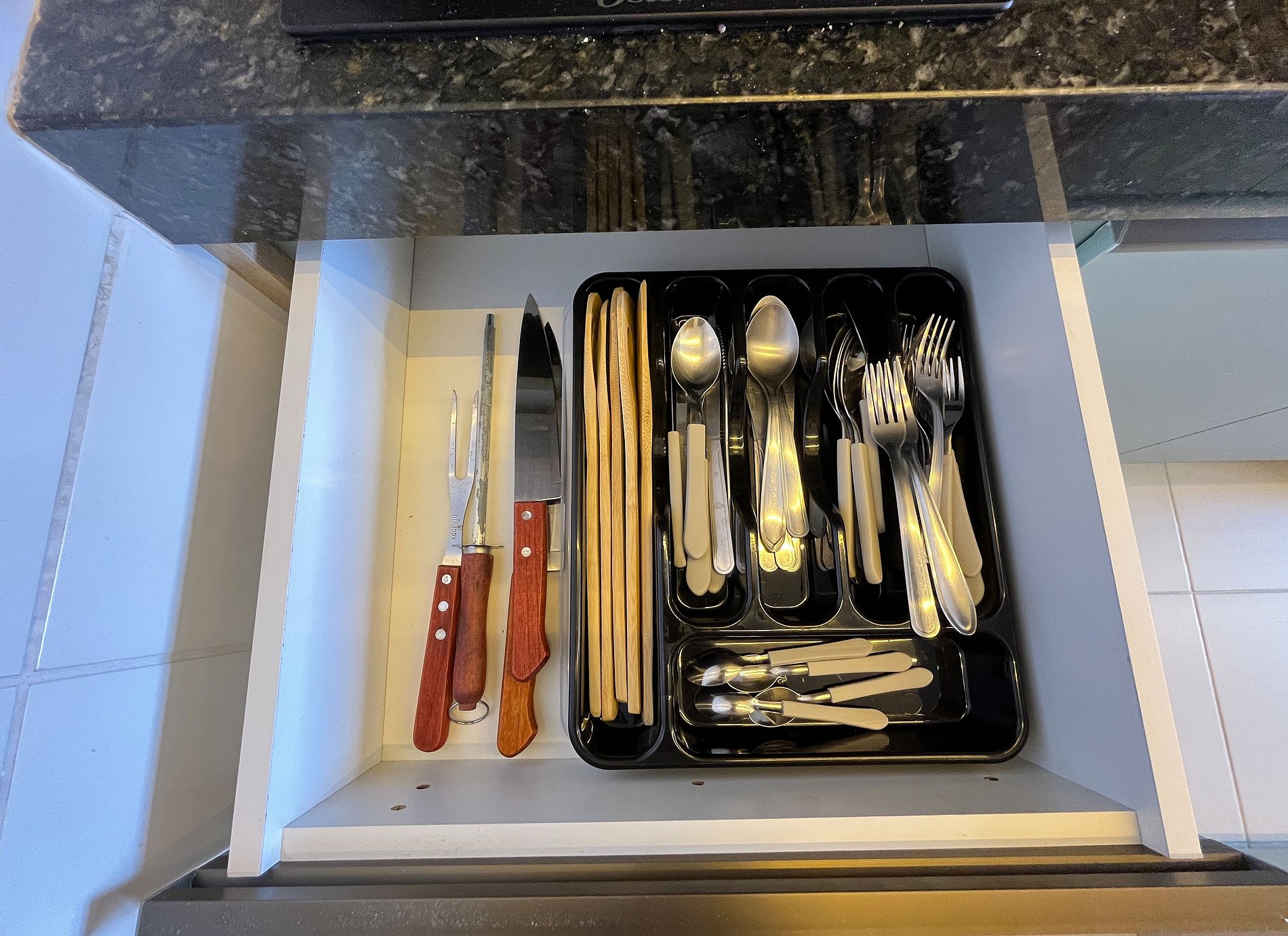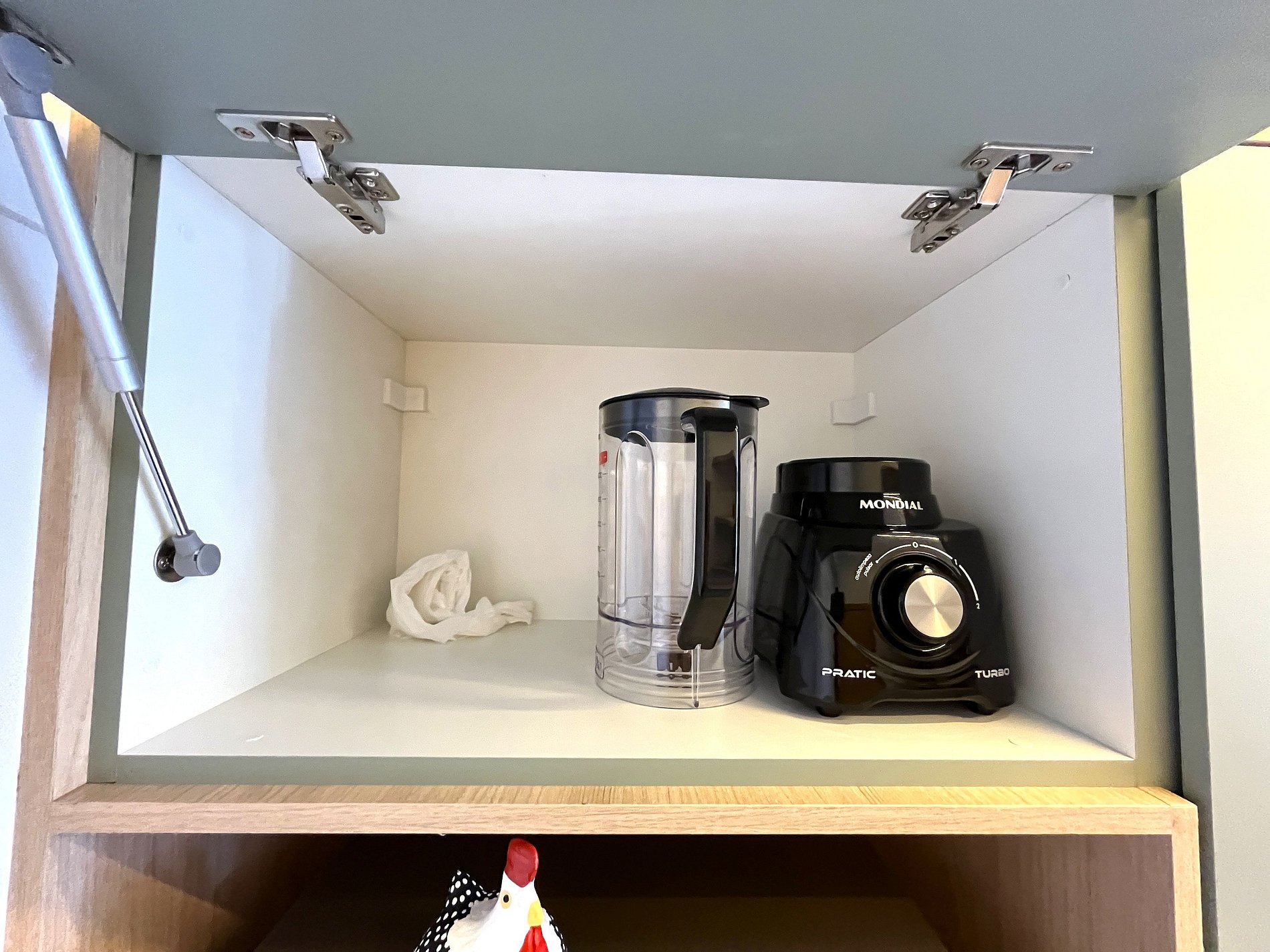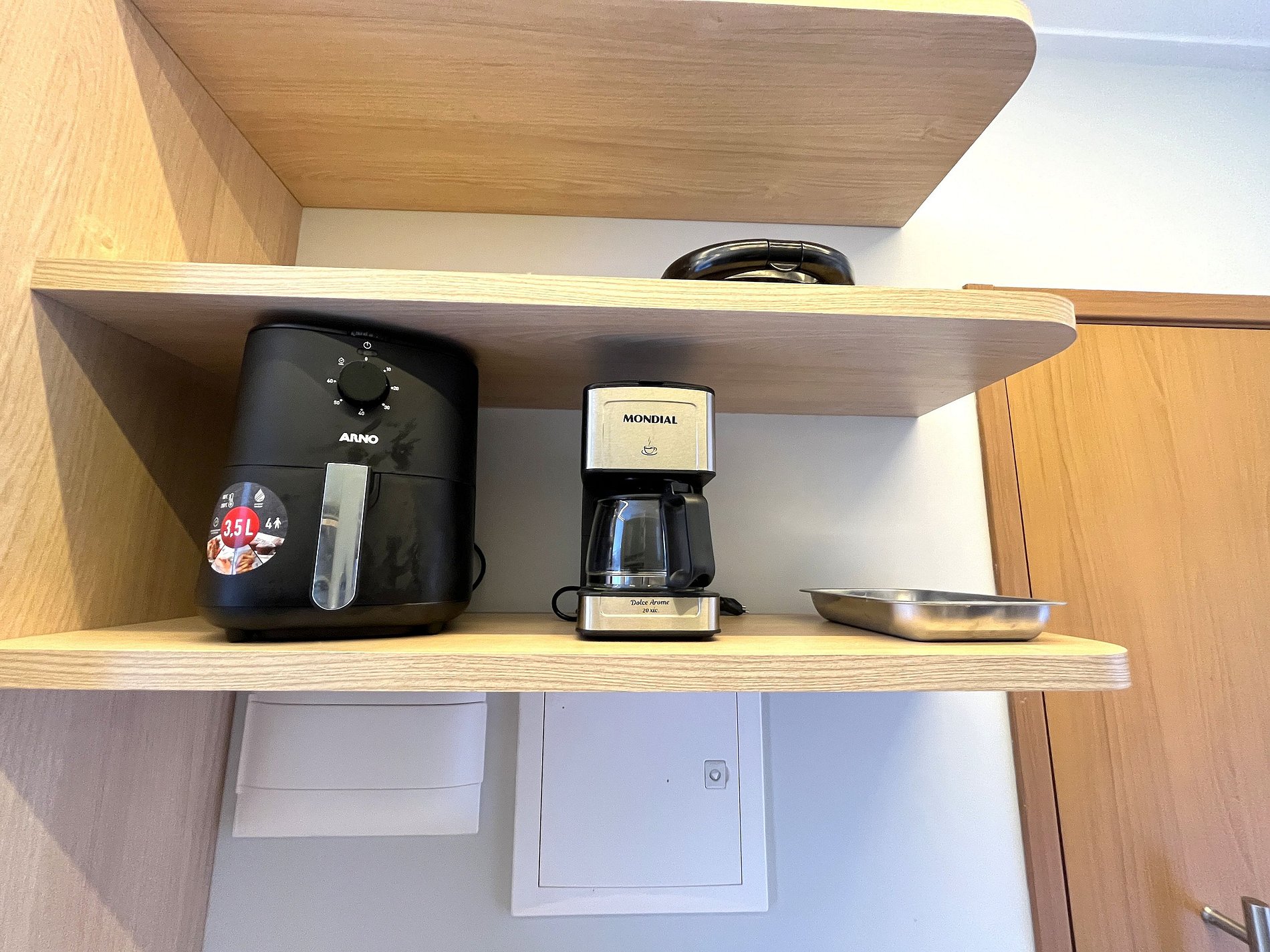 - Cozinha / Copa: Geladeira, cooktop elétrico, micro-ondas, airfry, sanduicheira, liquidificador, cafeteira, panelas, pratos, copos, talheres e utensílios diversos