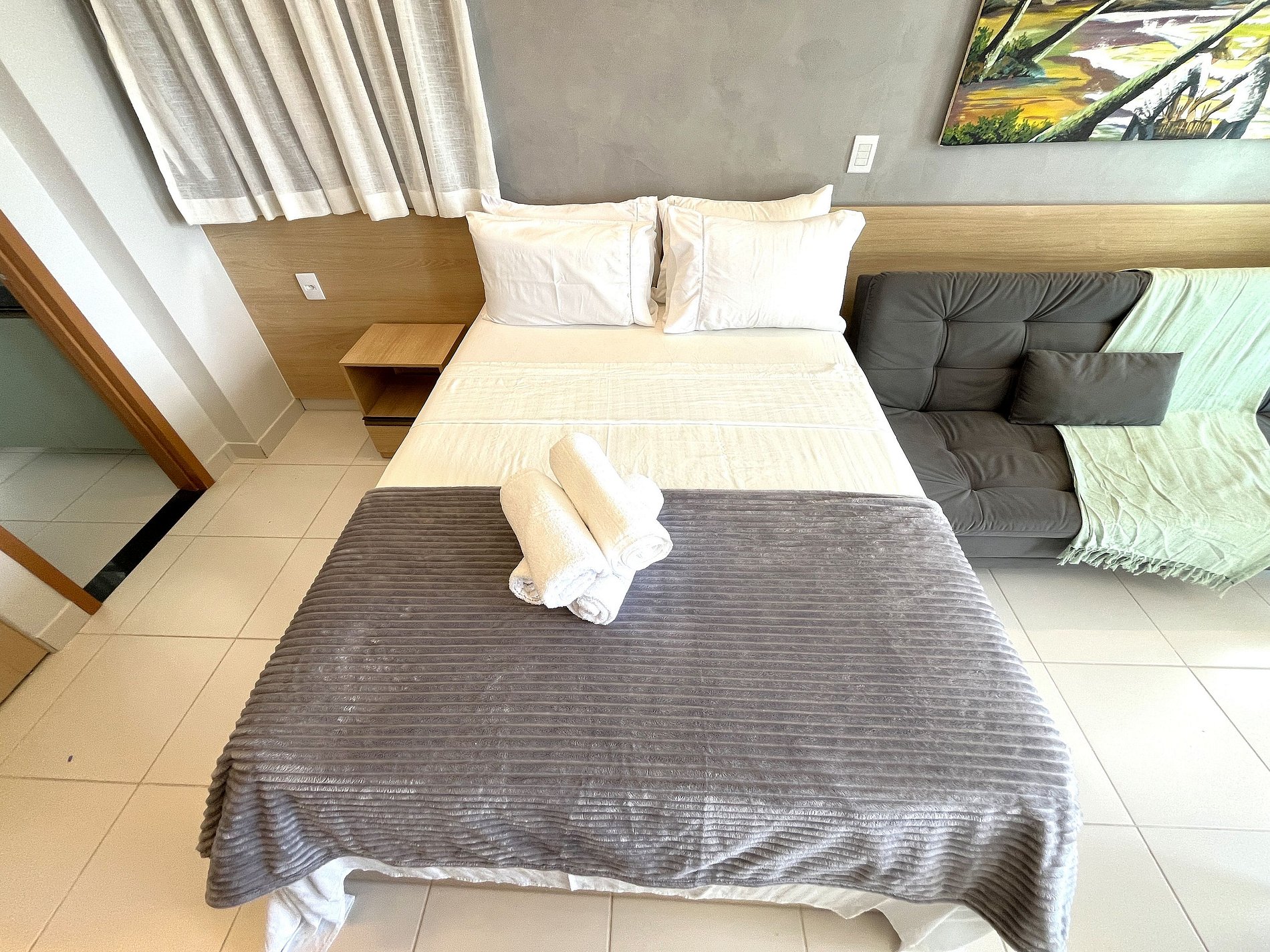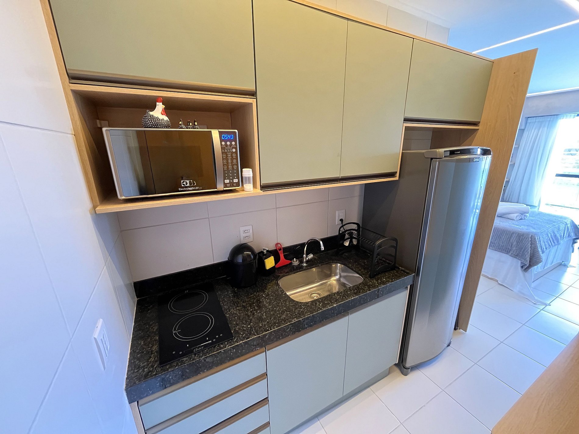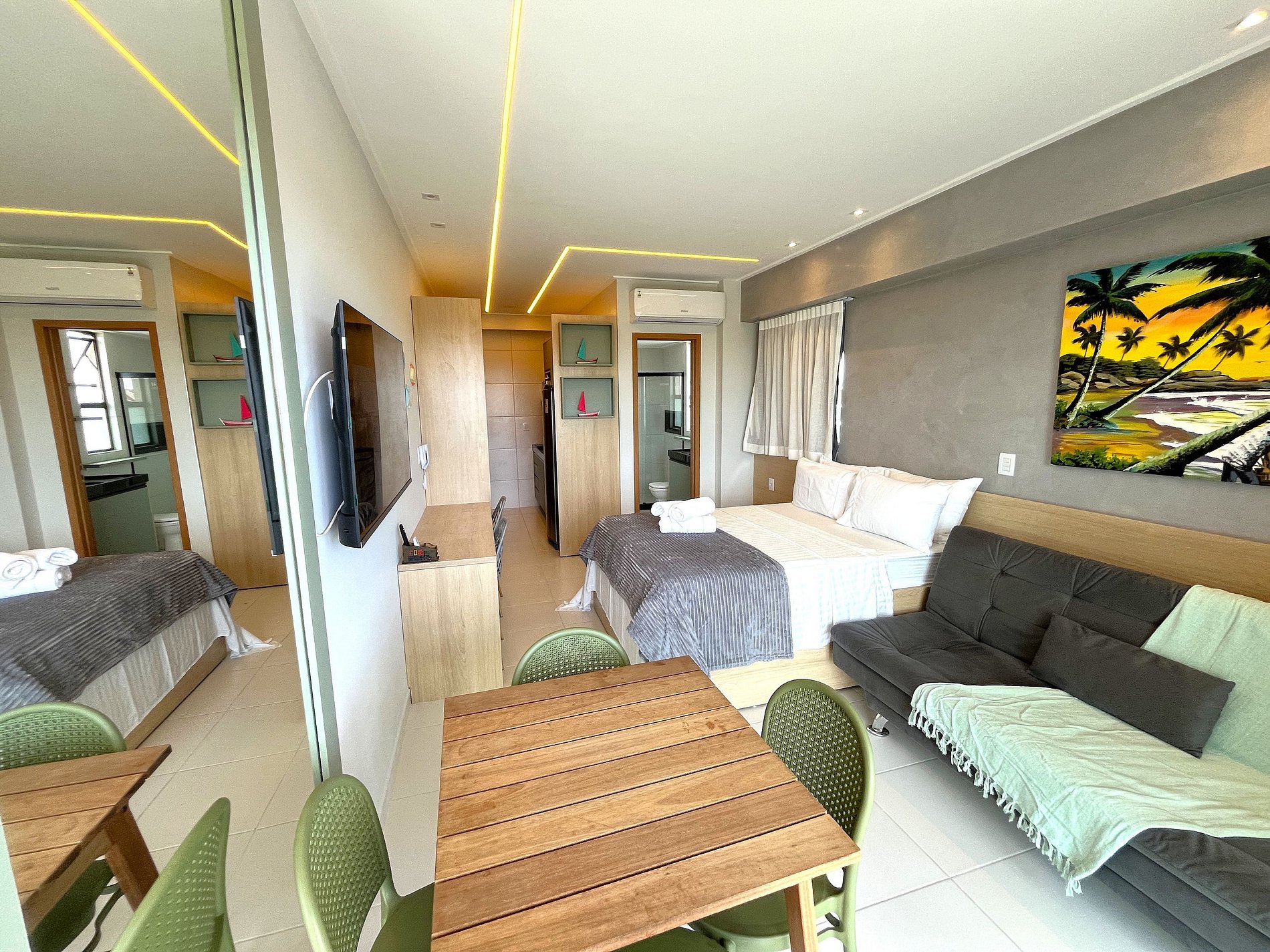 - Configuração: Flat tipo estúdio; 1 cama de casal com bicama de solteiro; 1 Sofá-cama de casal na sala; WC privativo, Mesa para refeições com 2 lugares; Cozinha compacta; Varanda com mesa e 4 cadeiras.