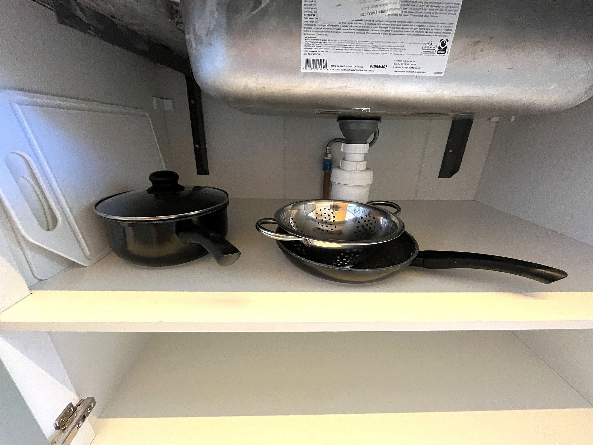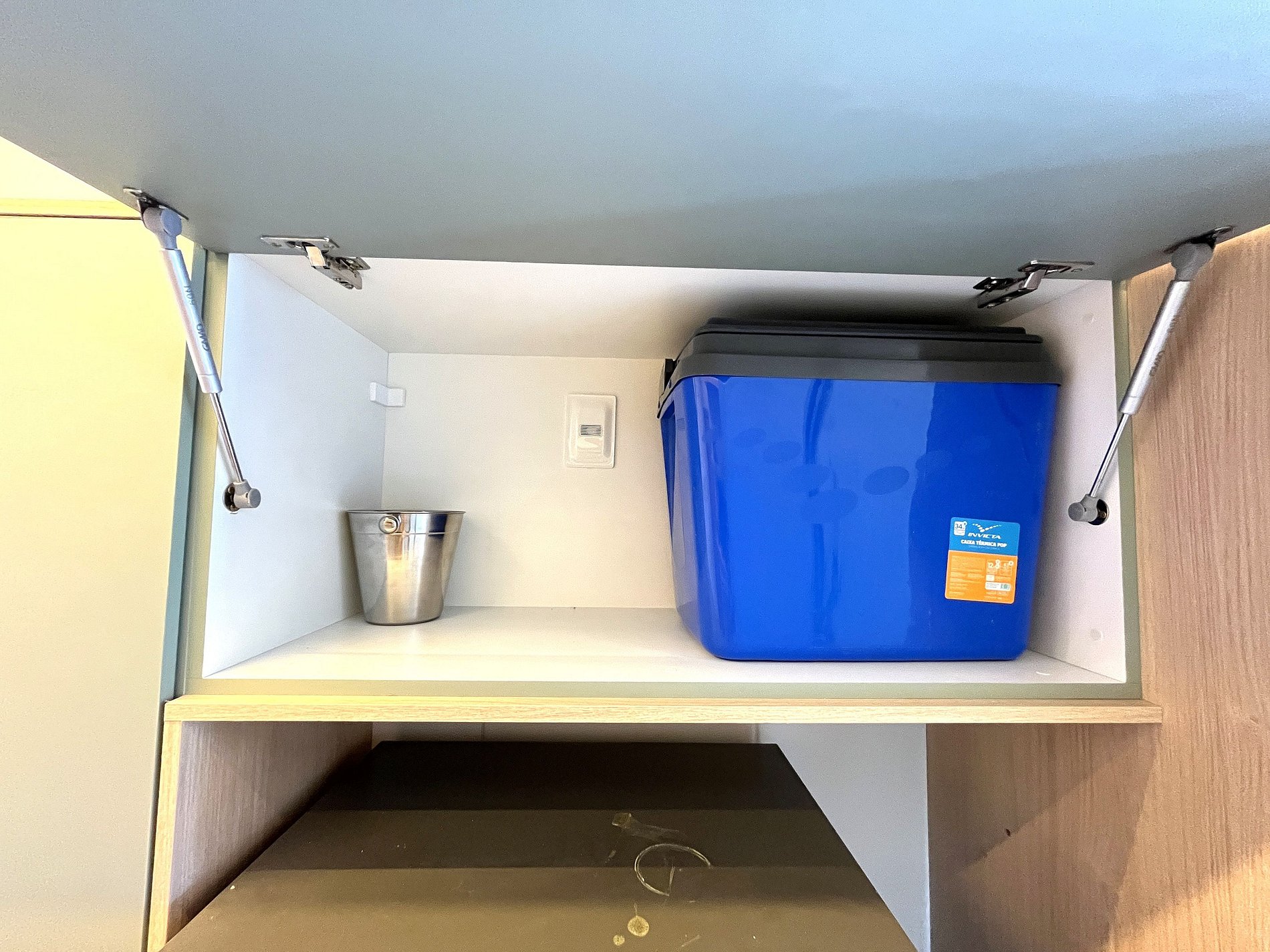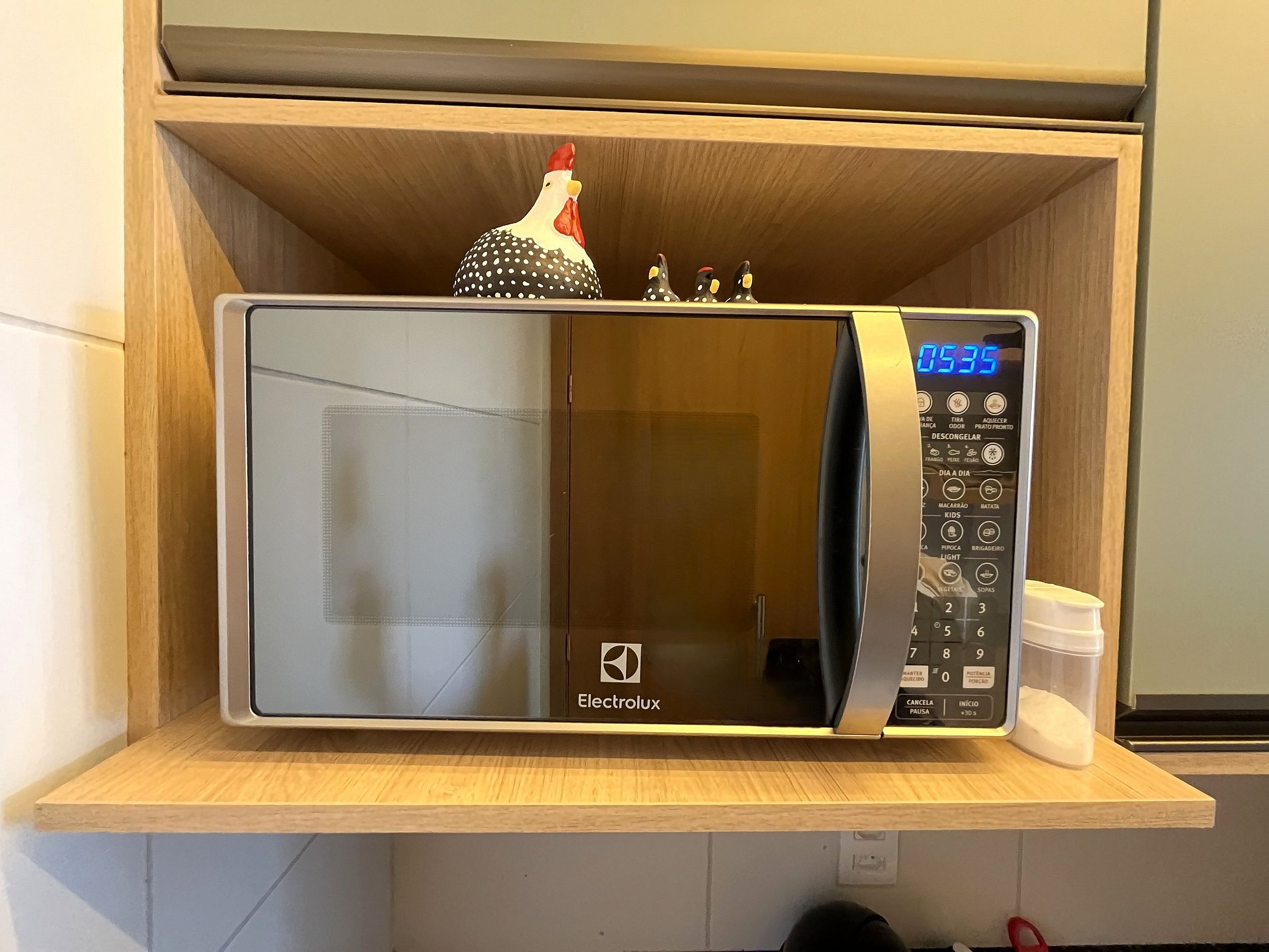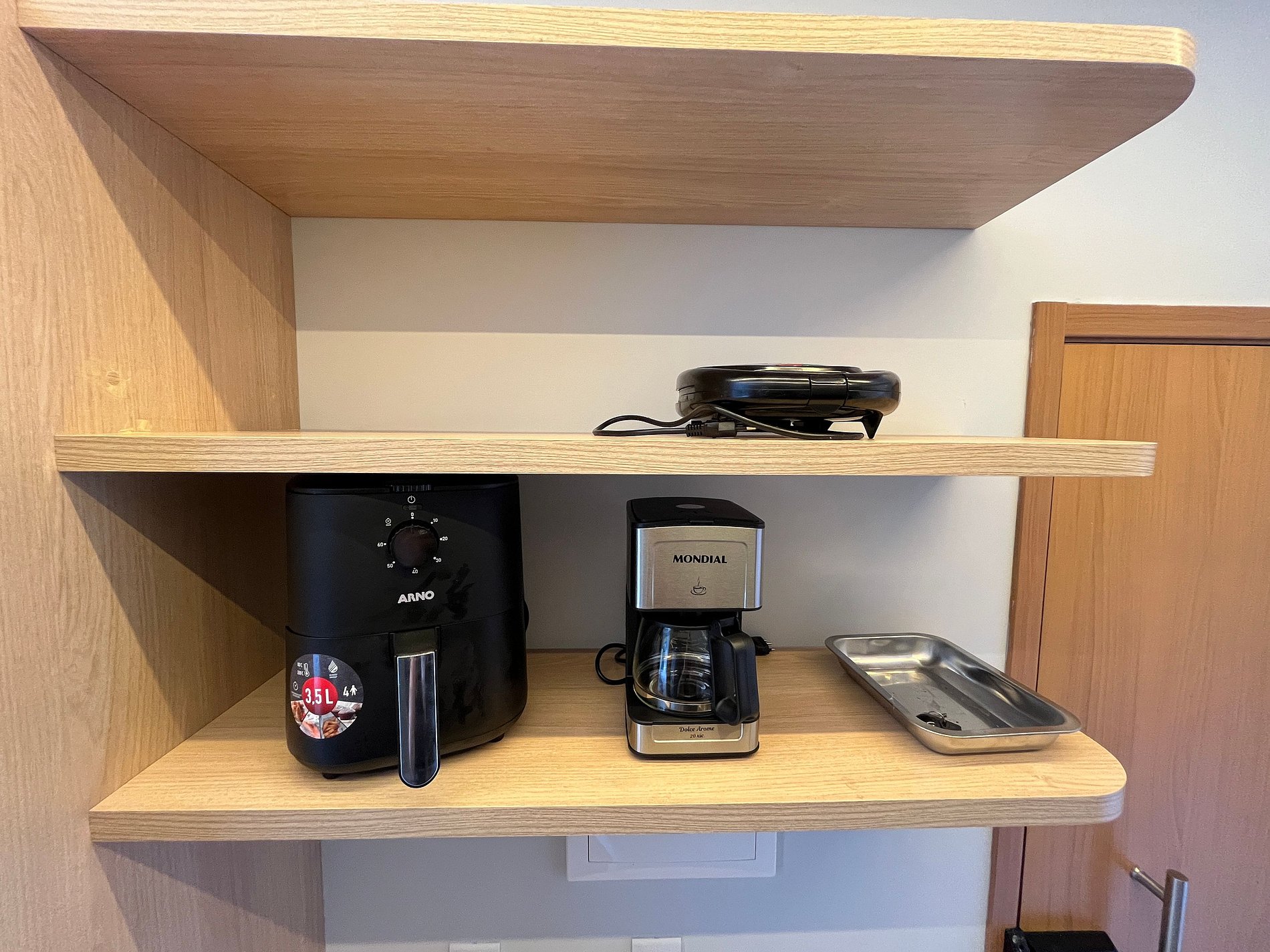 - Cozinha / Copa: Geladeira, cooktop elétrico, micro-ondas, airfry, sanduicheira, liquidificador, cafeteira, panelas, pratos, copos, talheres e utensílios diversos