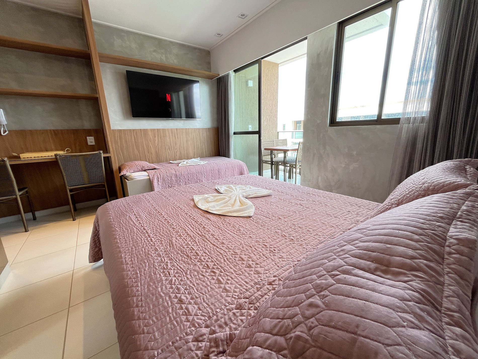 - Configuração: Flat tipo estúdio; 1 cama de casal com bicama de solteiro; 1 Sofá-cama de casal na sala; WC privativo, Mesa para refeições com 2 lugares; Cozinha compacta; Varanda com mesa e 4 cadeiras.