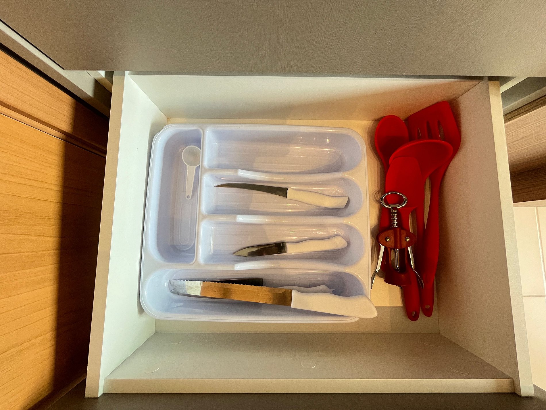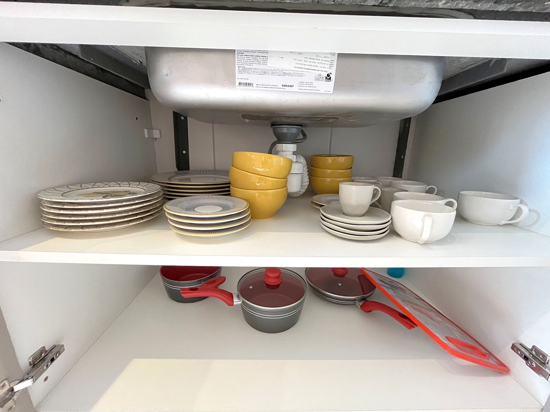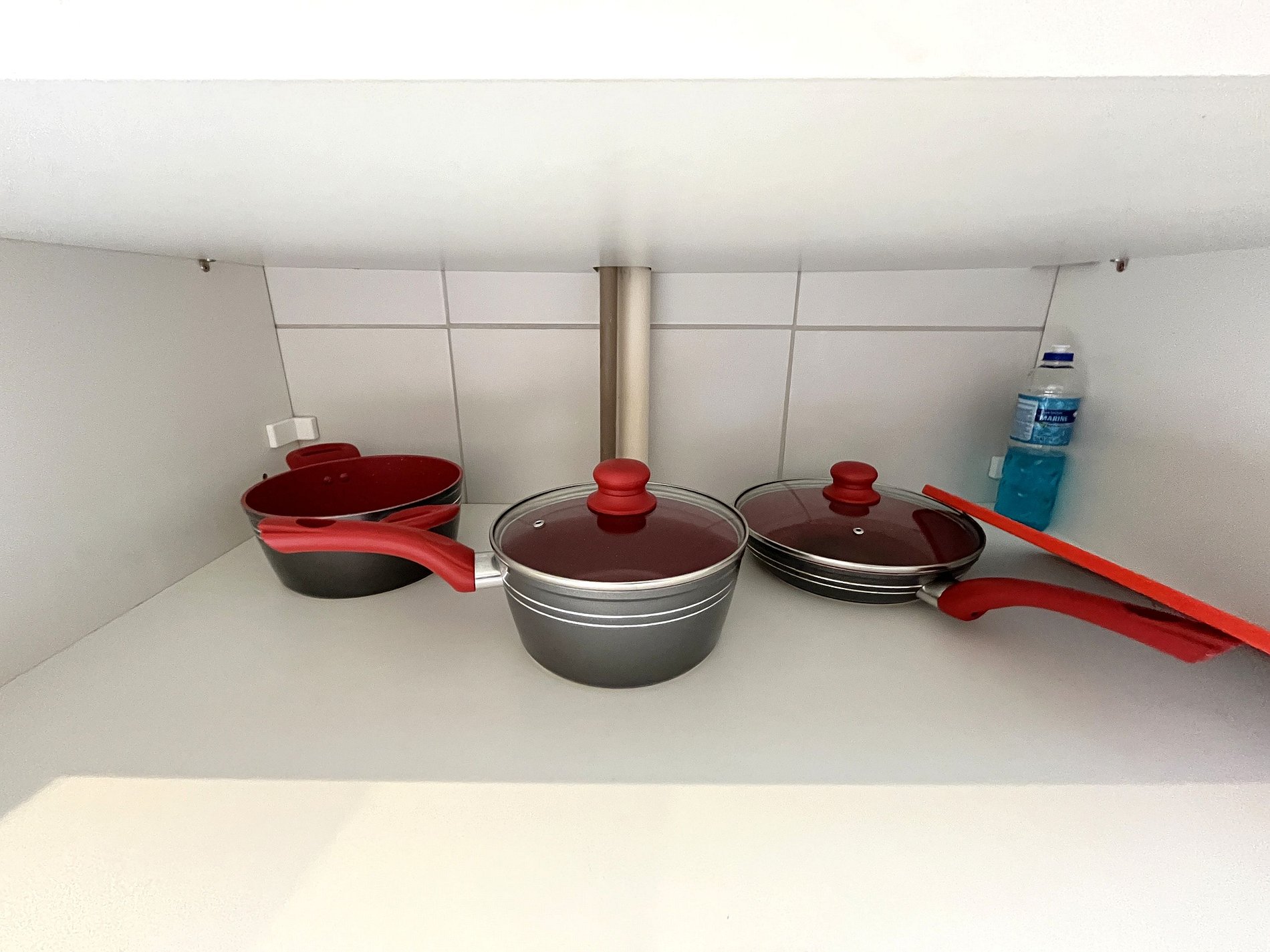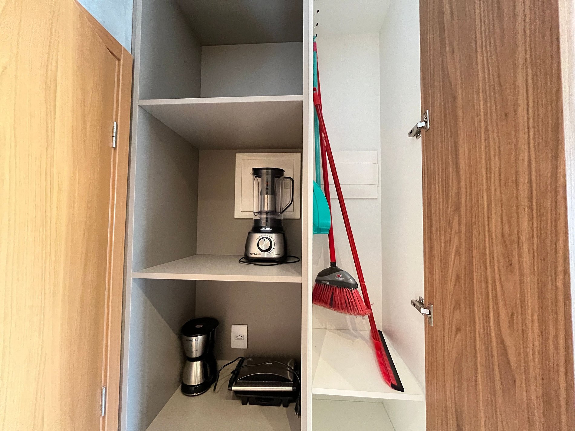 - Cozinha / Copa: Geladeira, cooktop elétrico, micro-ondas, sanduicheira, liquidificador, cafeteira, panelas, pratos, copos, talheres e utensílios diversos