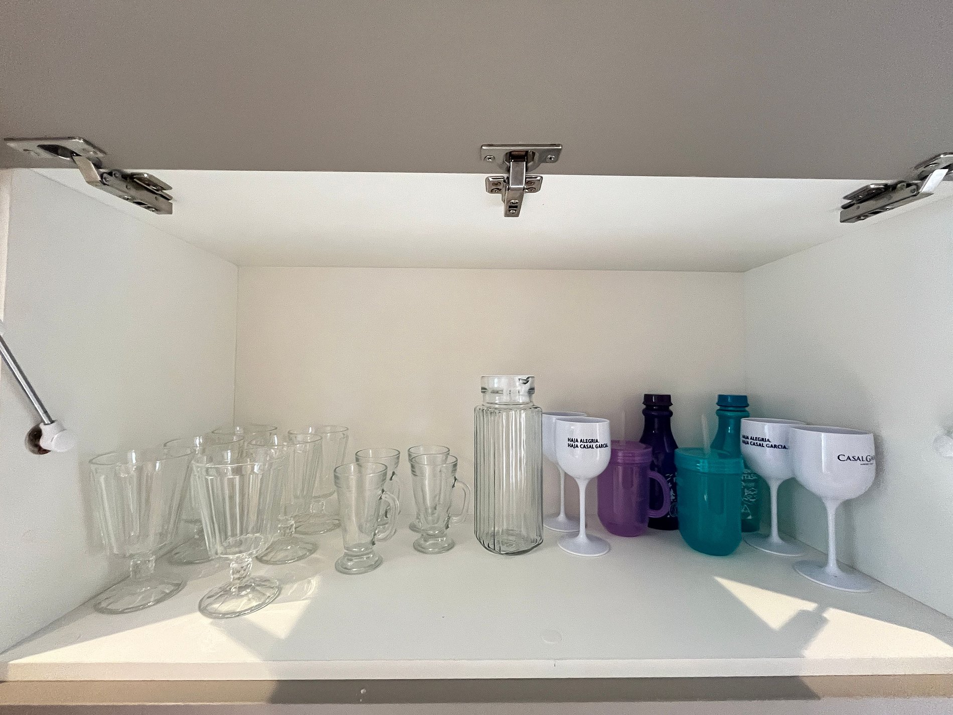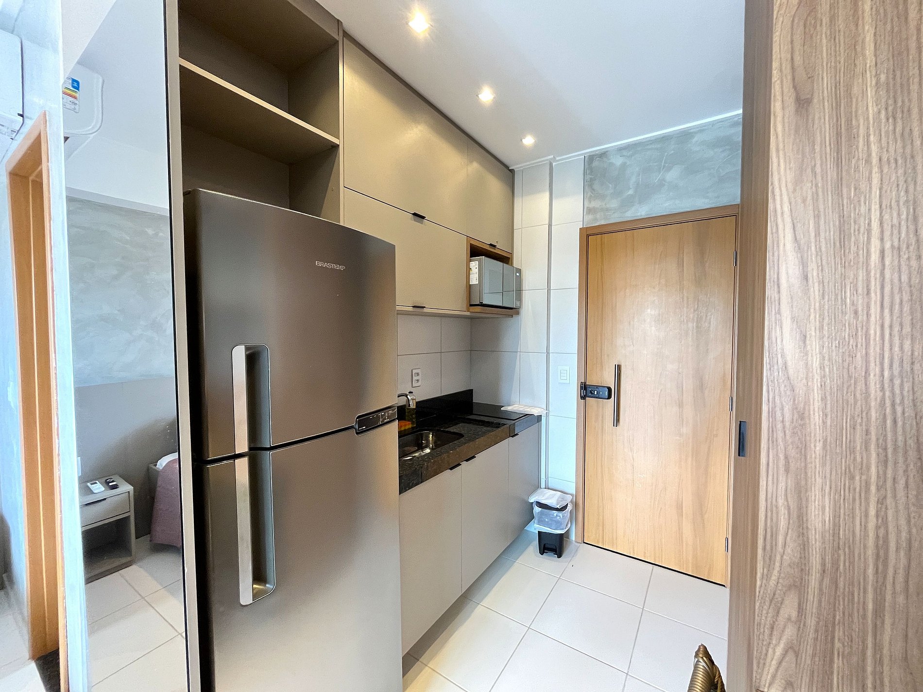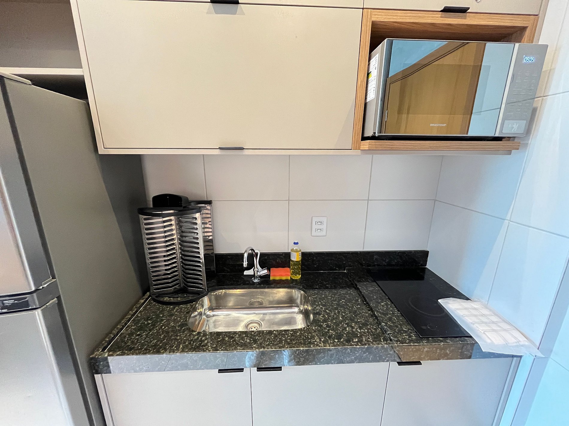 - Cozinha / Copa: Geladeira, cooktop elétrico, micro-ondas, sanduicheira, liquidificador, cafeteira, panelas, pratos, copos, talheres e utensílios diversos