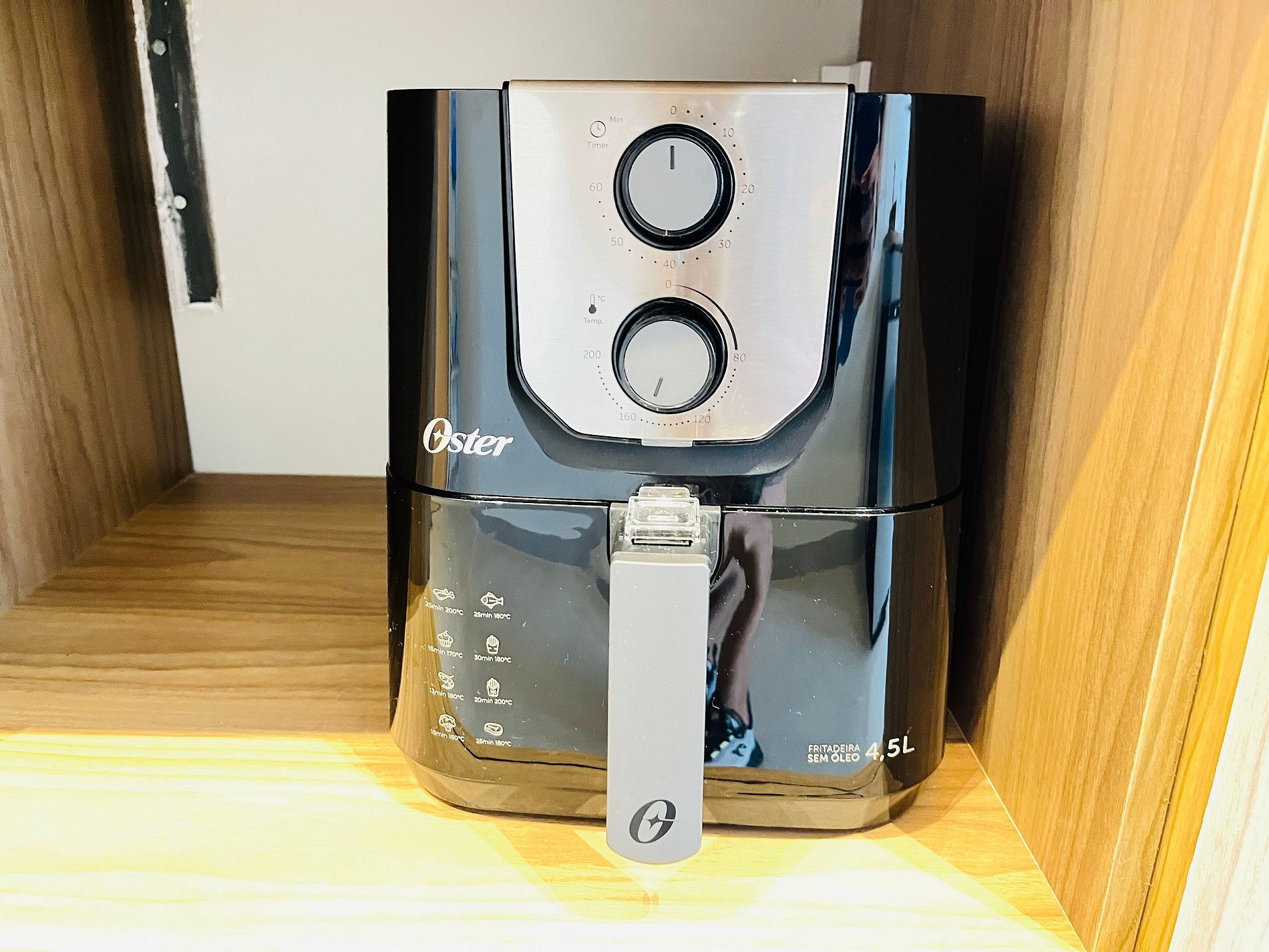 - Cozinha equipada com freezer, airfryer, sanduicheira, liquidificador e utensílios diversos