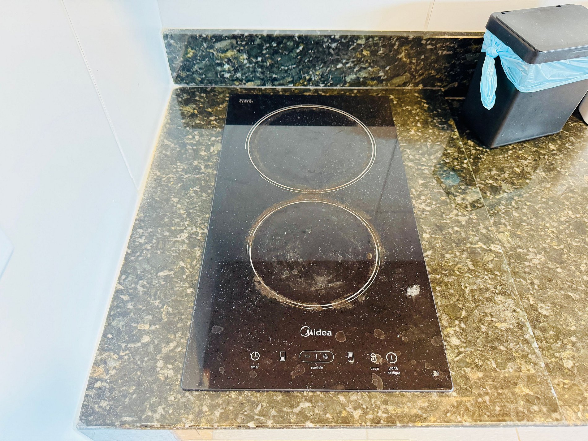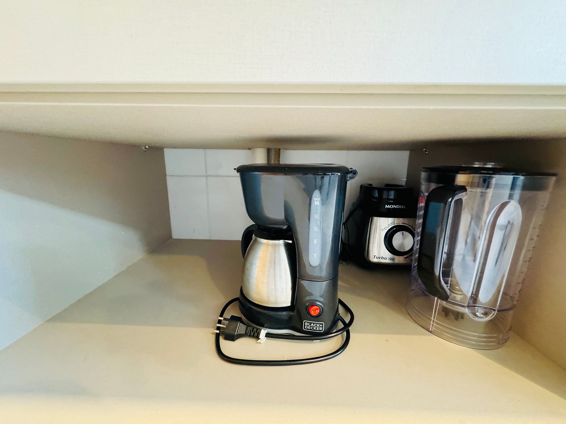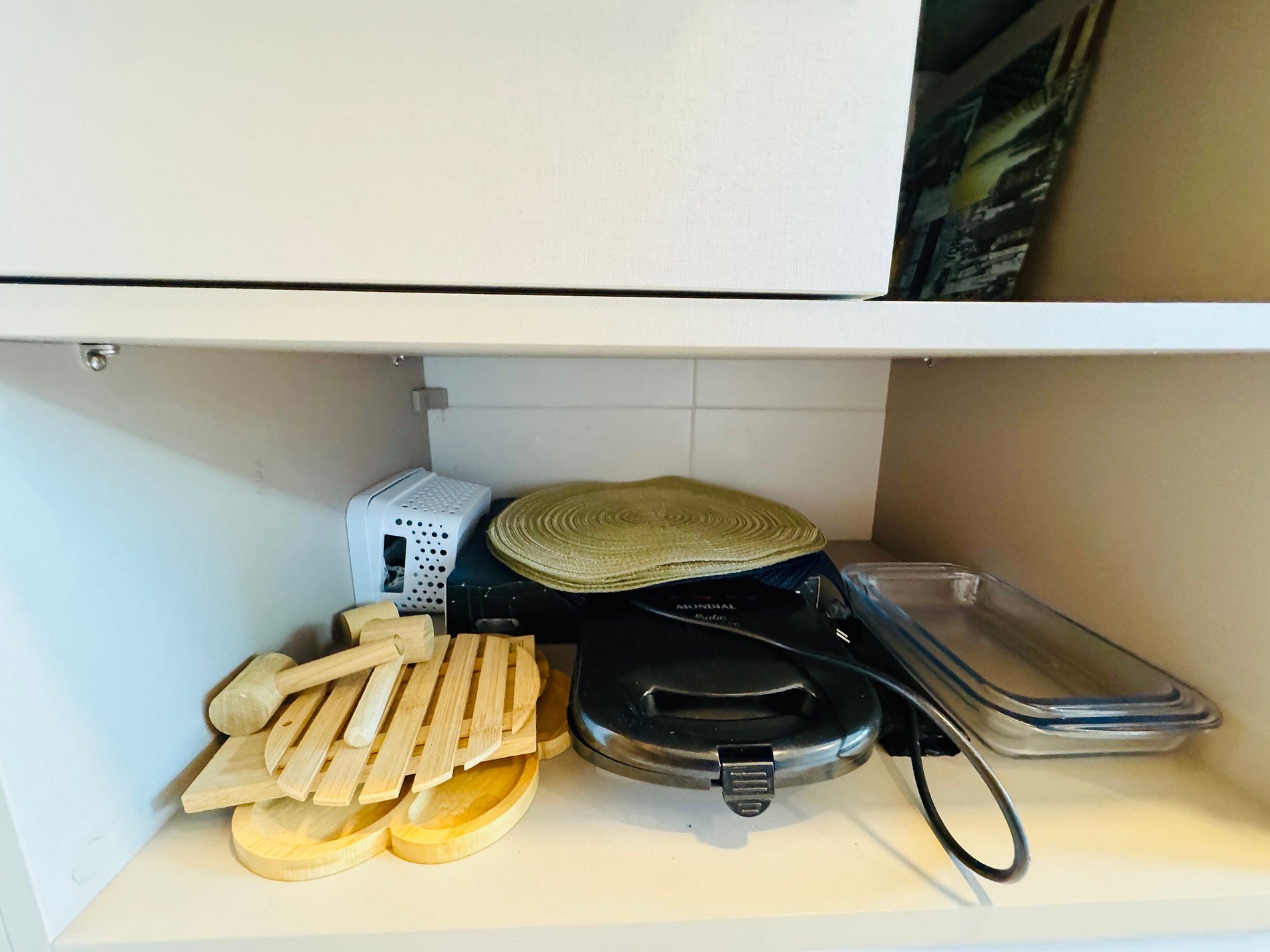 - Cozinha / Copa: Geladeira, cooktop elétrico, micro-ondas, airfry, sanduicheira, liquidificador, cafeteira, cuscuzeira, panelas, pratos, copos, talheres e utensílios diversos