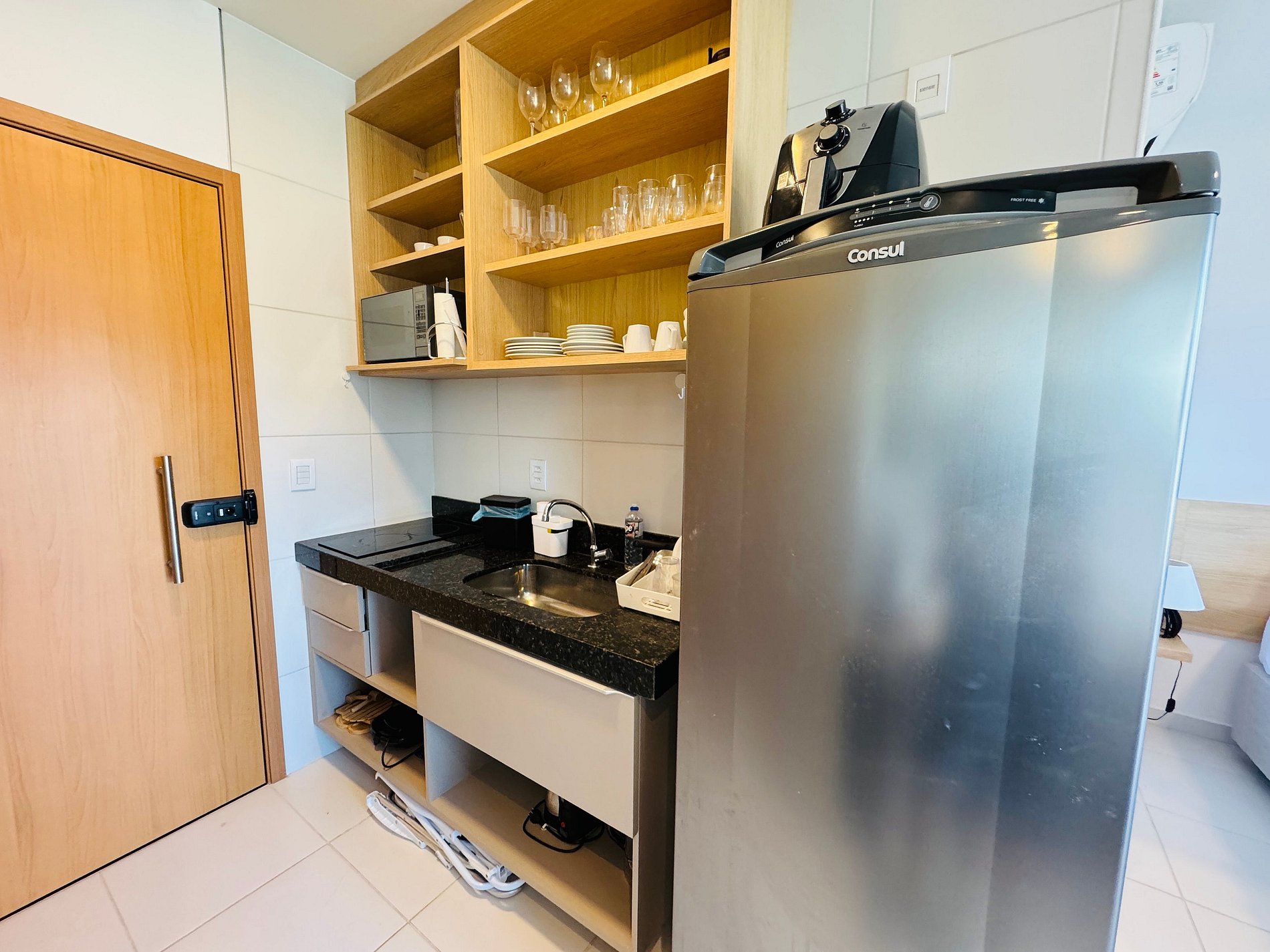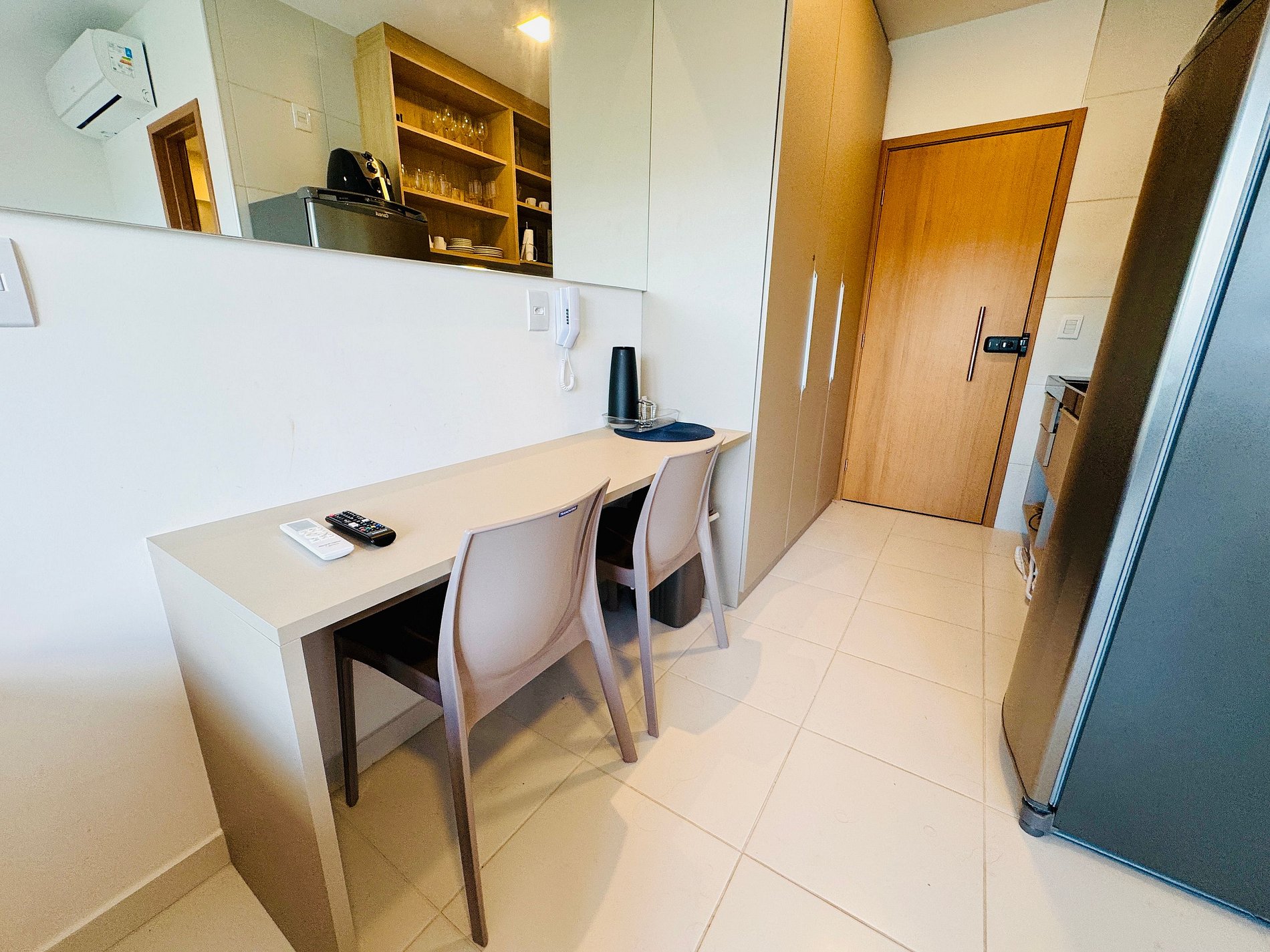 - Configuração: Flat tipo estúdio; 1 cama de casal; 1 Sofá-cama de casal na sala; WC privativo, Mesa para refeições com 2 lugares; Cozinha compacta; Varanda com mesa e 3 cadeiras.