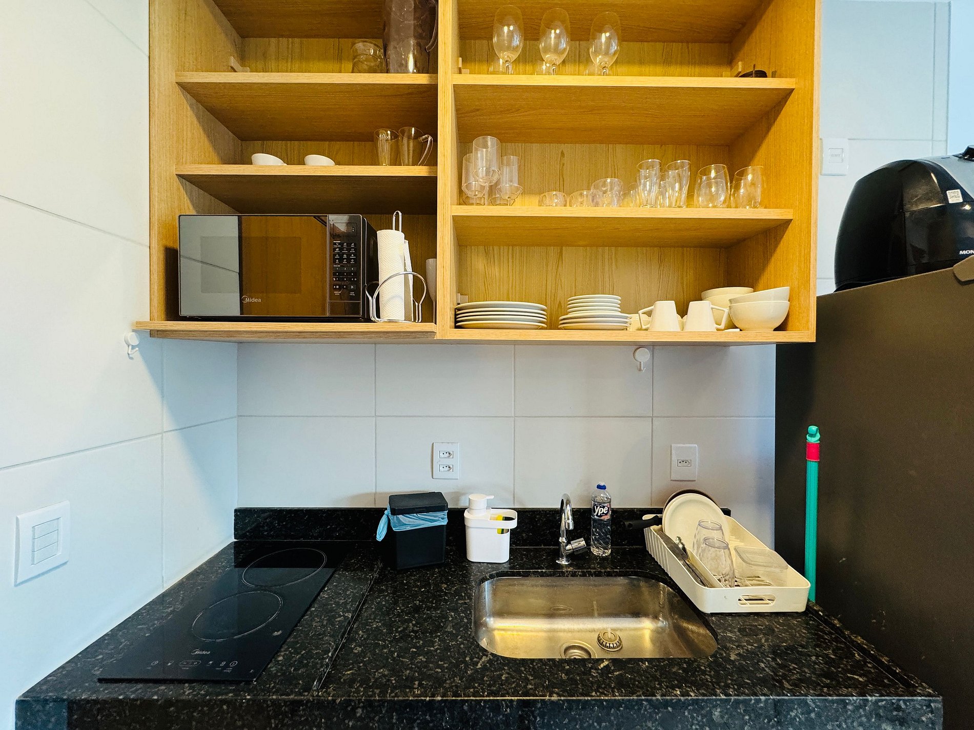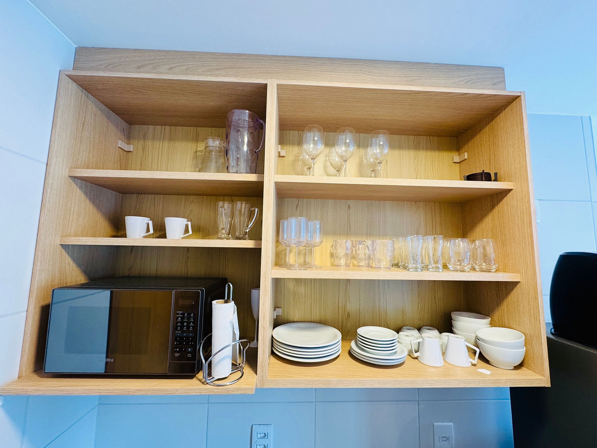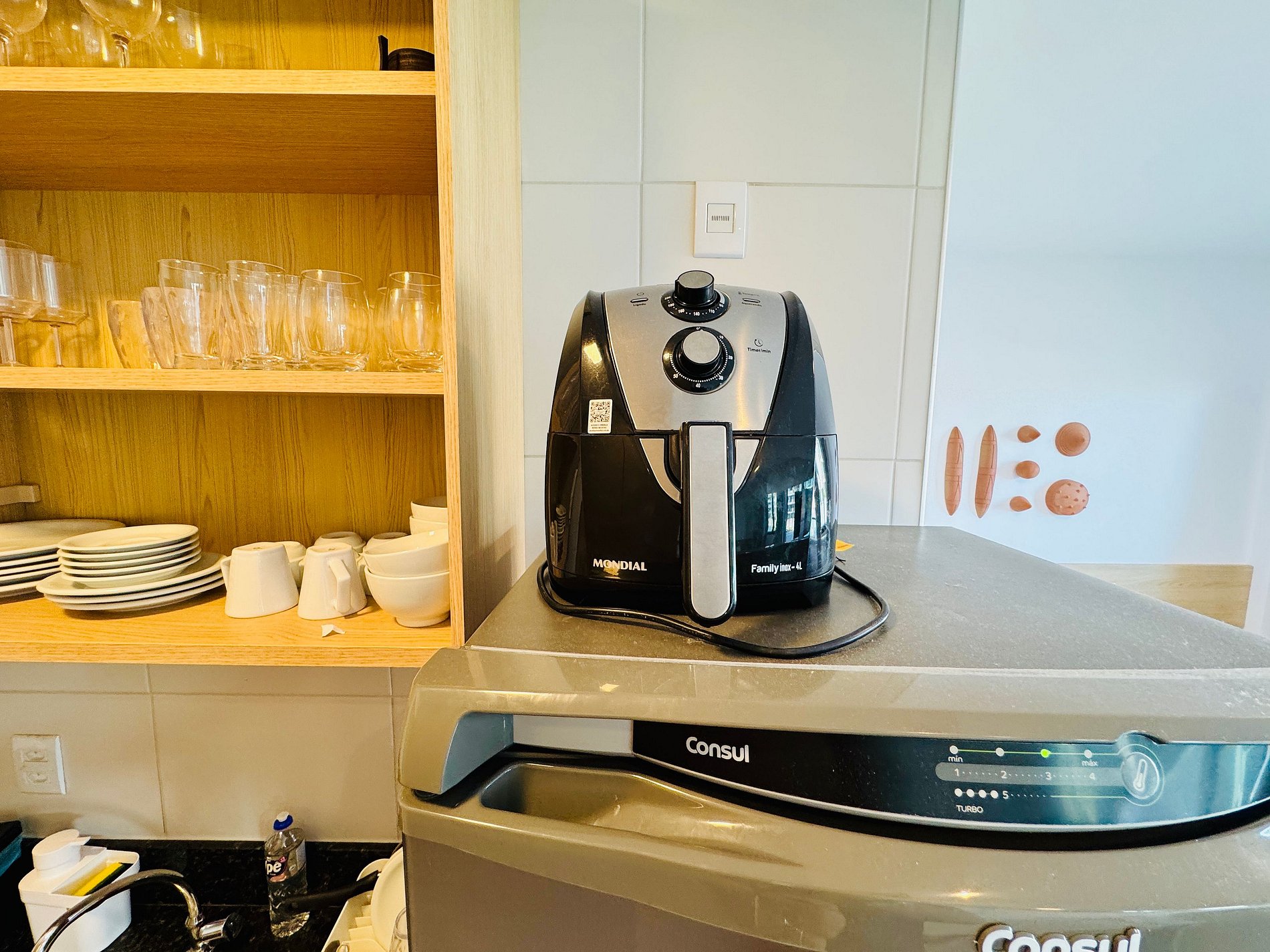 - Cozinha / Copa: Geladeira, cooktop elétrico, micro-ondas, airfry, sanduicheira, liquidificador, cafeteira, cuscuzeira, panelas, pratos, copos, talheres e utensílios diversos