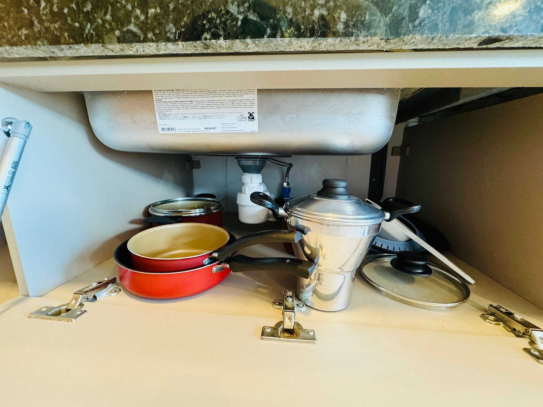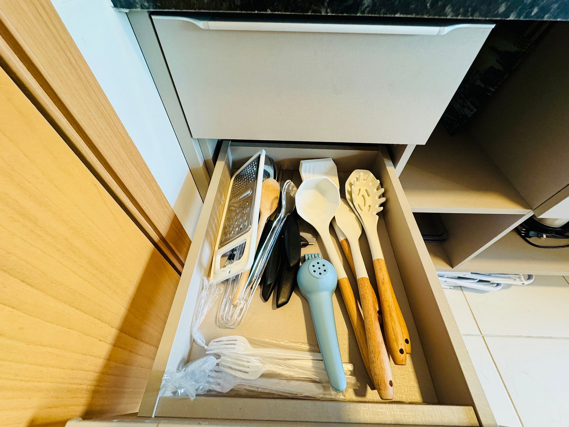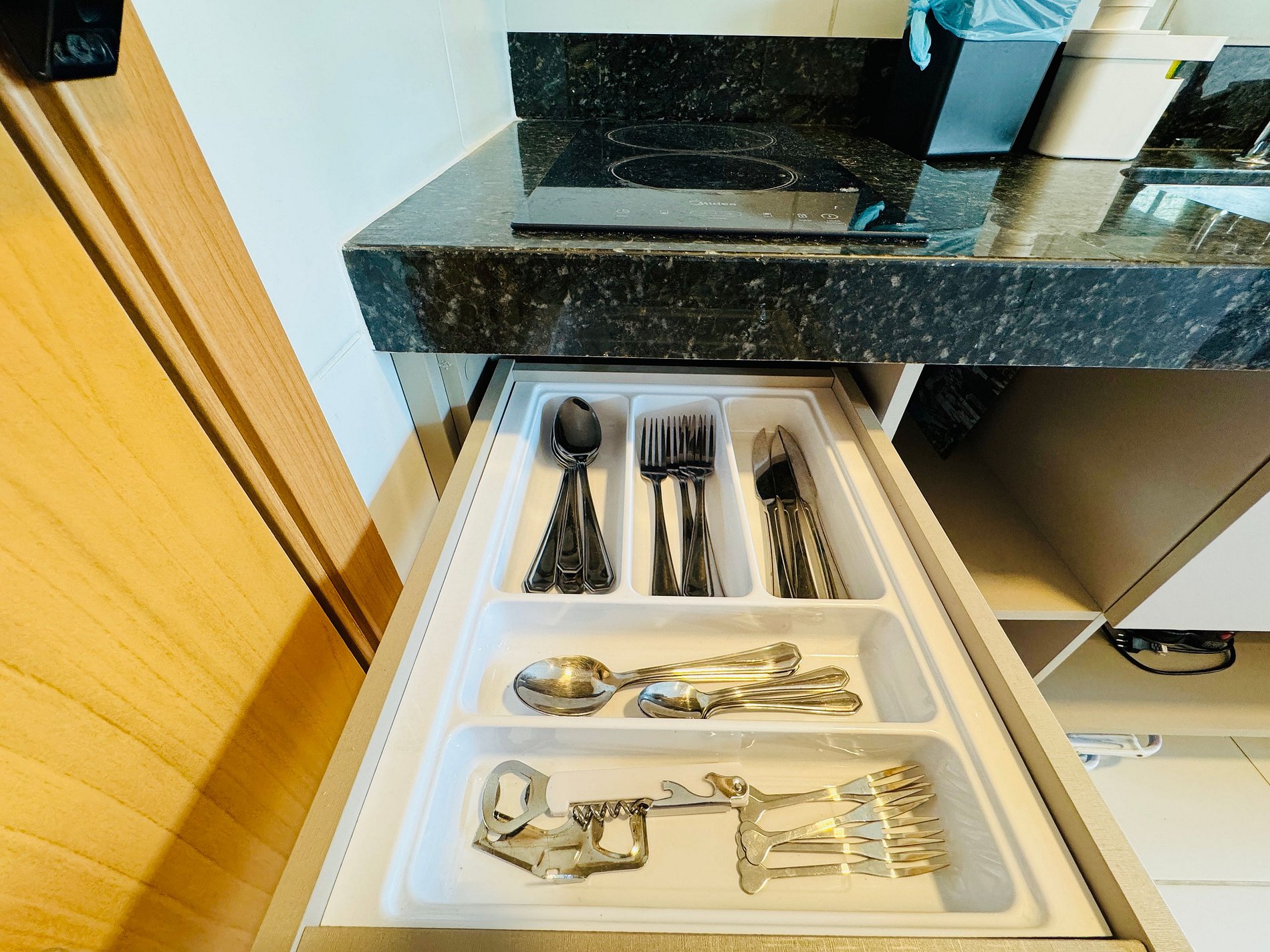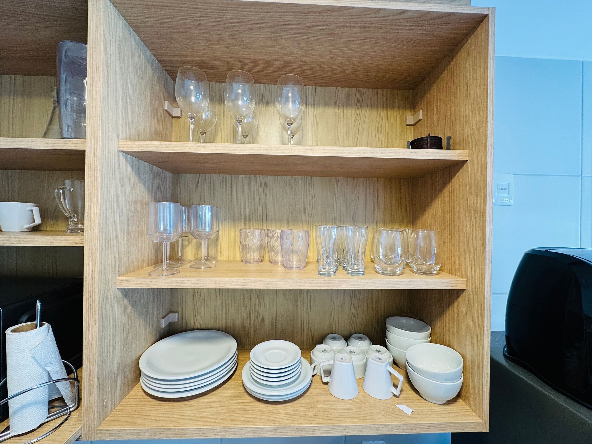- Cozinha / Copa: Geladeira, cooktop elétrico, micro-ondas, airfry, sanduicheira, liquidificador, cafeteira, cuscuzeira, panelas, pratos, copos, talheres e utensílios diversos