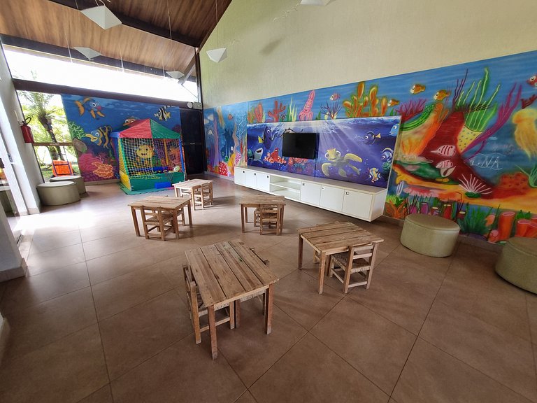 Apt acomoda até 6 hóspedes. Possui Spit em todos cômodos , Wi-Fi, SmartTV. Composto por 1 quarto com 2 bicamas, 1 suíte com cama de casal, sala de estar, jantar e varanda com vista para as piscinas. A cozinha está equipada com geladeira, fogão, forno, microondas, liquidificador, sanduicheira, lavadora de pratos. Além disso, possui pratos, copos, conjunto de panela, facas e utensílios diversos. A taxa de limpeza inclui a faxina da entrada e da saída, lençóis, mantas e toalhas para todos os integrantes.
