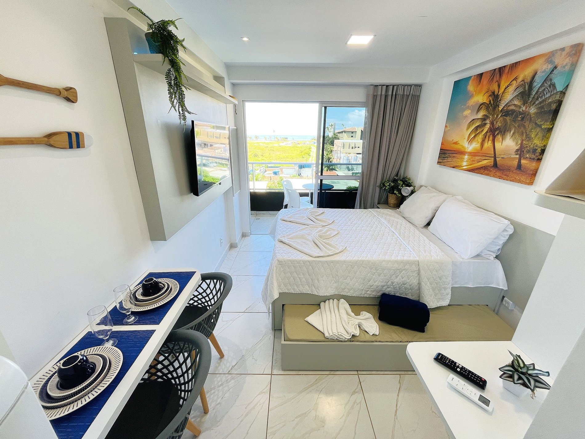 O Flat no condomínio Cupe Garden na praia do Cupe em Porto de Galinhas, conta com Rooftop, 2 experiências de piscinas (borda infinita e water play), lounge, espaço gourmet, estacionamento rotativo, elevador e solarium com vista para o nascer e pôr do sol. O charme fica por conta da piscina com vista para o Mar. Apt tipo estúdio com varanda possui cama de casal e cama solteiro embaixo (capacidade 3 pessoas), sala de estar para refeições, banheiro, cozinha completa, SmarTV, Wifi e enxoval gratuito