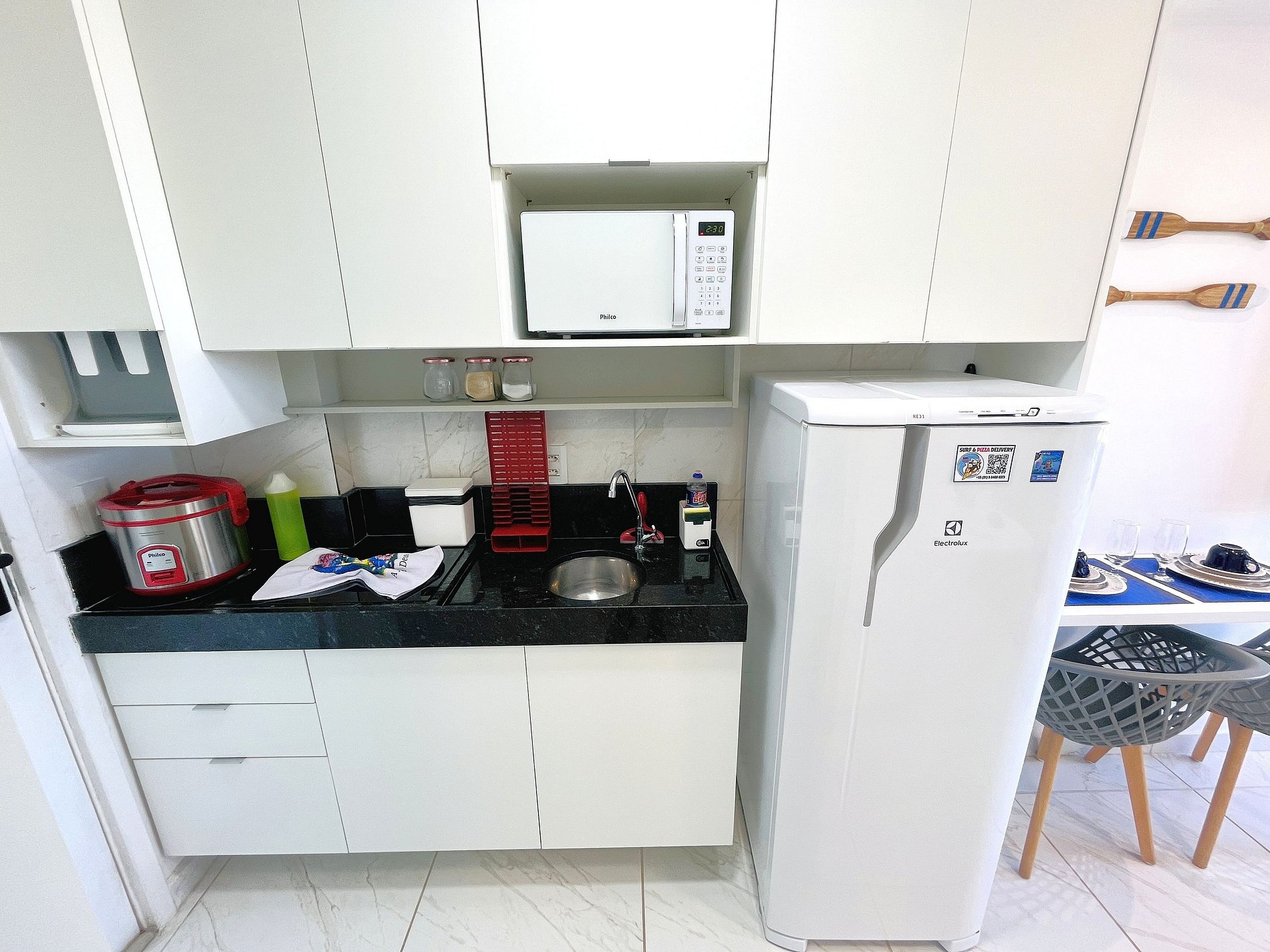 - Cozinha equipada com geladeira, micro-ondas, cooktop elétrico, airfry, panela de arroz elétrica, cafeteira, sanduicheira, liquidificador, filtro com reposição feita pelo hóspede e utensílios diversos