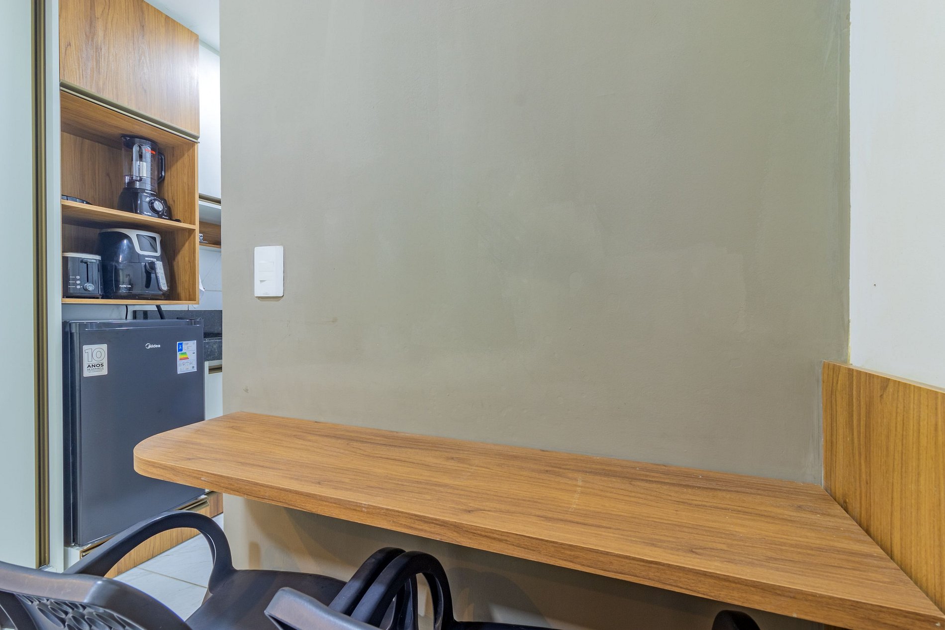 - Cozinha equipada com frigobar, cooktop elétrico, microondas, airfry, sanduicheira, cafeteira, liquidificador e utensílios diversos