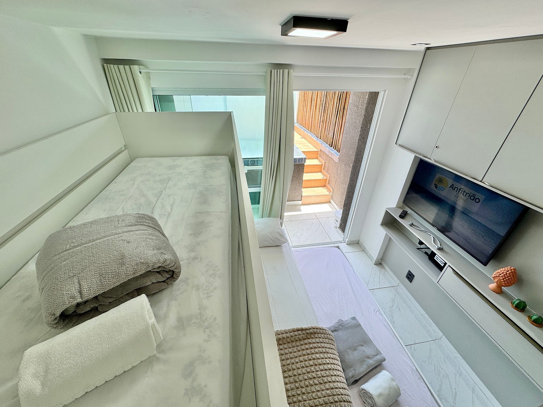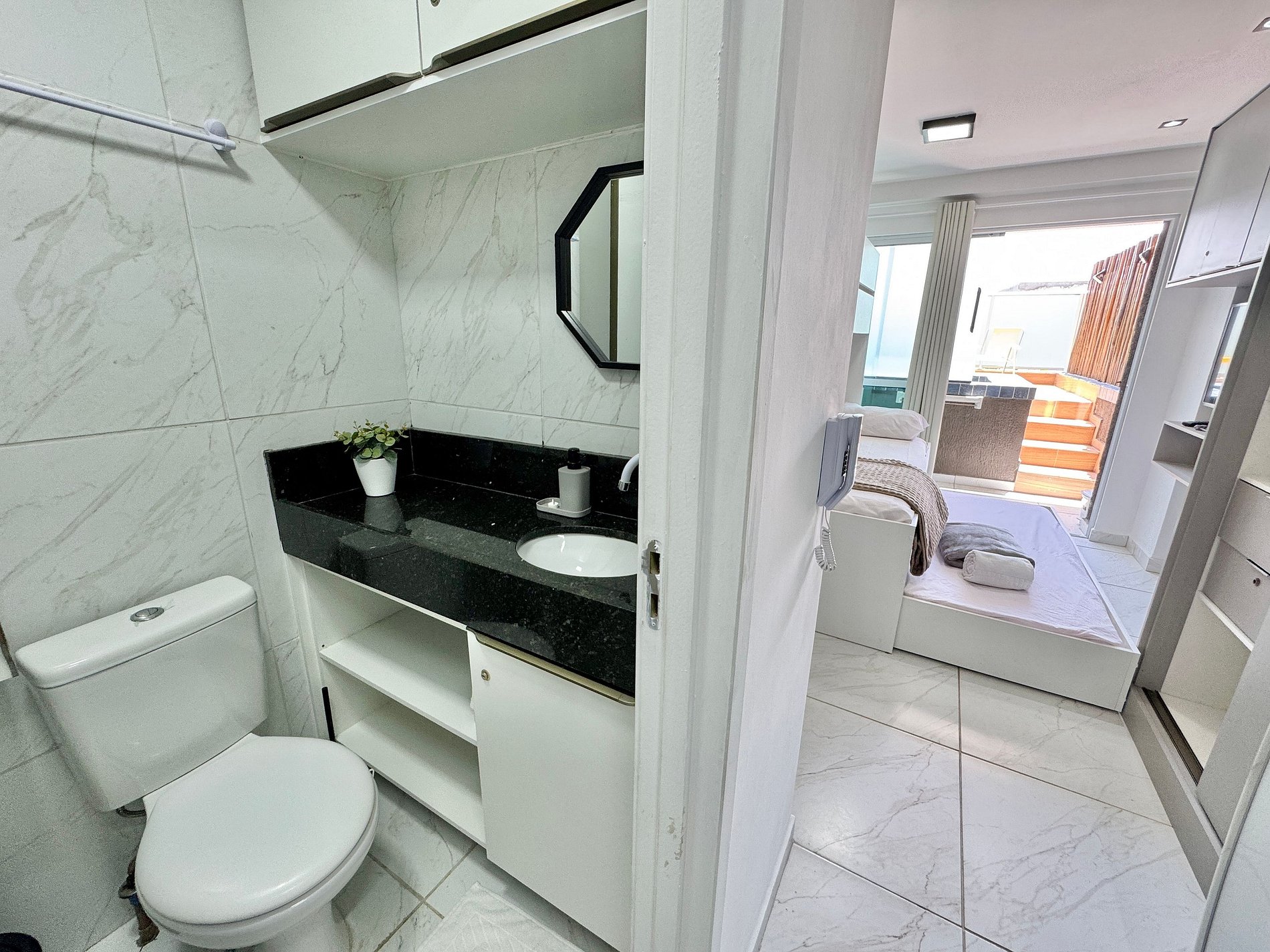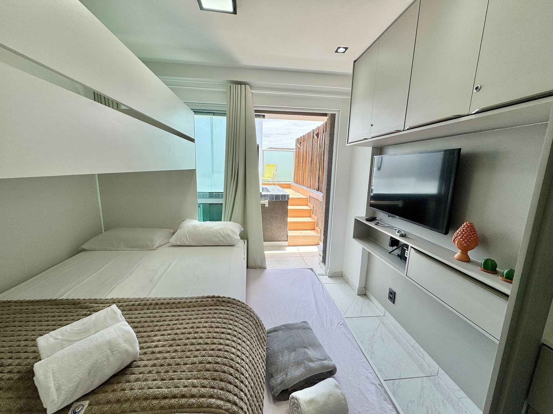 Além disso, o condomínio oferece infraestrutura com piscinas e área de convivência em seu rooftop para você relaxar após um dia de praia.
