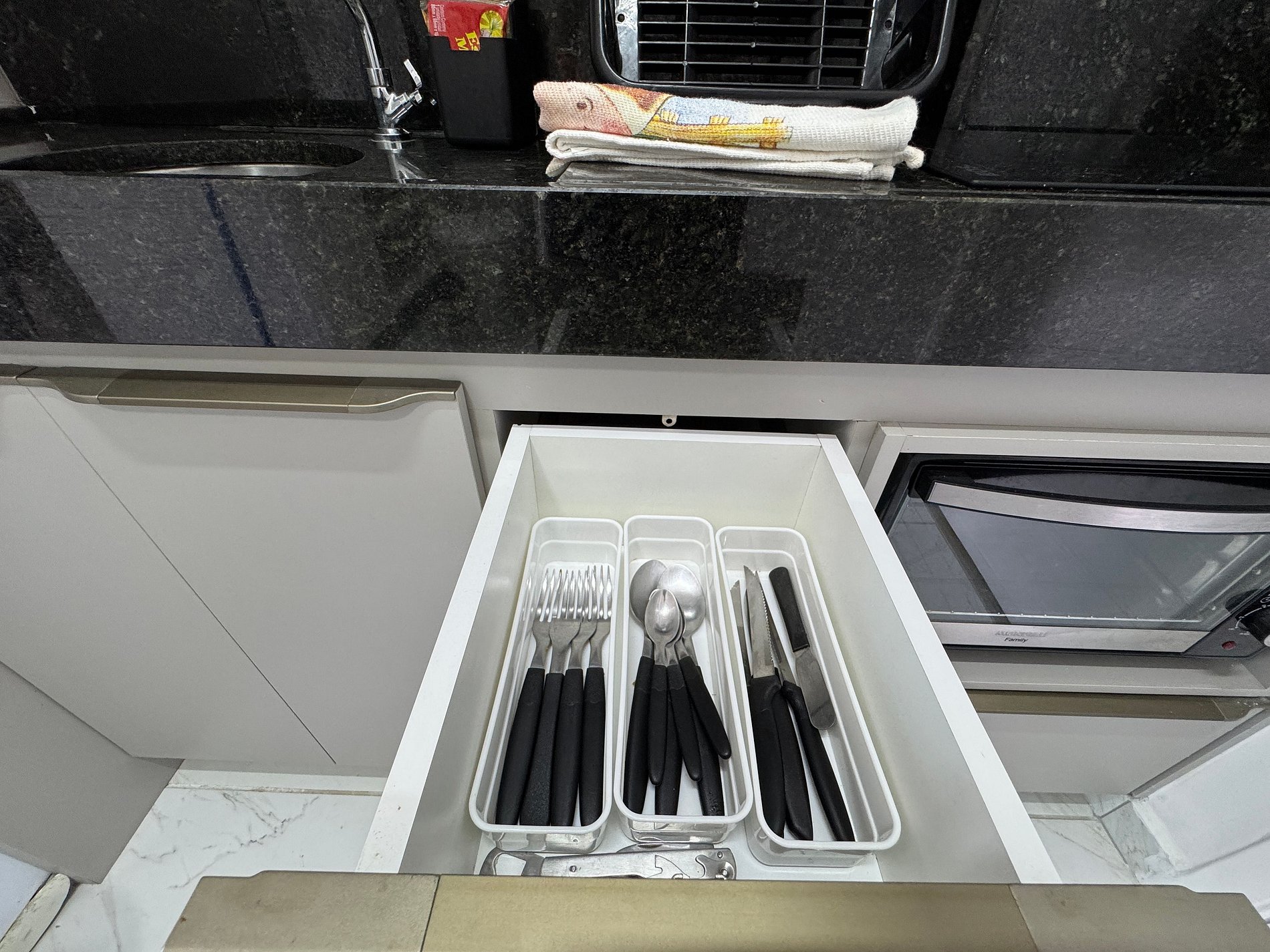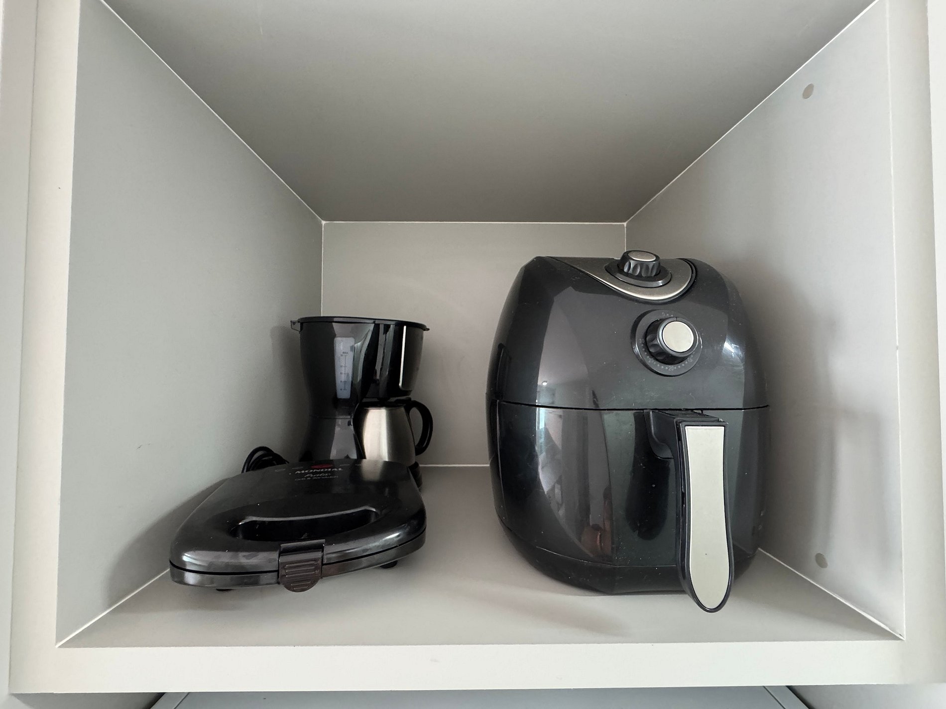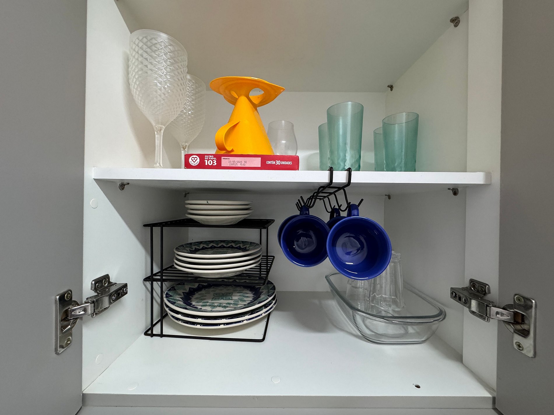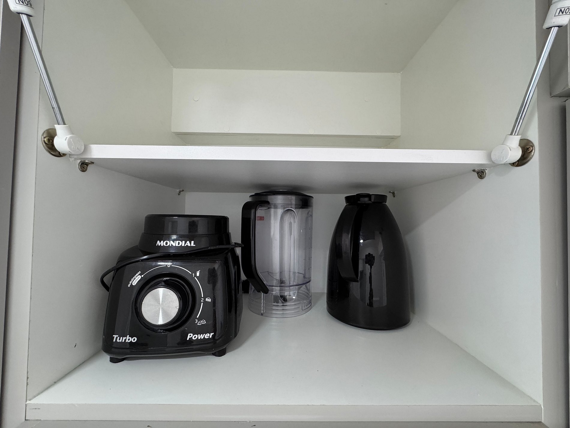 - Cozinha equipada com geladeira, micro-ondas, cooktop elétrico, airfry, cafeteira, sanduicheira, liquidificador e utensílios diversos