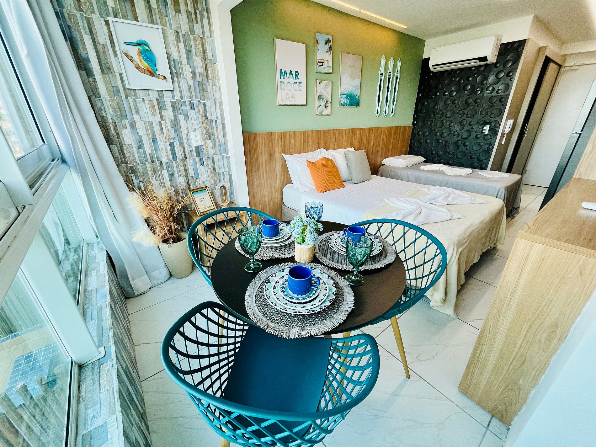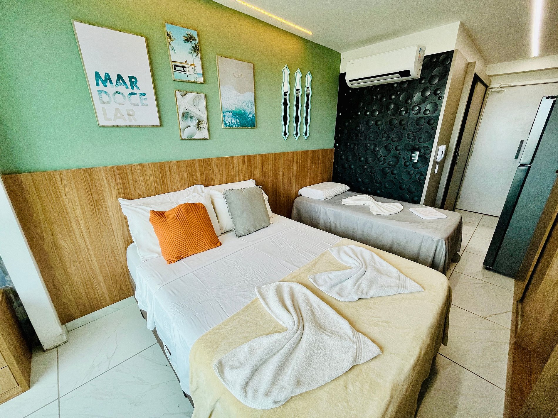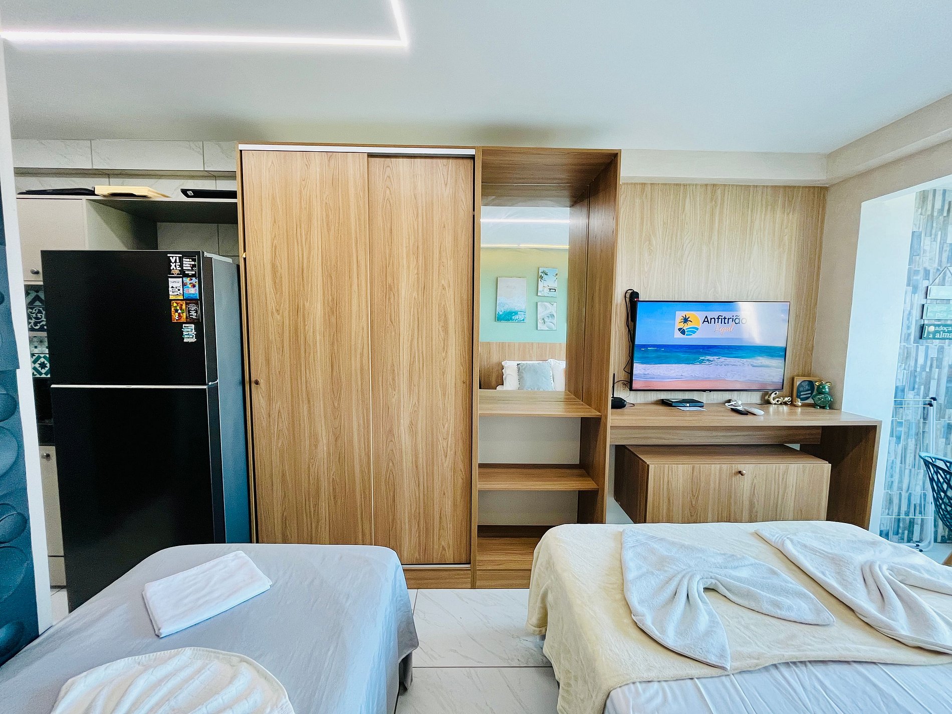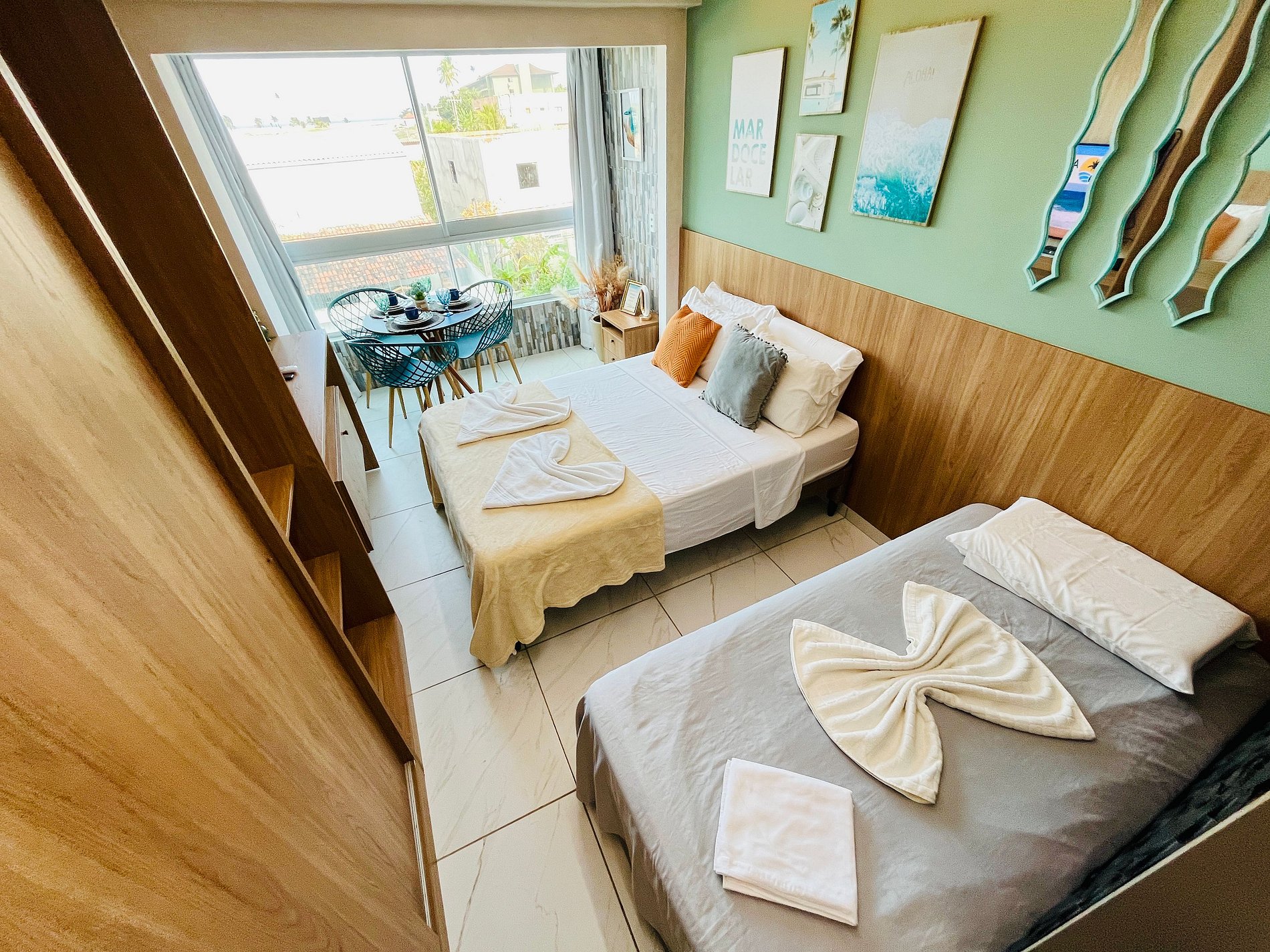 O Flat no condomínio Cupe Garden na praia do Cupe em Porto de Galinhas, conta com Rooftop, 2 experiências de piscinas (borda infinita e water play), lounge, espaço gourmet, estacionamento rotativo, elevador e solarium com vista para o nascer e pôr do sol. O charme fica por conta da piscina com vista para o Mar. Apt tipo estúdio possui beliche com cama de casal e uma solteiro, sala de estar para tomar um belo café da manhã, wc, cozinha compacta, SmarTV, Wifi e enxoval de cama e banho gratuito.