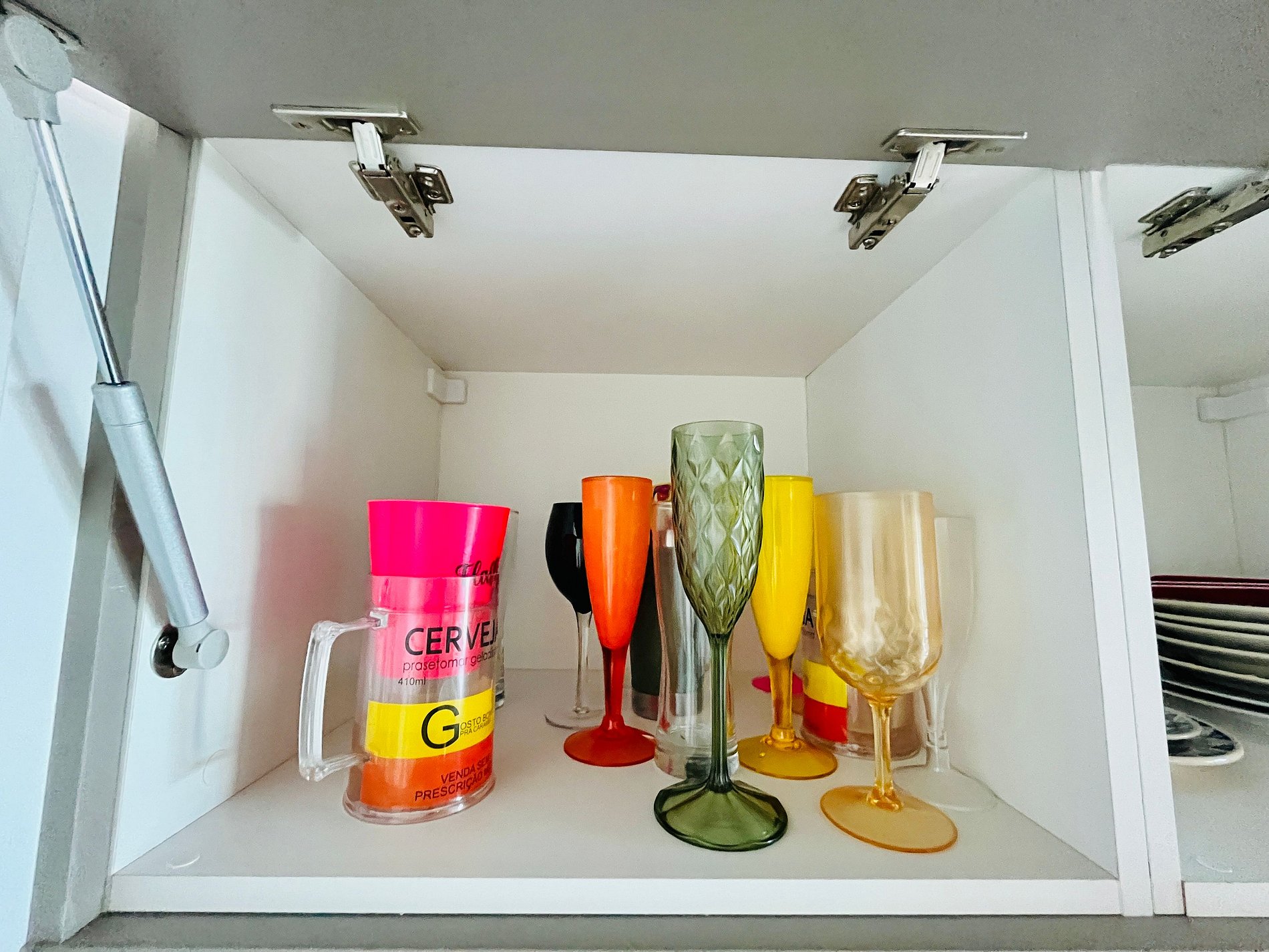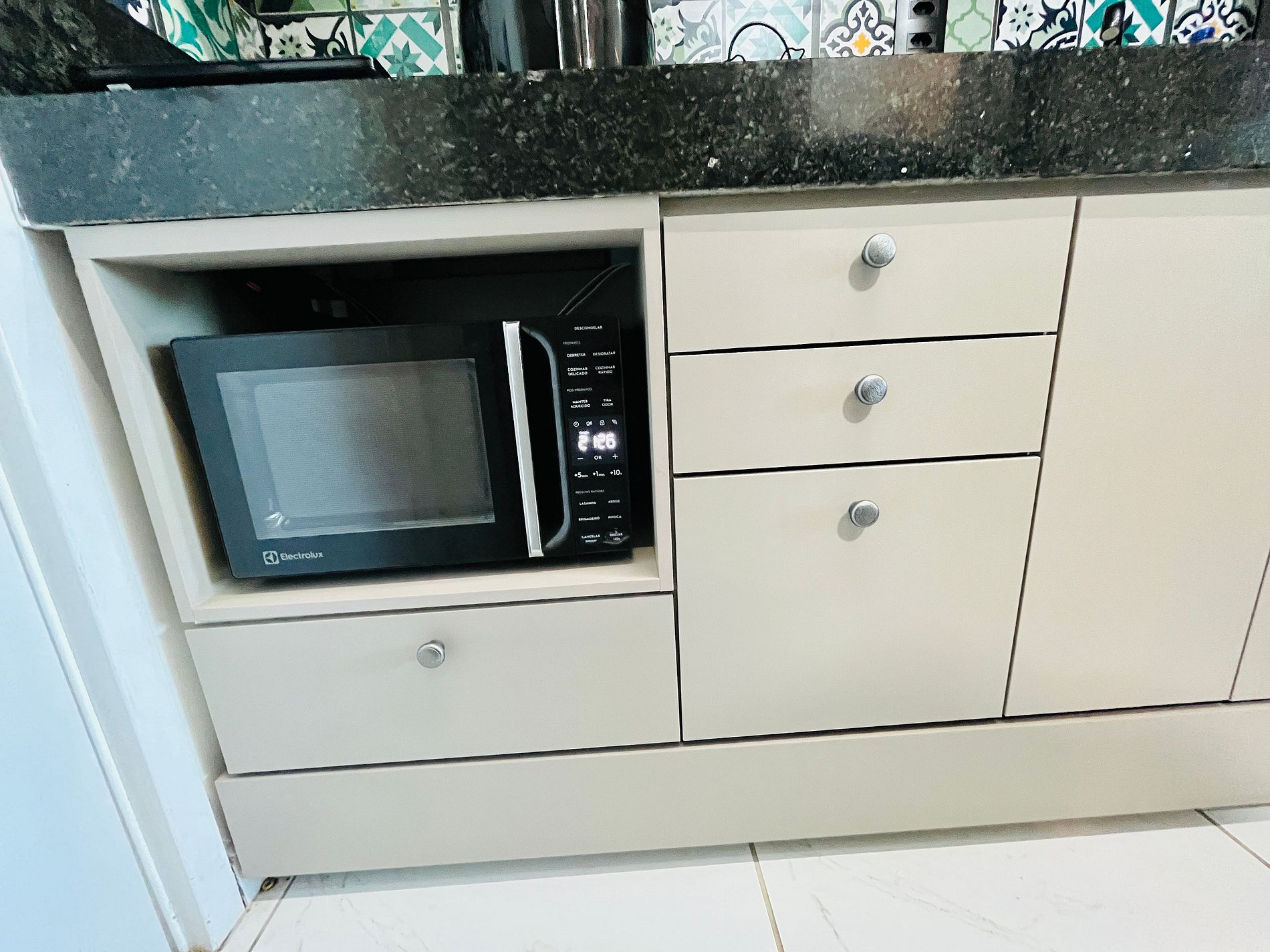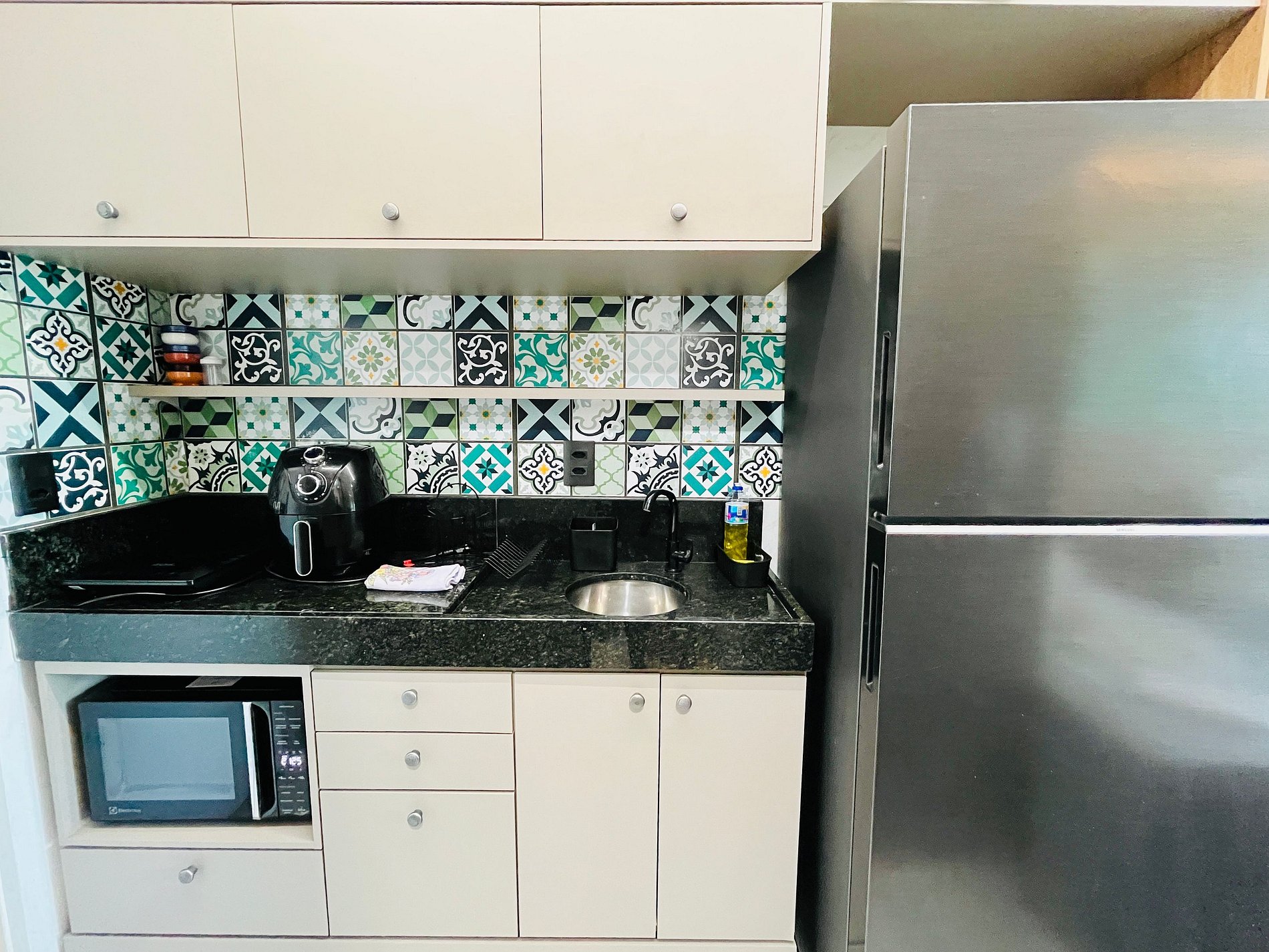 - Cozinha equipada com geladeira, micro-ondas, cooktop elétrico, airfry, sanduicheira, liquidificador e utensílios diversos
