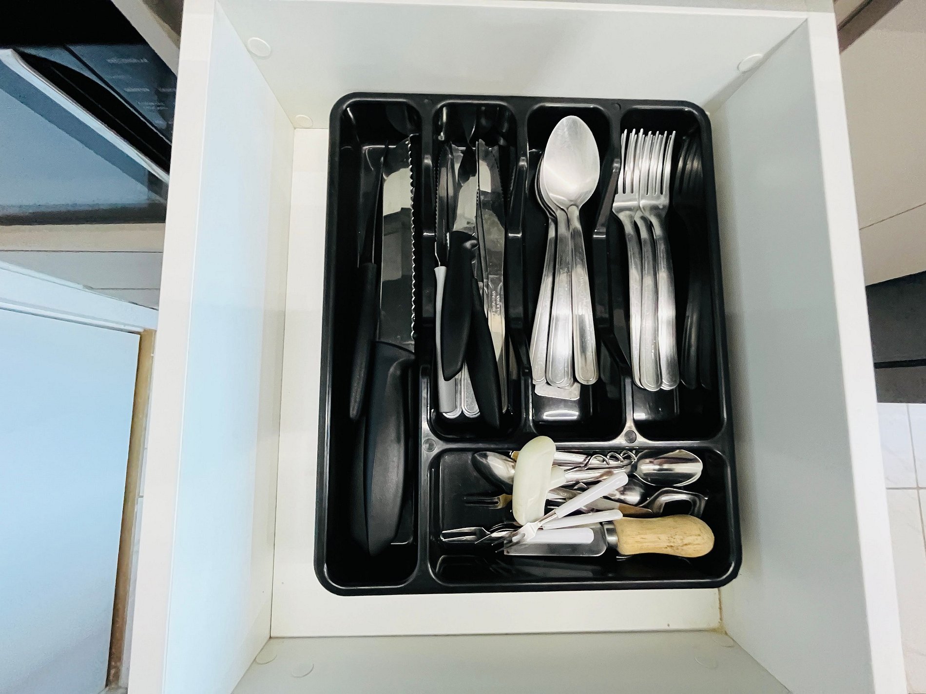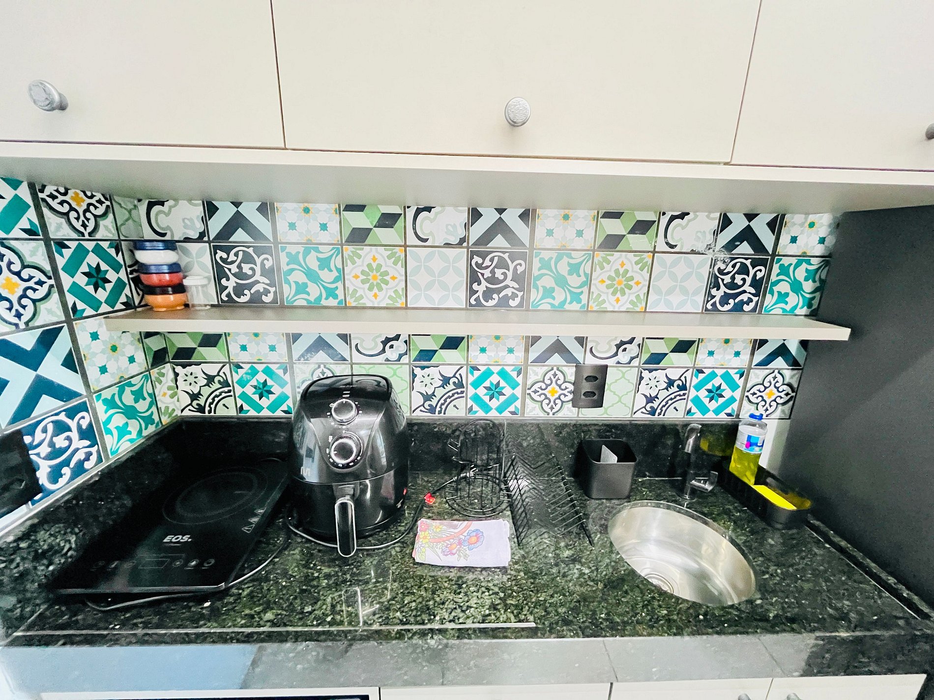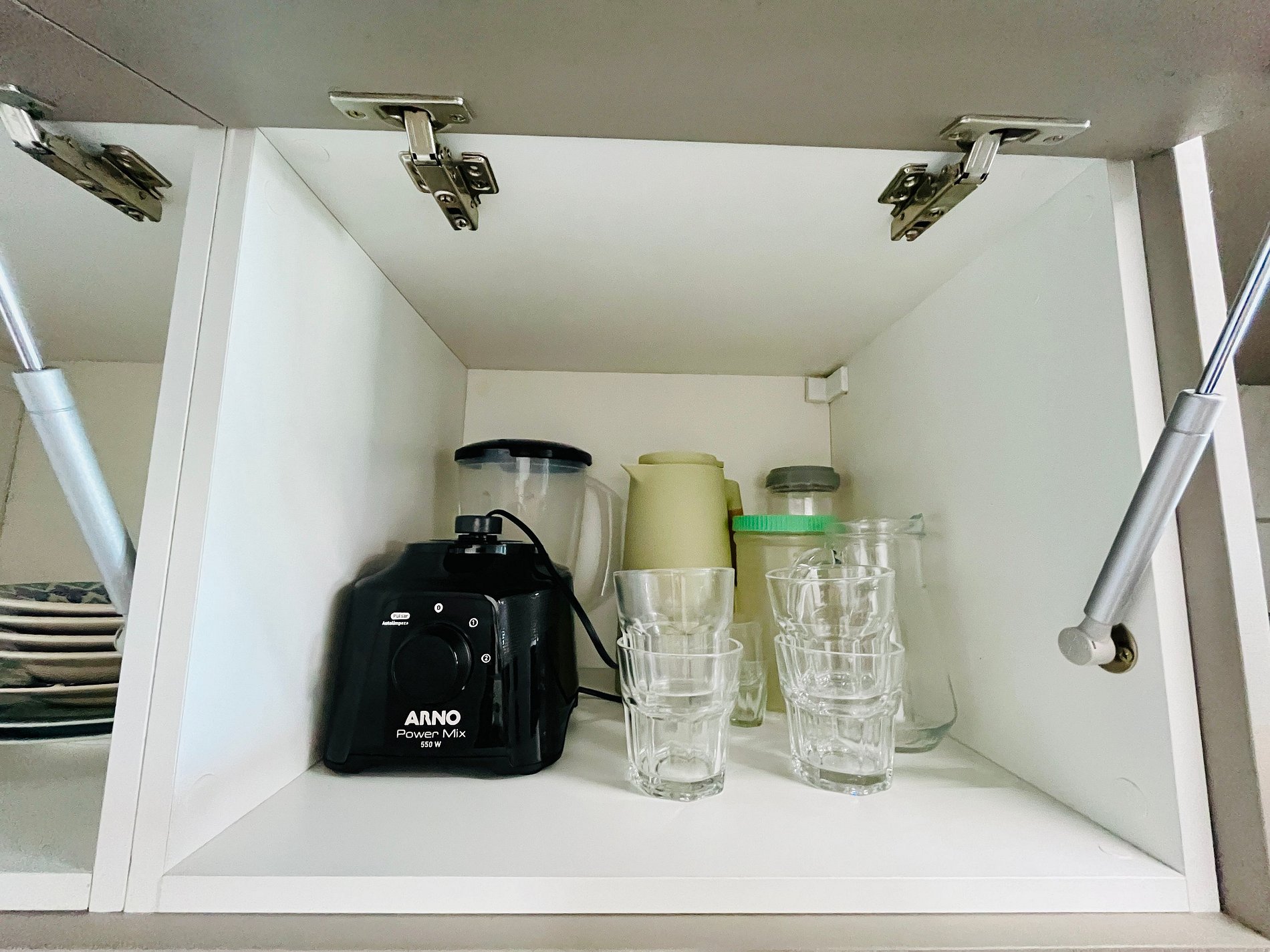 - Cozinha equipada com geladeira, micro-ondas, cooktop elétrico, airfry, sanduicheira, liquidificador e utensílios diversos