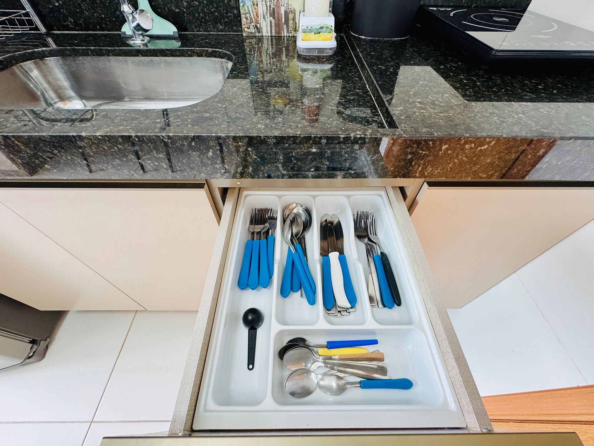 - Cozinha equipada com geladeira, micro-ondas, cooktop elétrico, airfryer, cafeteira, sanduicheira, liquidificador e utensílios diversos