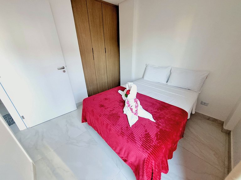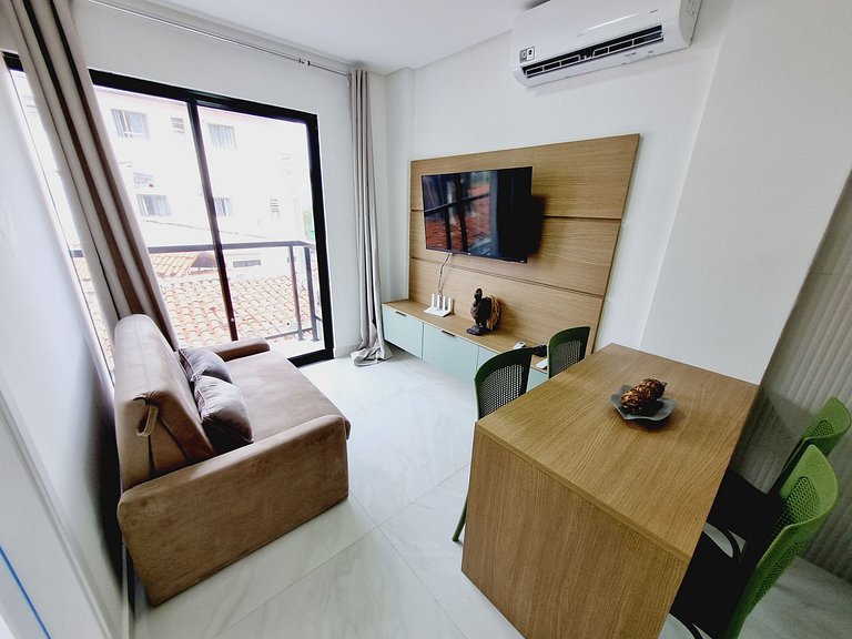 Com localização privilegiada, a apenas 100 metros das famosas piscinas naturais de Porto de Galinhas! Apartamento equipado com ar condicionado split, Wi-Fi, TV, banheiro, mesa para refeições e varanda com vista para a cidade. Perfeito para um casal, mas acomoda confortavelmente até 4 pessoas com uma cama de casal em quarto separado e um sofá-cama na sala.