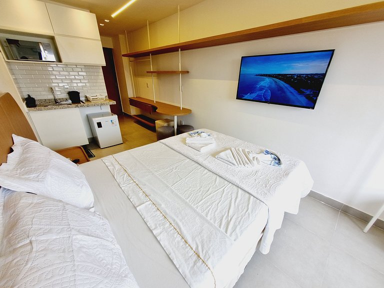 O Flat no condomínio Cupe Exclusive na praia do Cupe em Porto de Galinhas, conta com Rooftop, 2 experiências de piscinas (borda infinita e water play), espaço gourmet, estacionamento, elevador e solarium com vista para o nascer e pôr do sol. O charme fica por conta da piscina com vista para o Mar. Apt tipo estúdio possui cama de casal e um sofá cama para duas pessoas, banheiro, cozinha compacta, SmarTV, Wifi e enxoval de cama e banho gratuito.
