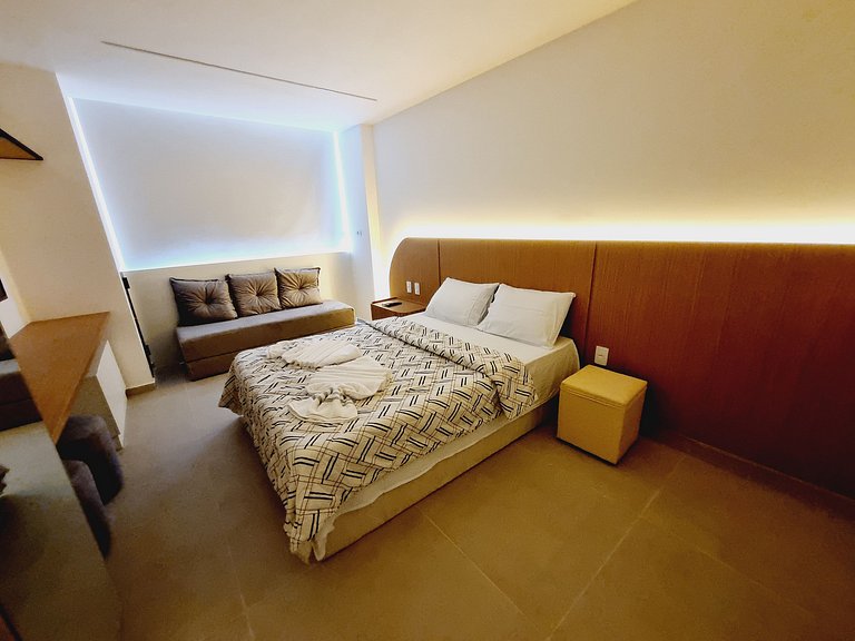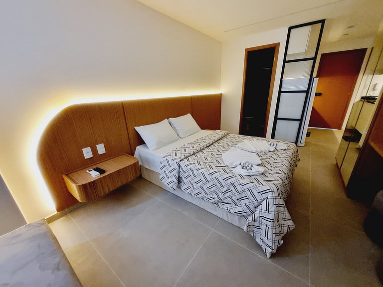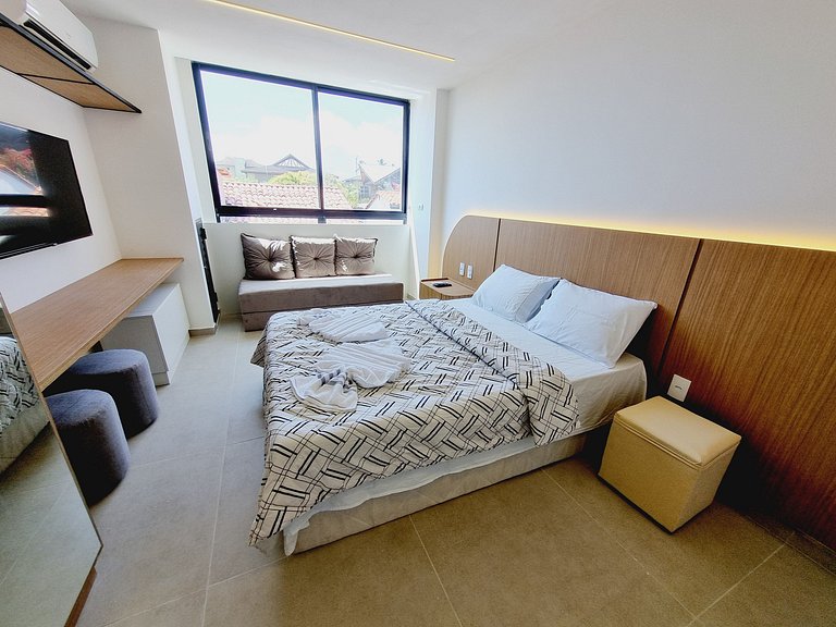 O Flat no condomínio Reserva do Cupe na praia do Cupe em Porto de Galinhas, conta com Rooftop, 2 experiências de piscinas (borda infinita e water play), espaço gourmet, estacionamento, elevador e solarium com vista para o nascer e pôr do sol. O charme fica por conta da piscina com vista para o Mar. Apt tipo estúdio possui cama de casal e um sofá cama de casal embaixo, banheiro, cozinha compacta, SmarTV, Wifi e enxoval gratuito.