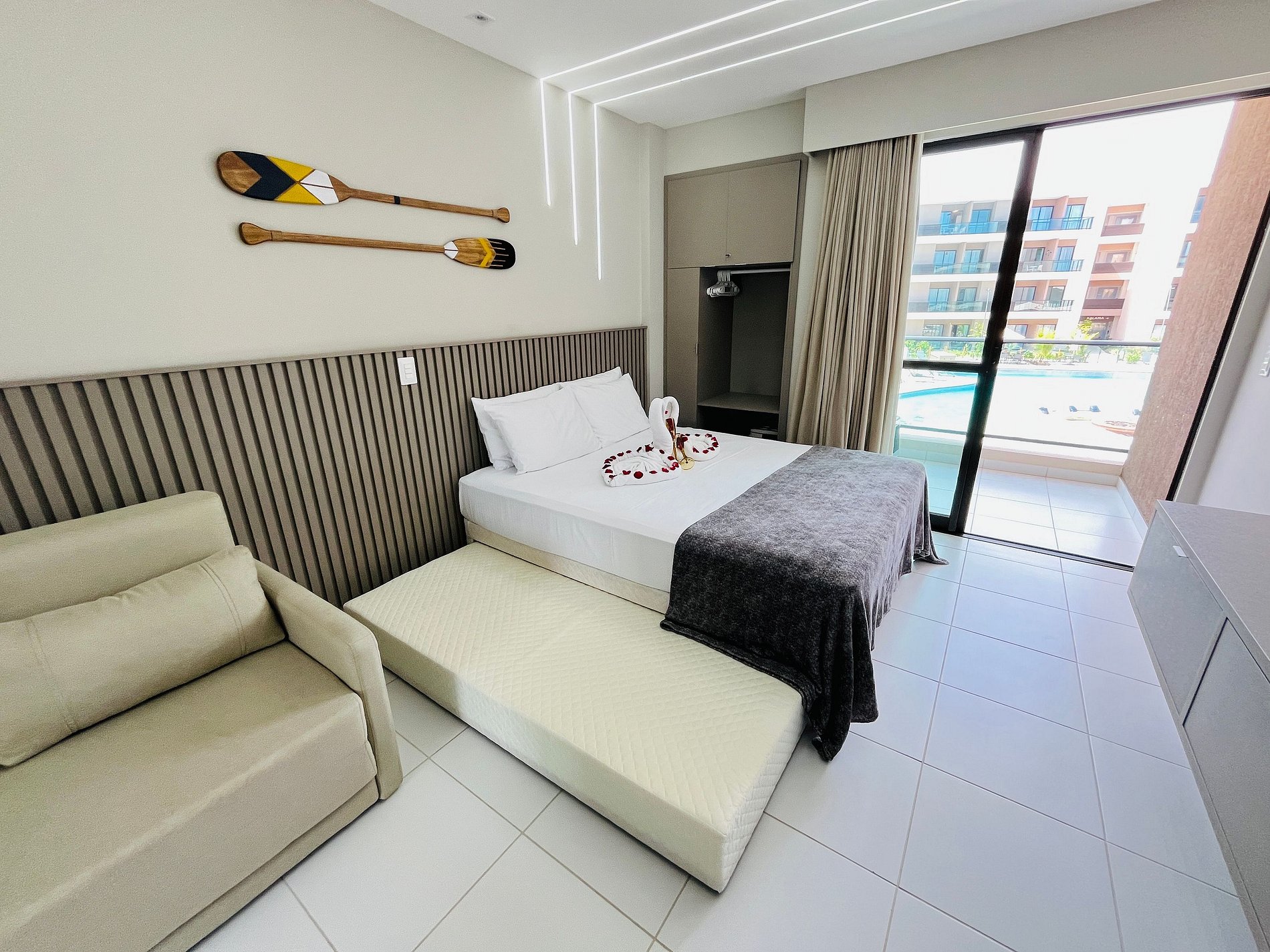 Flat moderno a 300m da praia e perto das piscinas naturais. Acomoda até 5 pessoas, com cama de casal com bicama e sofá-cama de casal. Equipado com Wi-Fi, Smart TV, ar-condicionado e cozinha completa. O condomínio estilo resort oferece piscinas, restaurante, loja de conveniência, rooftop, academia, brinquedoteca, coworking, churrasqueira e estacionamento gratuito (1 vaga). Conforto e lazer garantidos para sua estadia!