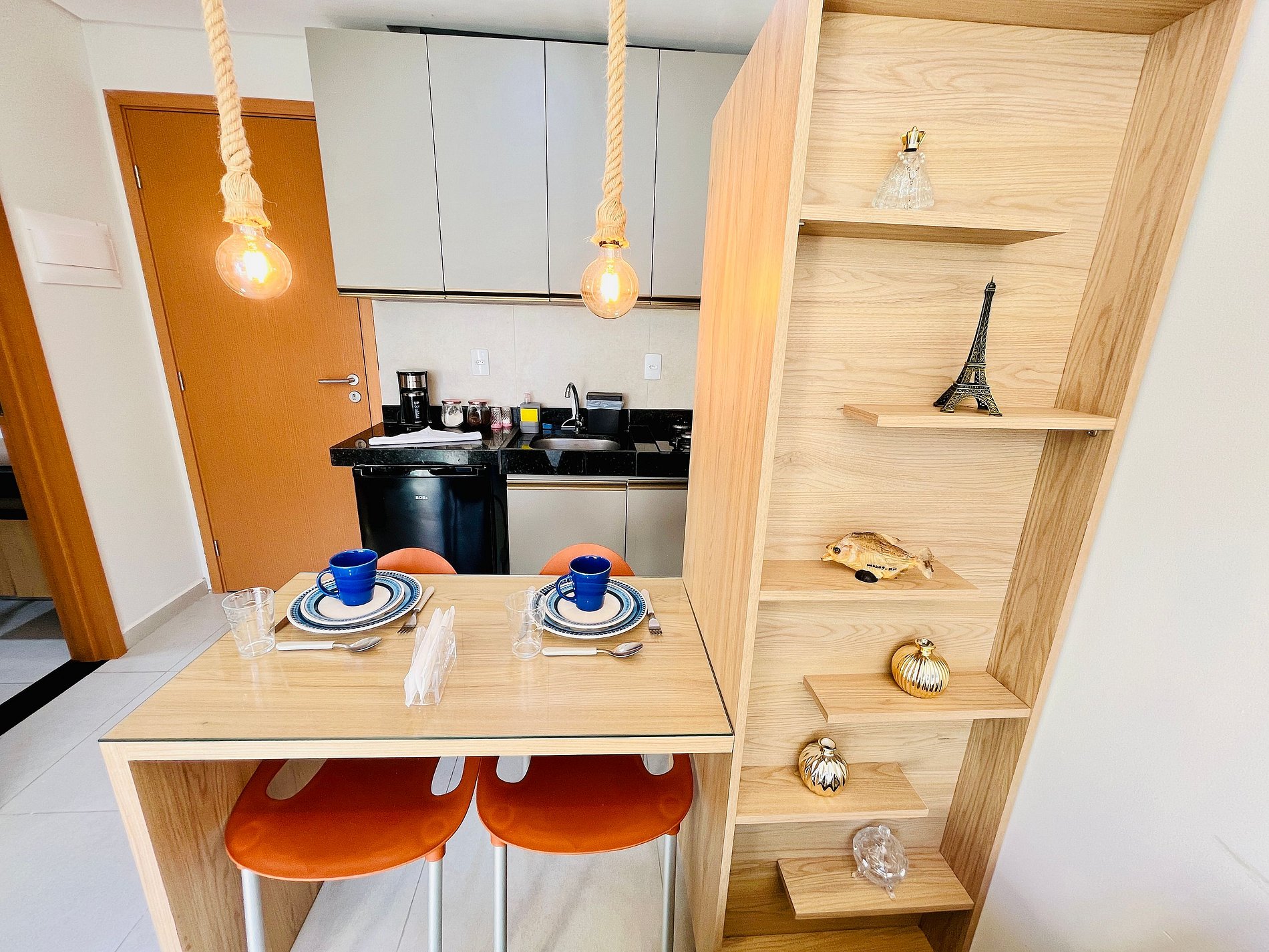 O apartamento é totalmente mobiliado e planejado para proporcionar conforto e funcionalidade durante sua estadia.